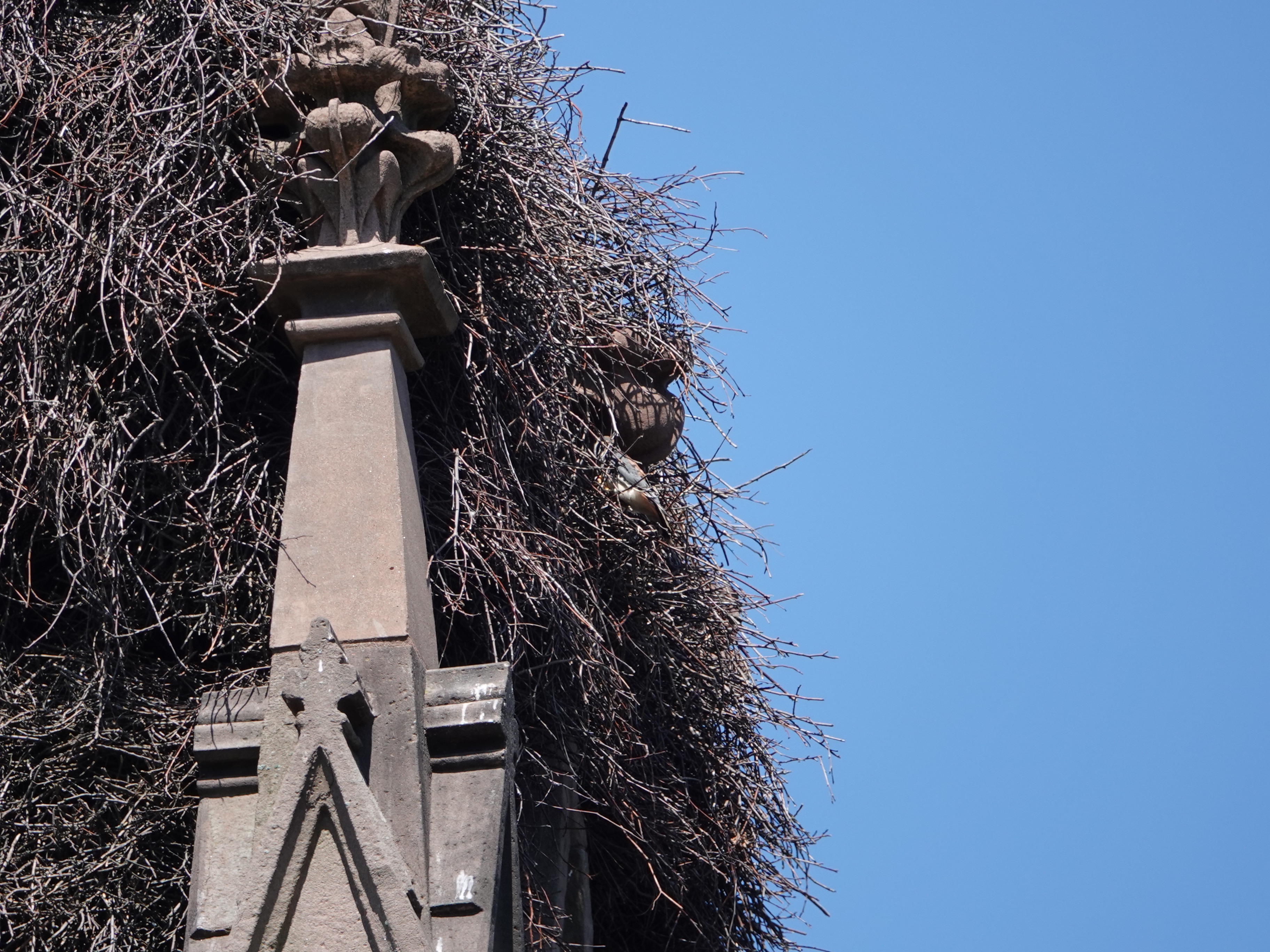 Middle of the day. Parakeets yelling their heads off, as they are wont to do most of the time but particularly when there’s a threat about. The parakeets remained unseen during this time, so presumably they were hollering from inside what I presume is a multiple cavity nest/colony.