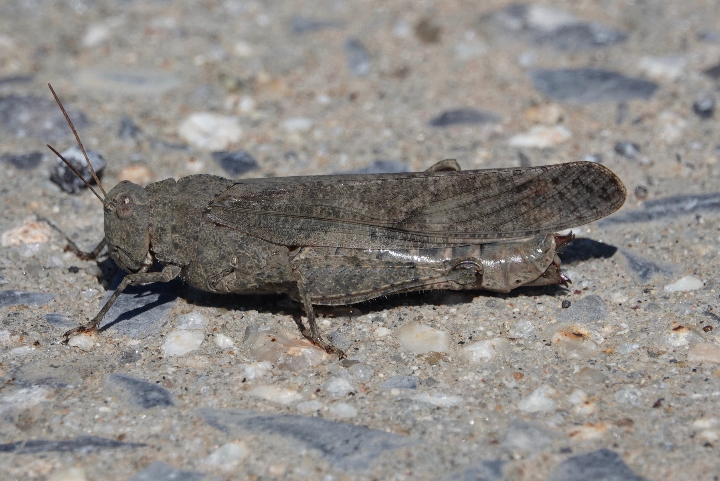 The big Carolina Grasshopper (Dissosteira carolina) is a good concrete-mimic, until it leaps and its butterfly-like wings spread.