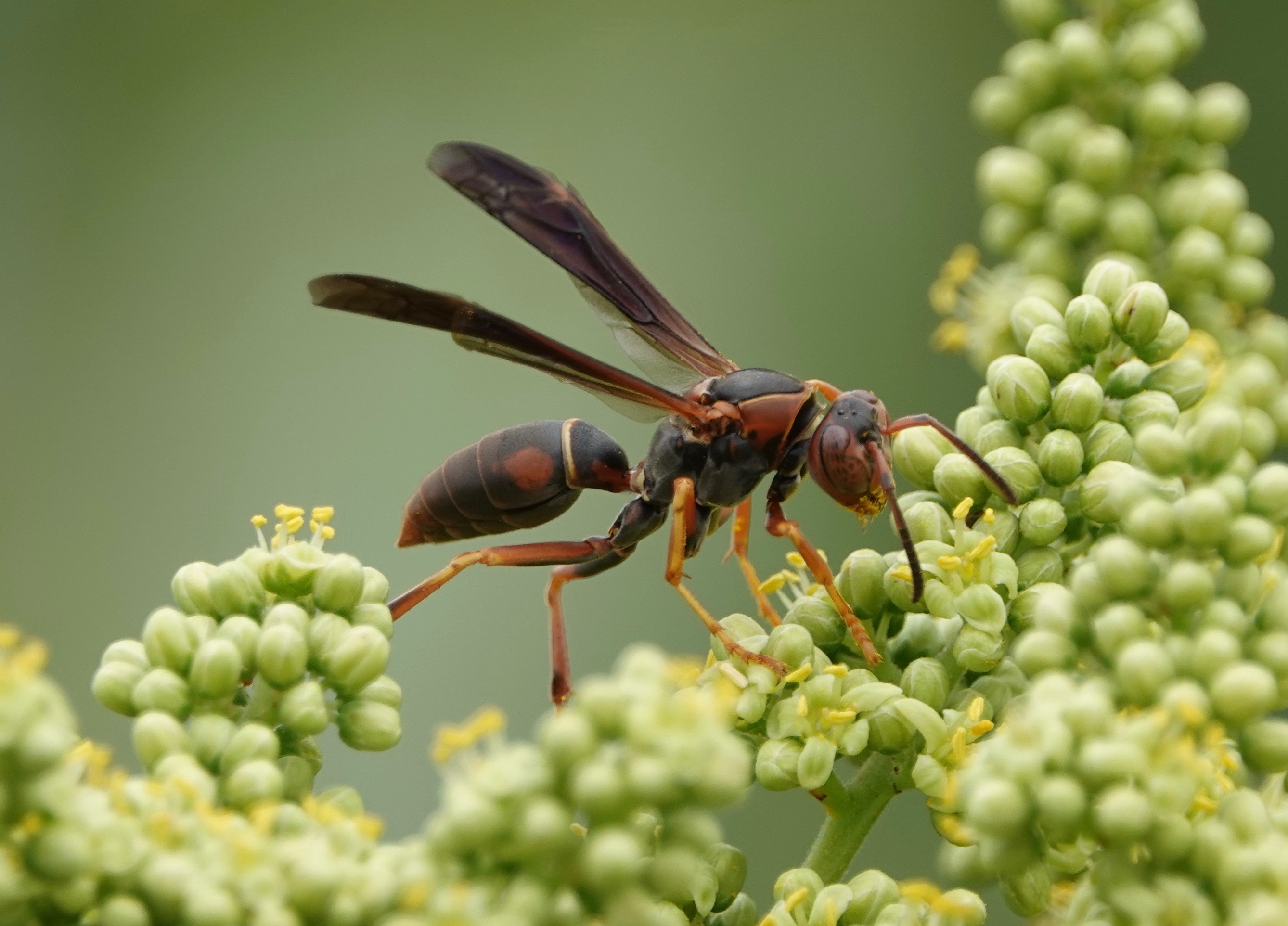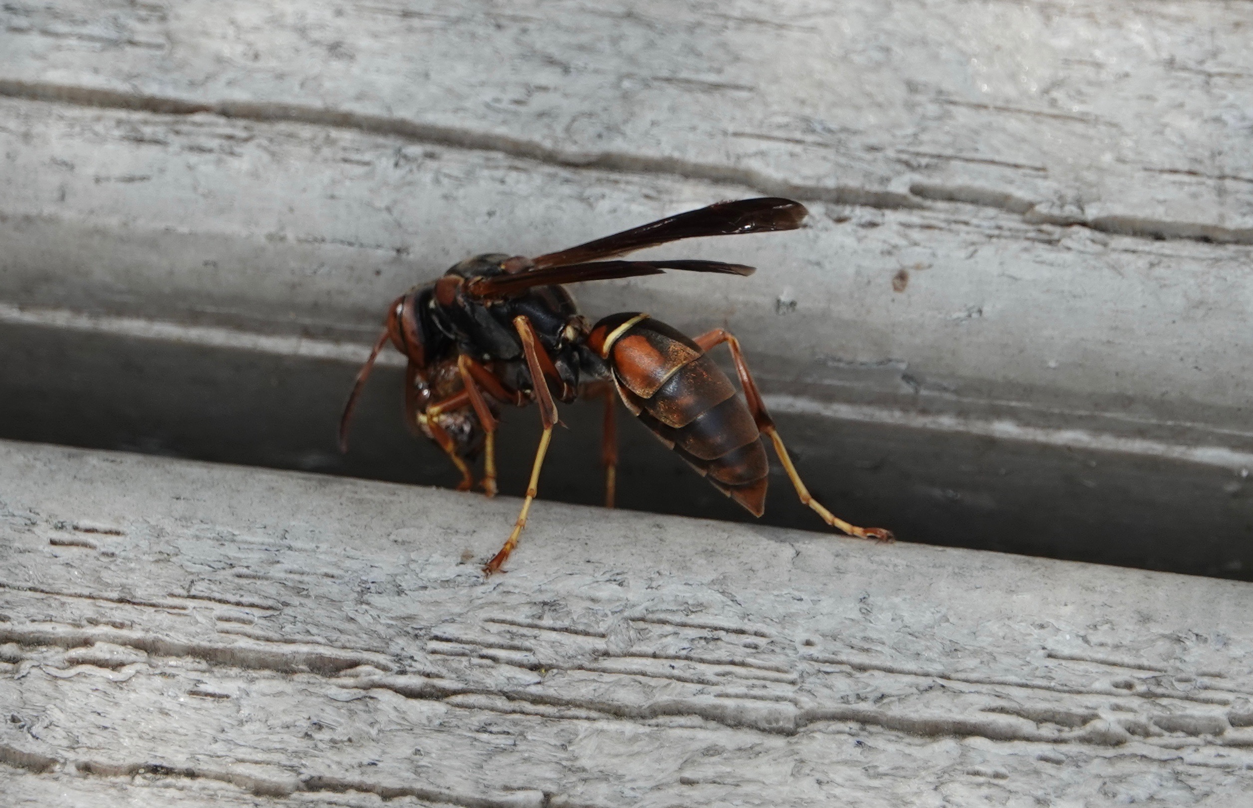 There are… a number species of paper wasps in the Polistes genus in the northeast; 11 by one count, 21 by another, I assume it’s a matter of the range of the “northeast”. Anyway, this maybe P. fuscatus, the Northern or Dark Paper Wasp. Says Bugguide.net: “the separation of P. fuscatus from related species remains the greatest taxonomic problem of the northeastern Vespidae fauna.” Interestingly, the very yellow and black European Paper Wasp (P. dominula), which is all over NYC, is also in this genus.
