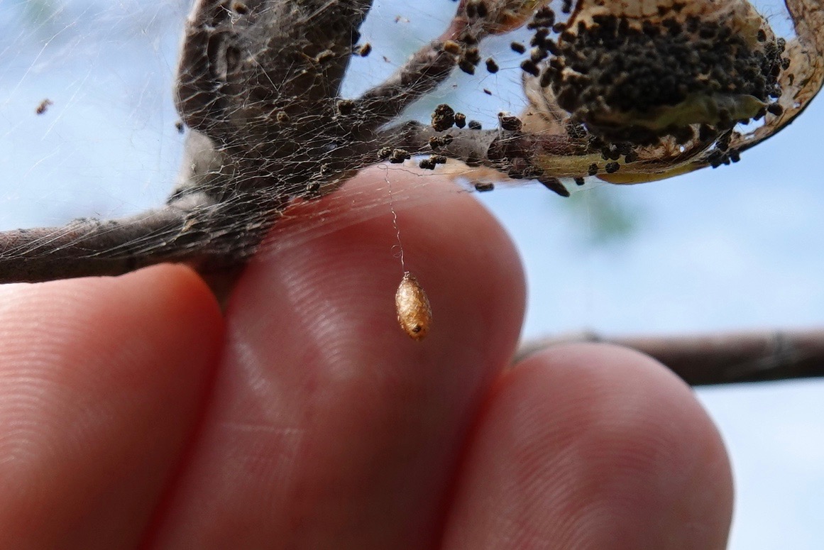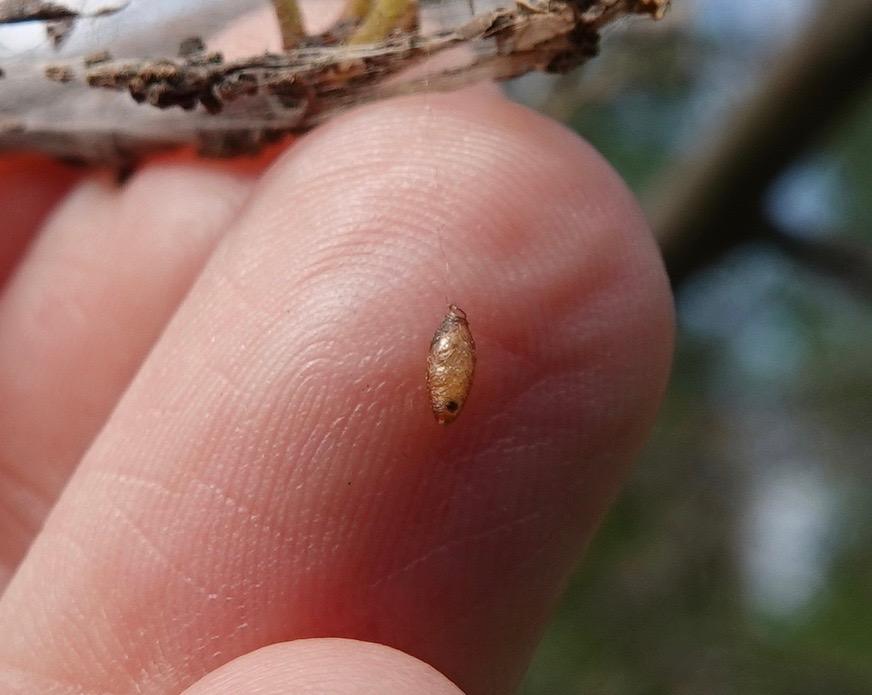 Here’s more. These are cocoons of a Meteorus genus wasp. They hang from rather crinkly silk under the webworm nests. Both look like they have exit holes at the base. According to Eisemen and Charney, if the exit whole is irregular and on the side, it’s the work of another wasp who parasitizes the parasite.