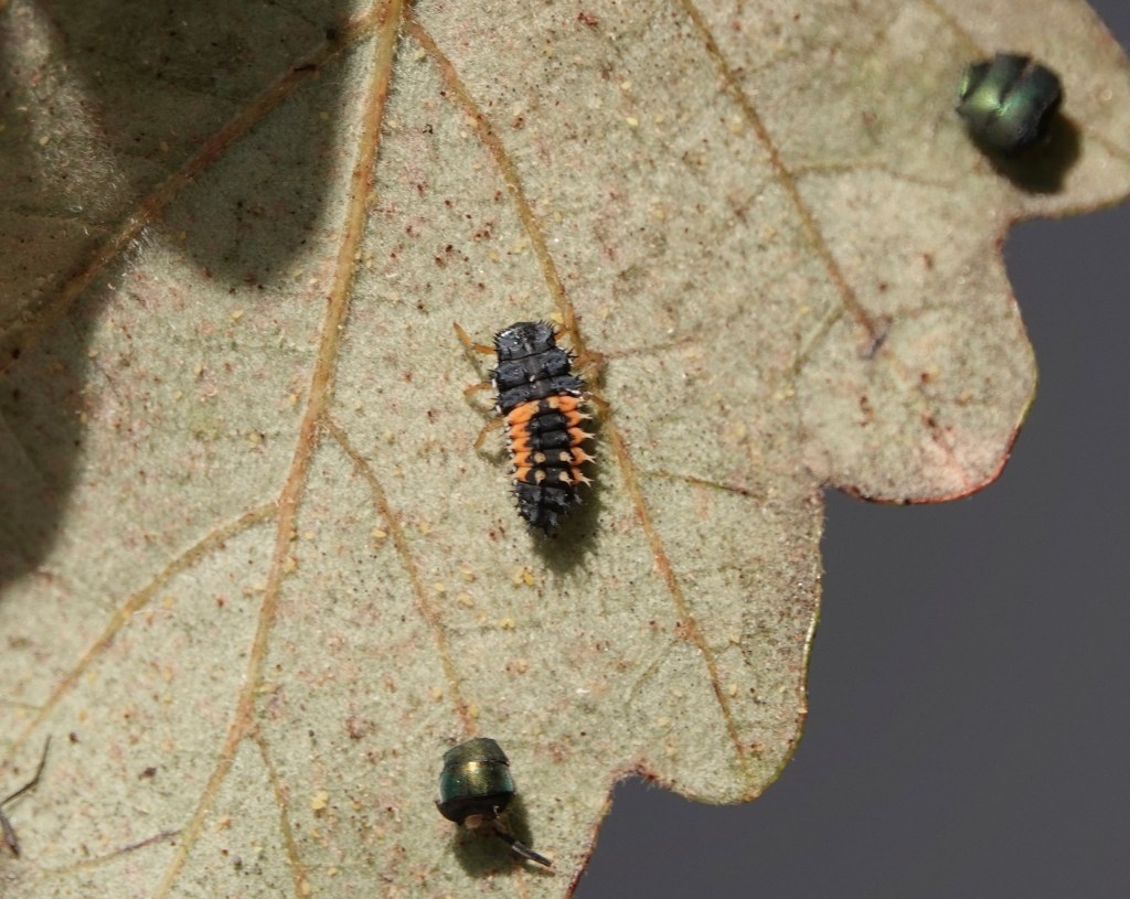 Let’s look a little closer. This tree was jumping. The larvae and pupae of Asian Ladybugs were all over it. Hm, but what about those pieces of fly?