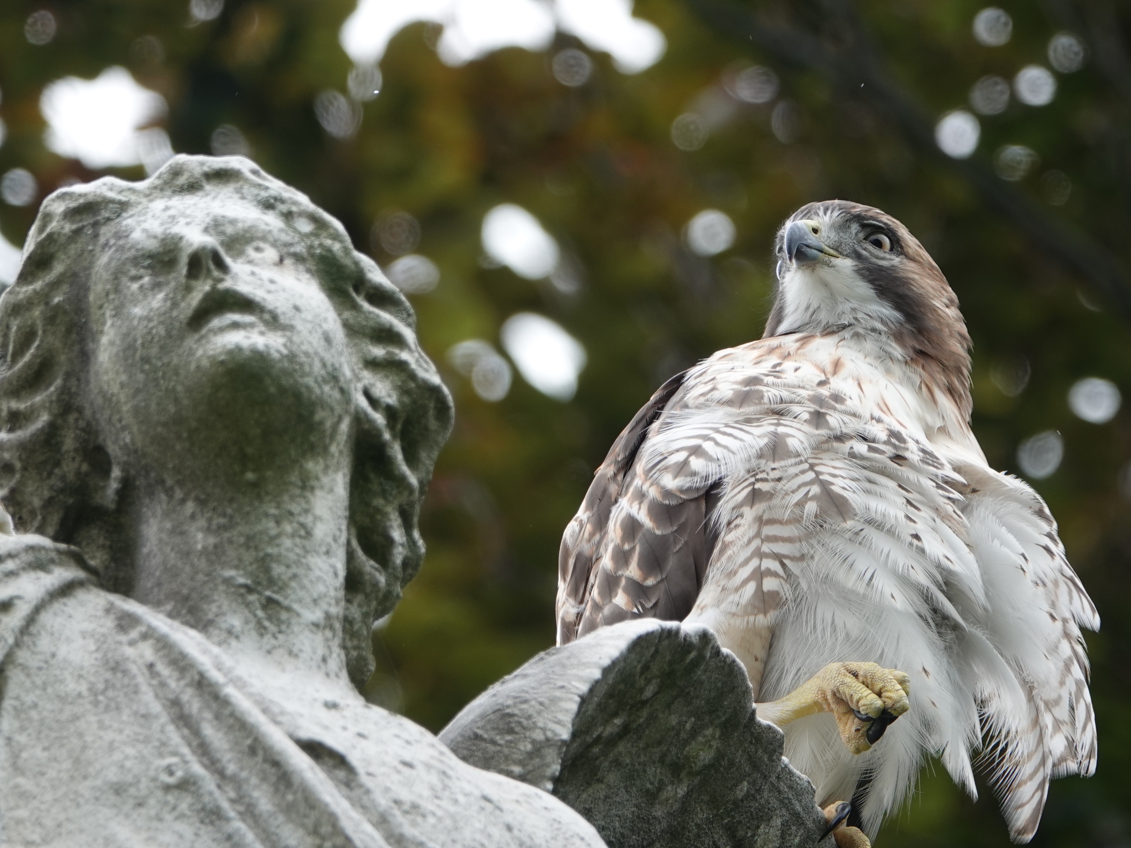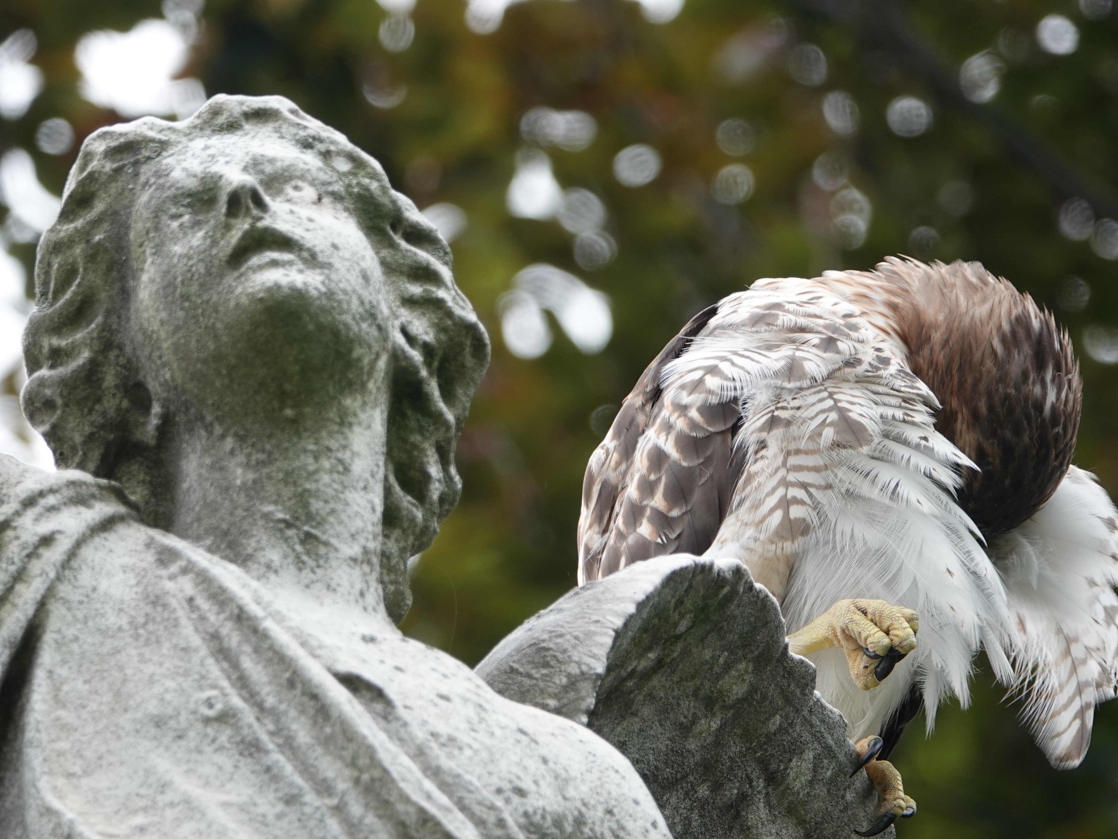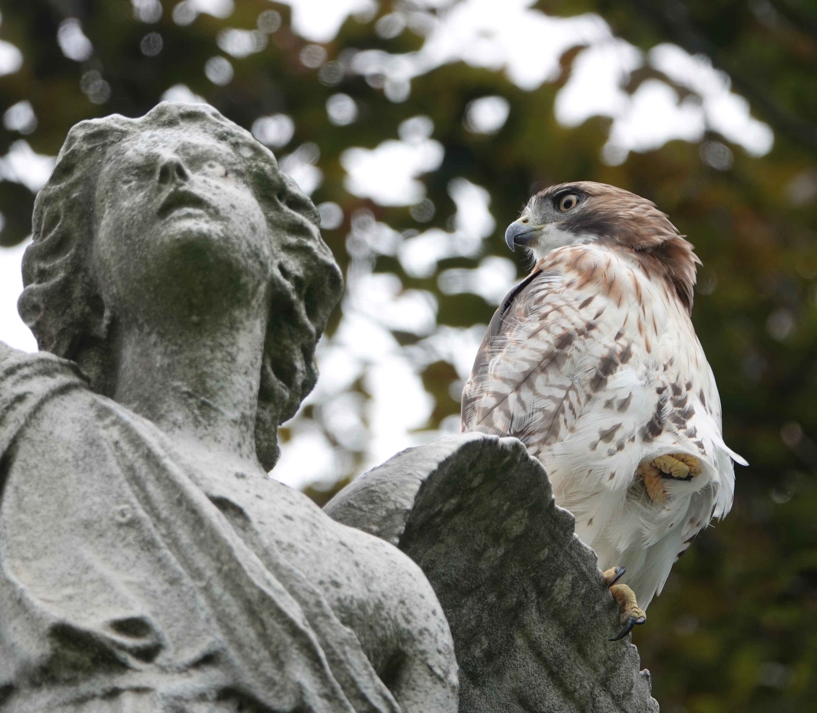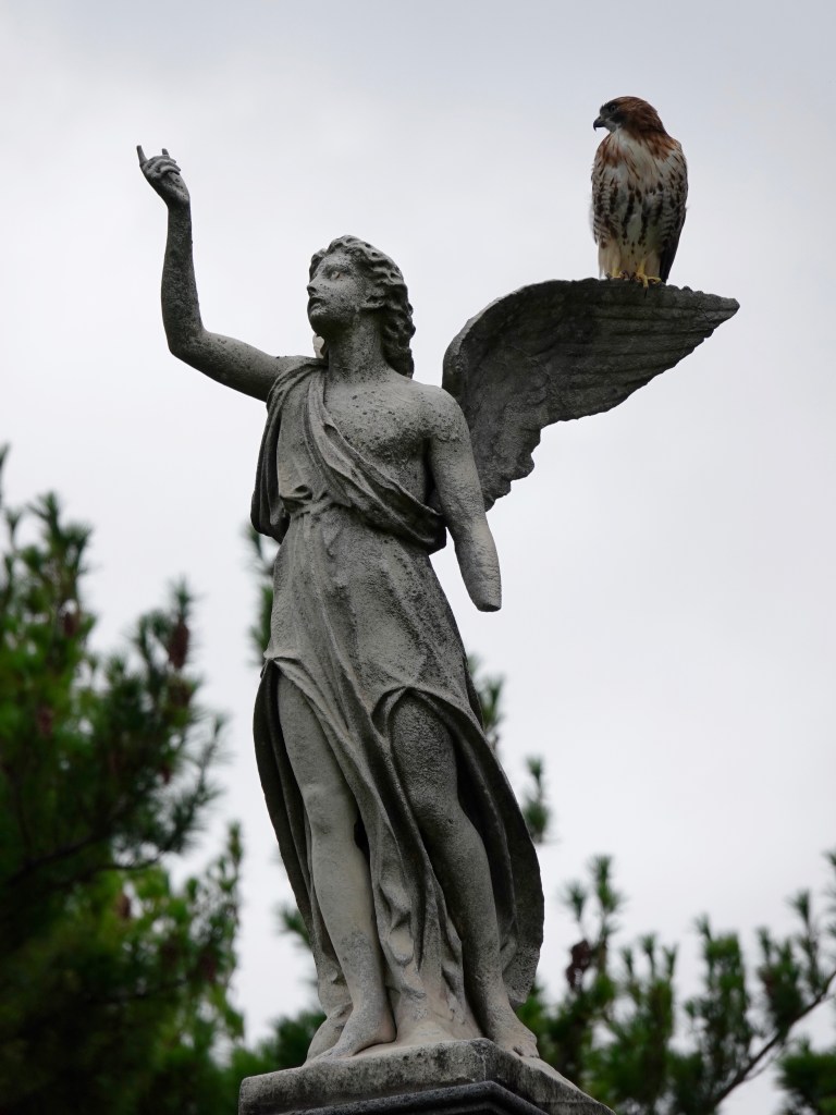 Yes, it does seem like it’s right out of central casting… but the hawks do perch on the monuments, statues, and mausoleums all the time. I have to say the one that got away from me some years ago was an American Kestrel perched on another funereal angel. The angel was pointing upwards, as they are wont to do, and The little falcon was on the upraised finger! But it flew before I even had my camera raised.