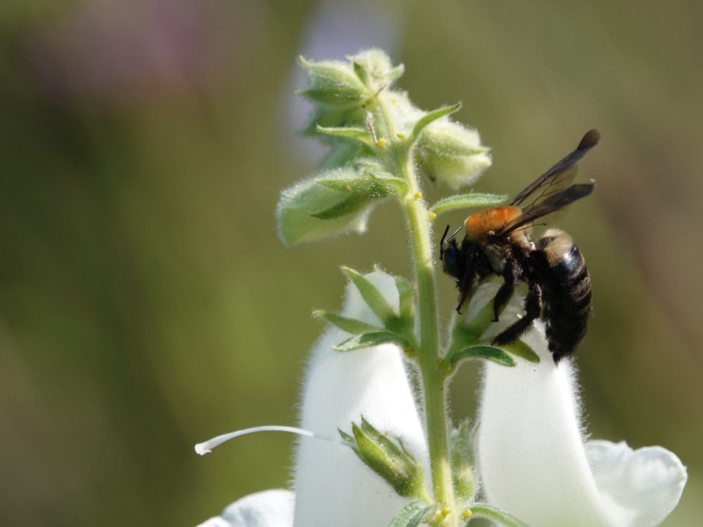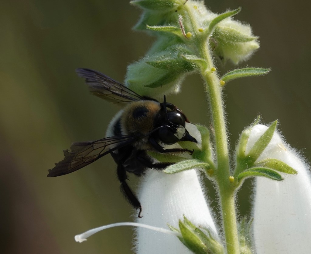 Eastern Carpenter Bees “robbing” nectaries. Instead of crawling up into the tubular flowers and getting smeared with pollen, these two are cutting directly to the chase.