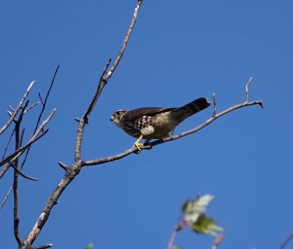 The lush meadow rising above the chapel has attracted sparrows and warblers, which means the bird-hunting falcons, too. Bother Merlins and American Kestrels having been perching on this scaffolding and on surrounding trees. Not at the same time: they will chase each off.