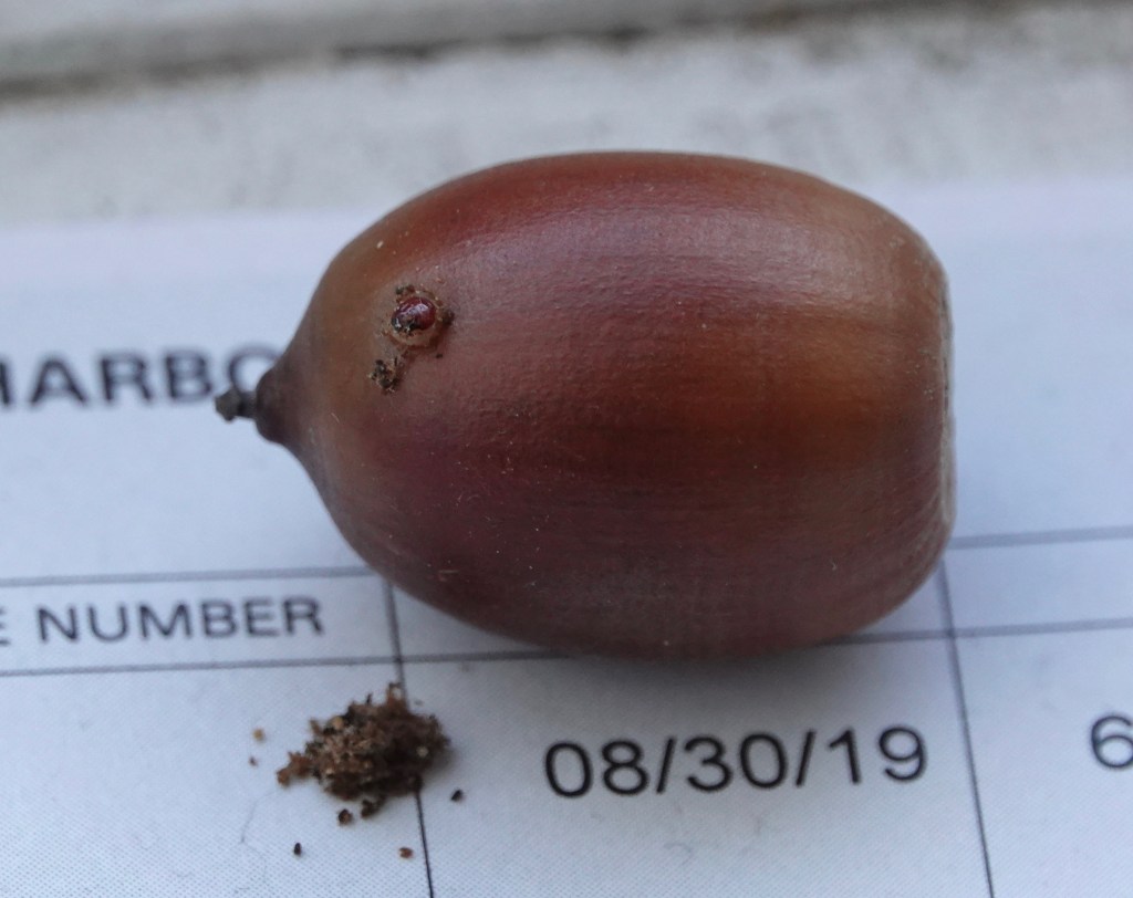 Not pictured, but this also happened with a shingle oak acorn, which has a much smaller nut than the red. The exit hole hole was correspondingly smaller, so perhaps the work of another species.