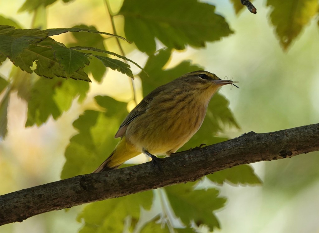 Palm Warblers are most commonly on the ground, but this one has snagged something insect-y on a tree limb.