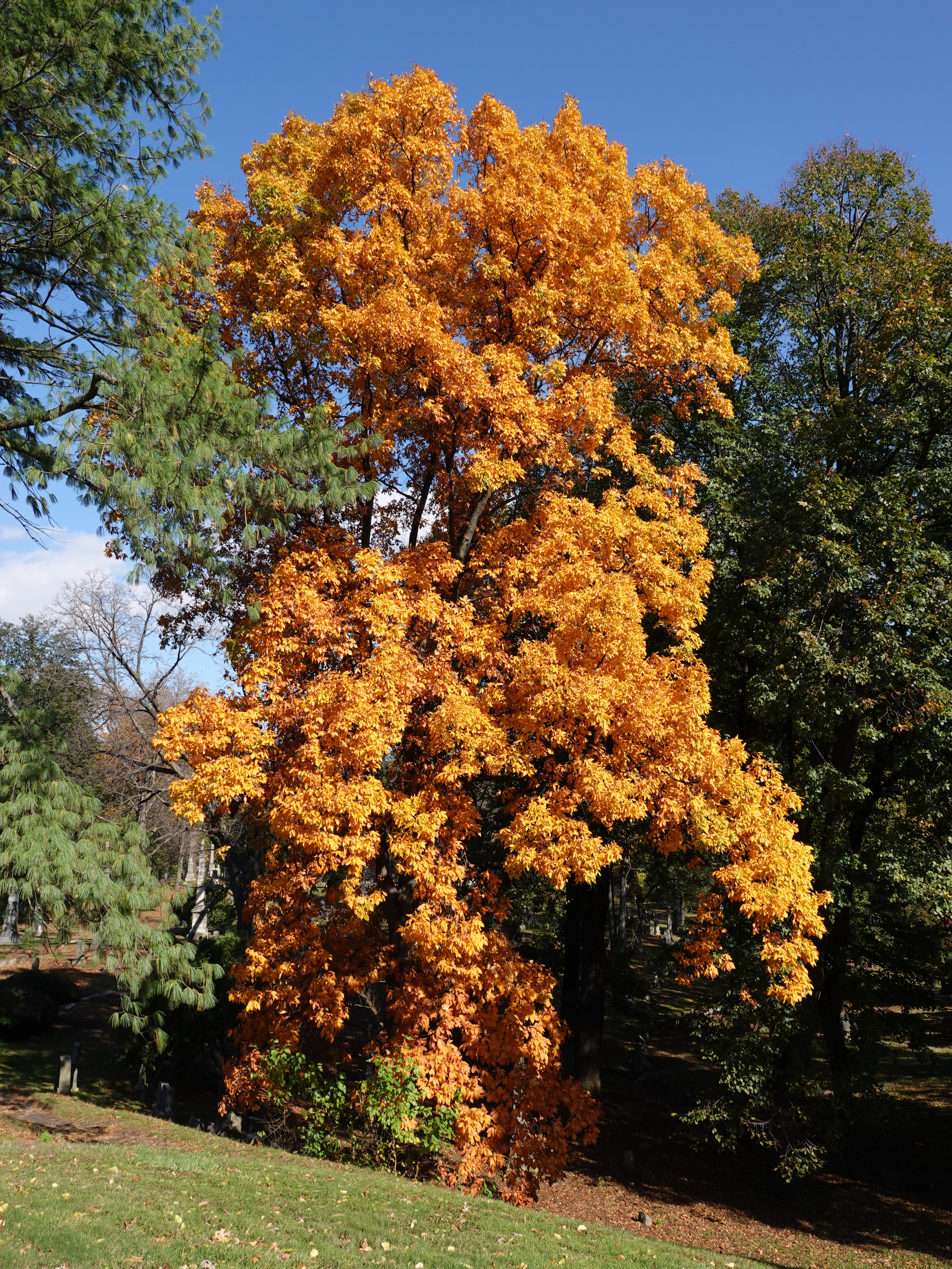 This was actually yellower to my eyes than this orange-ish reproduction via the camera, but either way it sure jumped out at me — from outside the cemetery, actually.