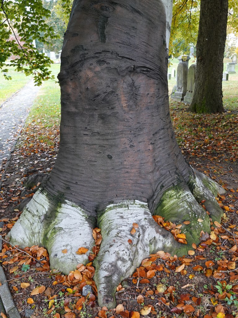 Pictured: a weeping variety of Fagus sylvantica, the European beech, highly favored as an ornamental on these shores. Next to this weeper is a stand-up tall one, and the nuts and husks it has piled on the path. The foot of another below. All in Green-Wood, local kingdom of the the threatened beech.
