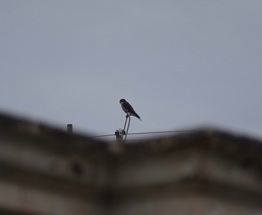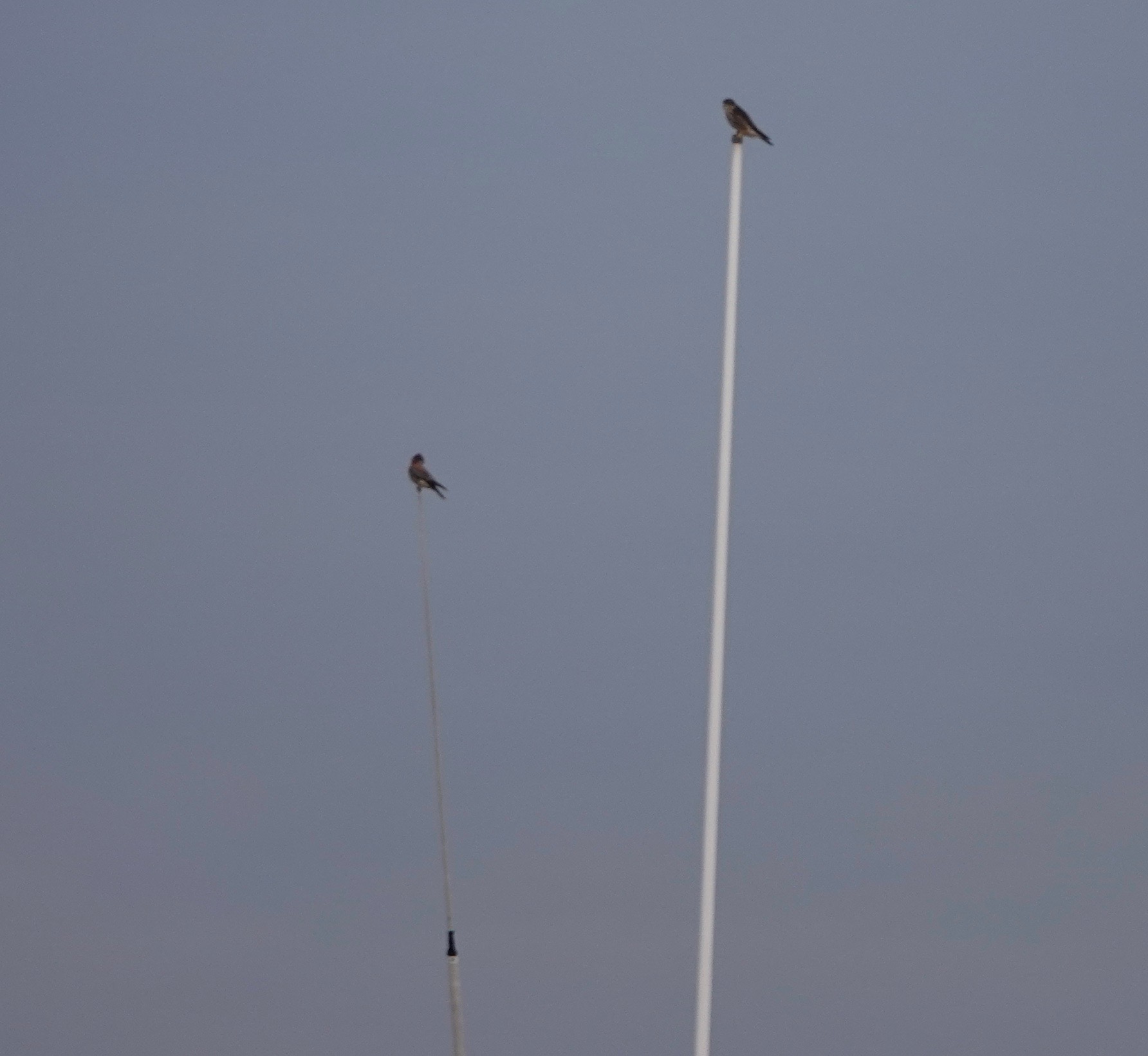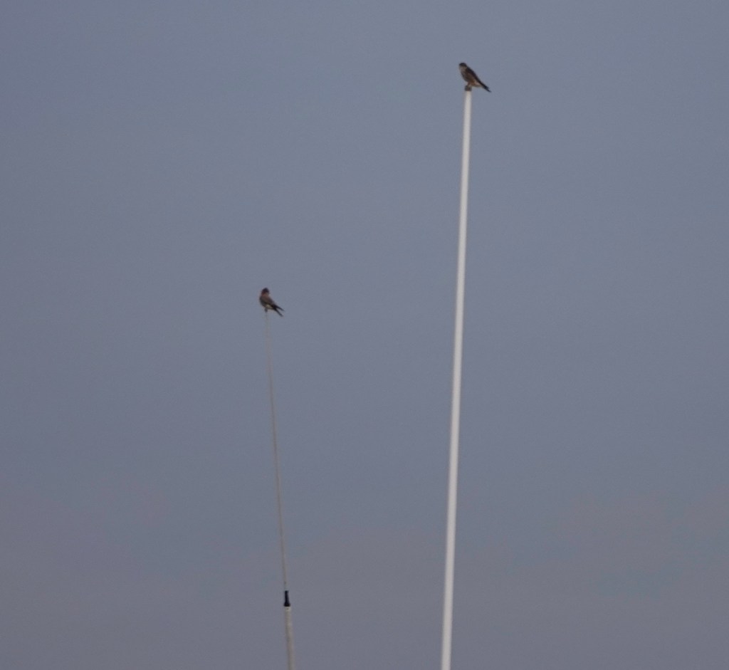 This is a photo from the apartment. The male Kestrel on the left, the Merlin on the right. The Kestrel was on the taller perch first, flew down when the Merlin showed up. Merlins are slightly bigger than Kestrels, with sexual dimorphism. Also, the left-hand antenna is not parallel with the main one, it’s angled away from us.