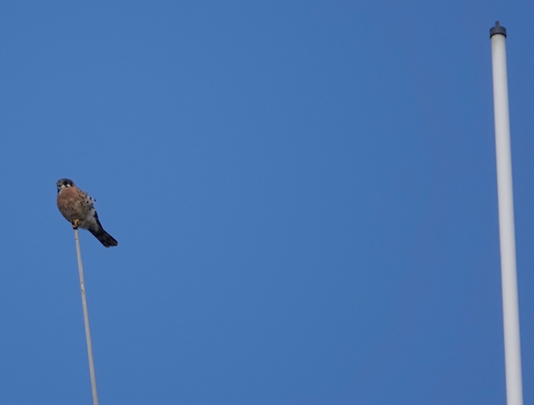 A male American Kestrel has been spotted almost daily (sometimes more than once per day) on the car service antenna (one avenue block by one street block away). This male is very russet-breasted but rather lightly marked with spots. (Photo from street-level.)