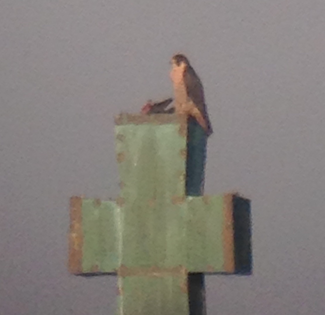 then again Monday morning, a Peregrine (F. peregrinus) was atop St. Michael’s eating what looked like pigeon. (This butcher’s block, the highest perch for blocks, is two avenue blocks and one street block away from our apartment, approximately 500 meters/1640 feet, so these through-the-scope views leave much to be desired.)