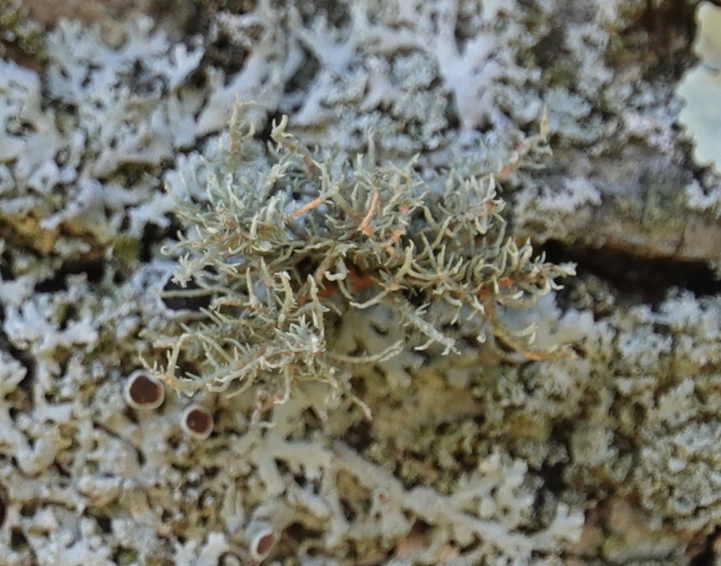 Spotting them, I handed the pictures over to Molly. Once again, she came to the rescue: these seem to be specimens of Phaeocalicium polyporaeum. The tiny tinies grow on a couple kinds of shelf fungi.