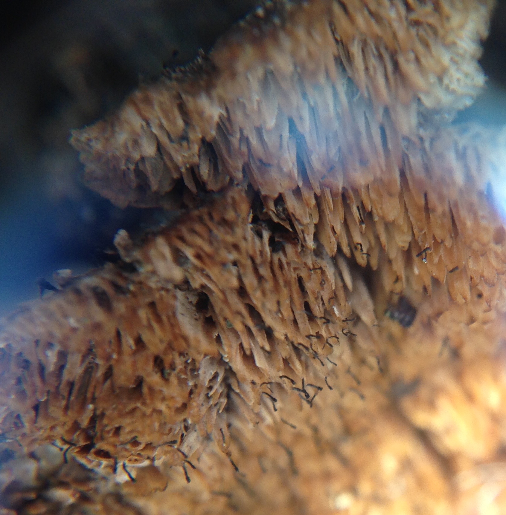 Recently also I spotted some tiny black filament-like structures coming off some mushrooms from a fallen branch. I only noticed these when looking at the photos I’d taken of the mushrooms; these pin lichens are too small for the naked eye.