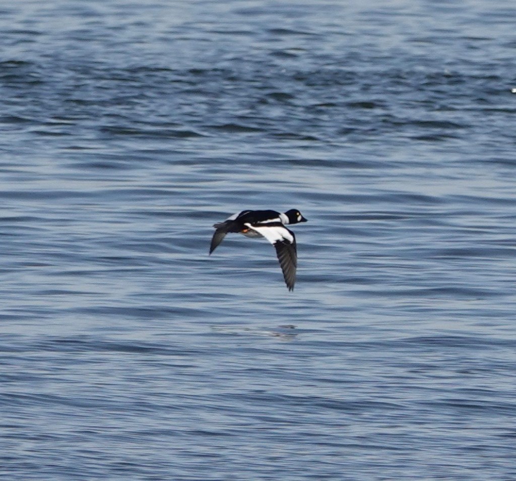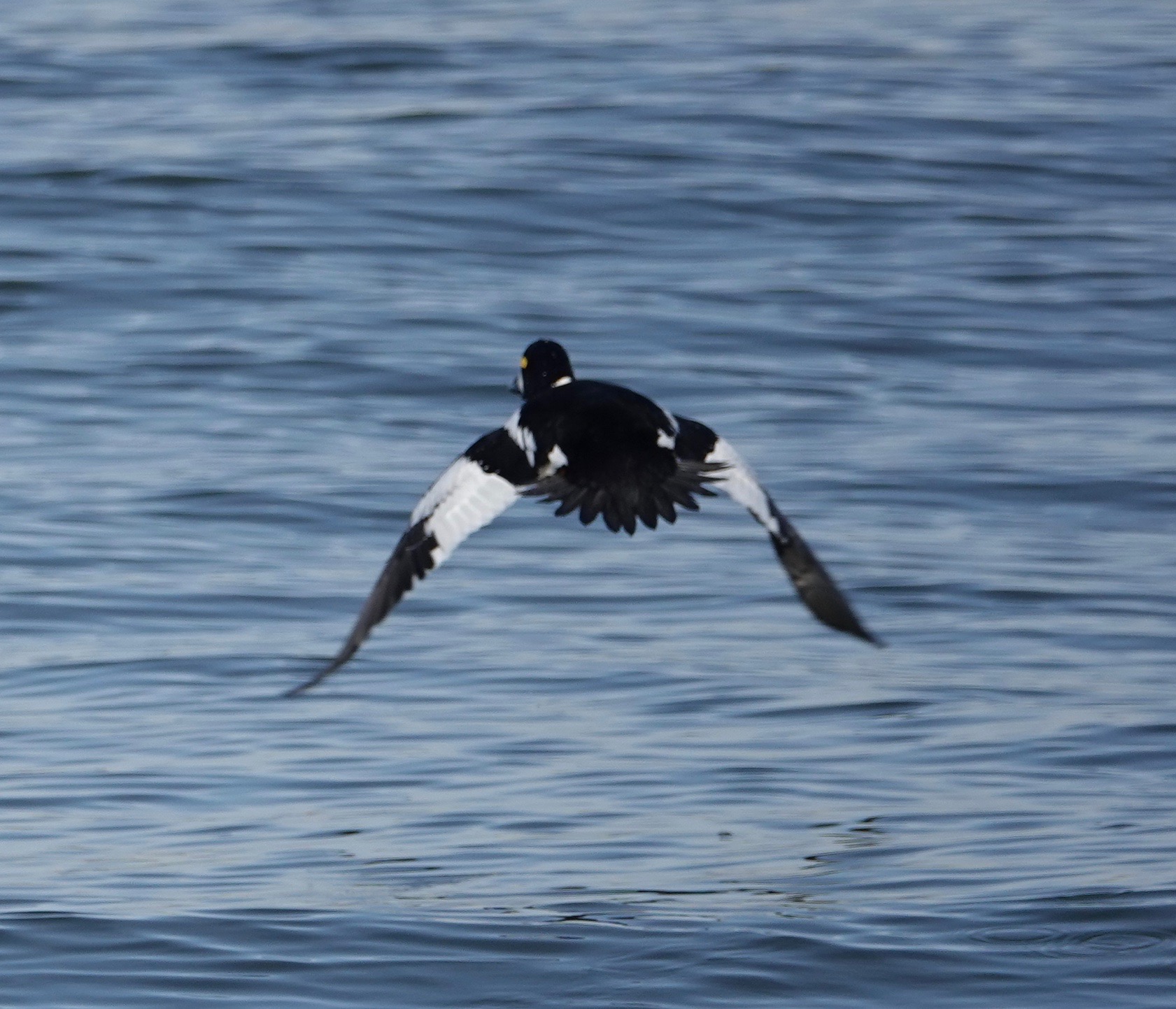 We surprised each other. I think this Common Goldeneye had just come up from a dive when I reached the end of the pier. It shot off. I shot off a few pictures.