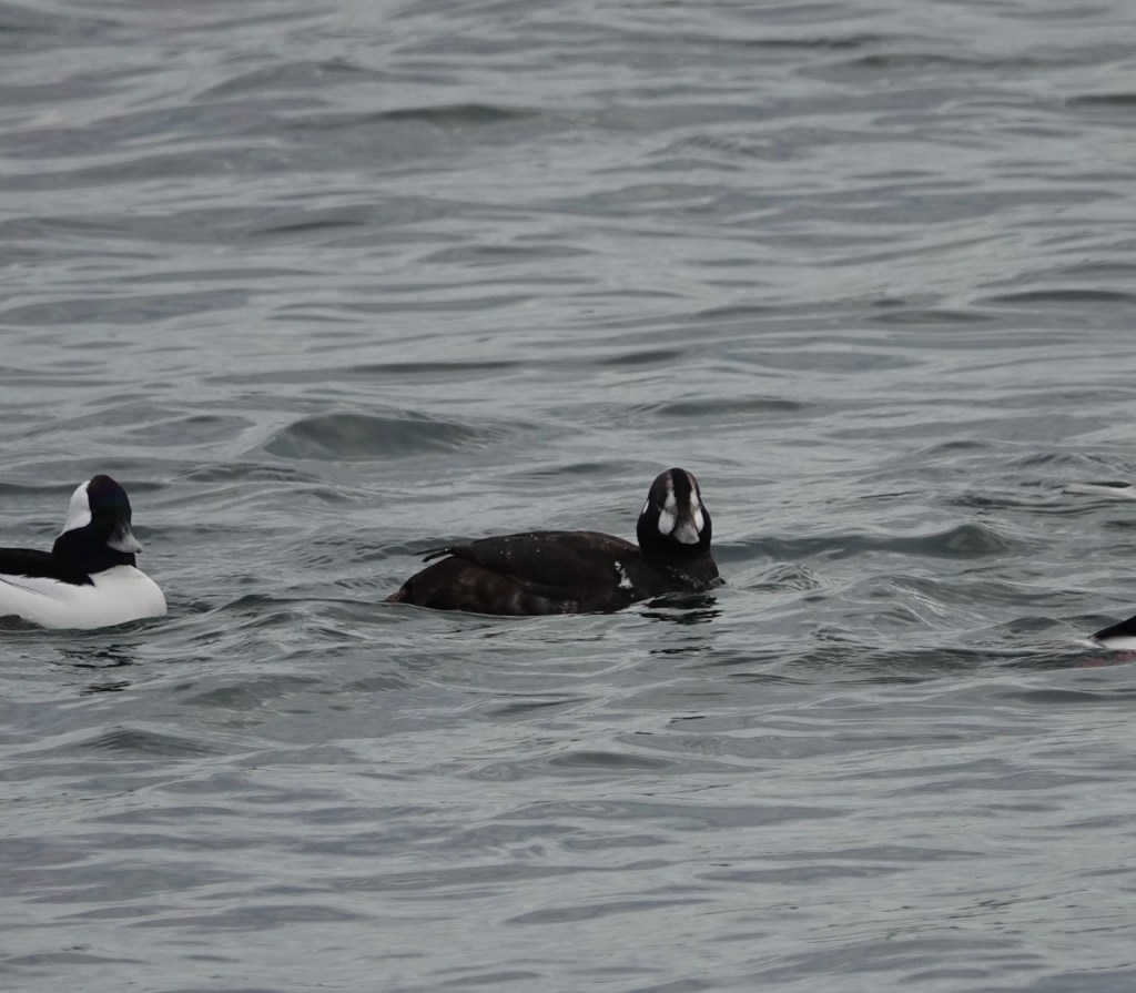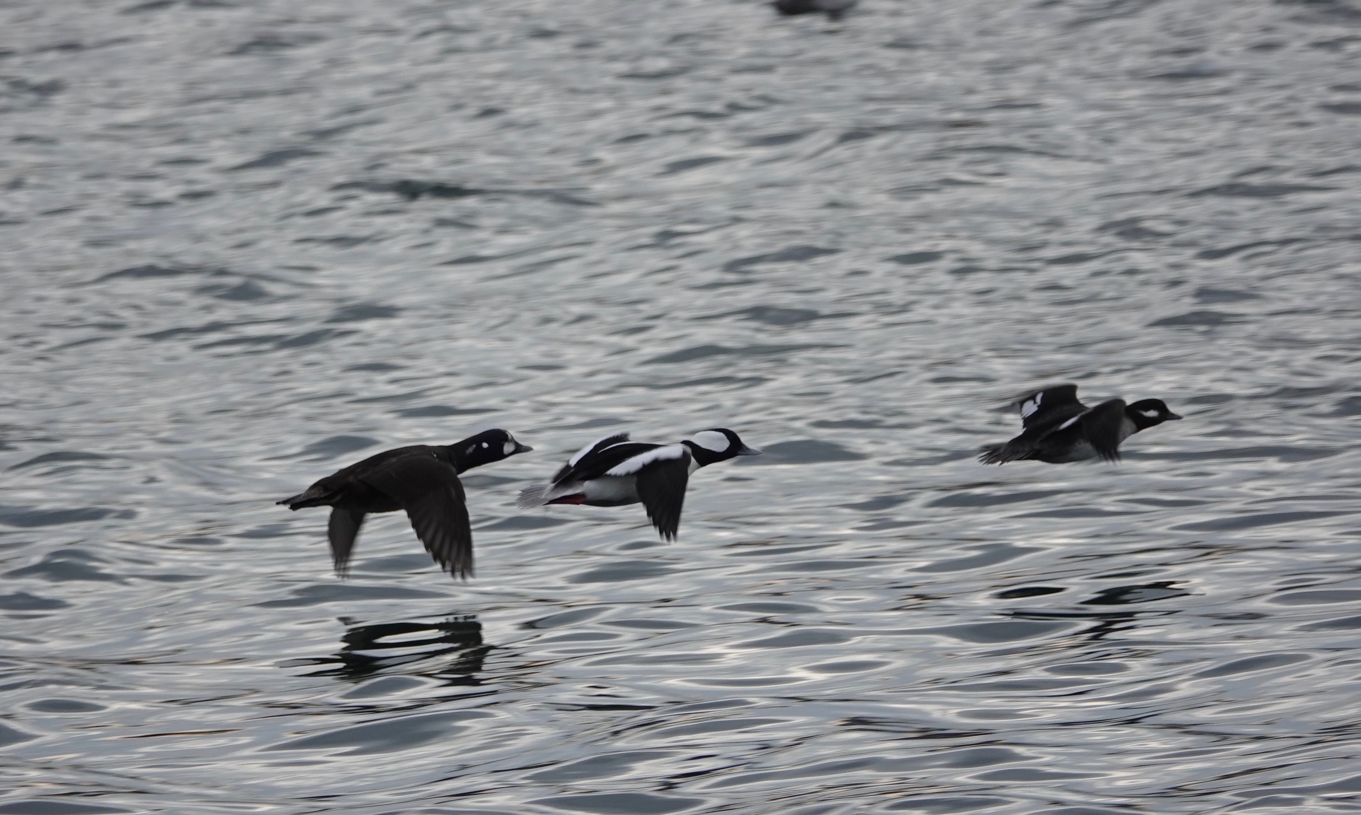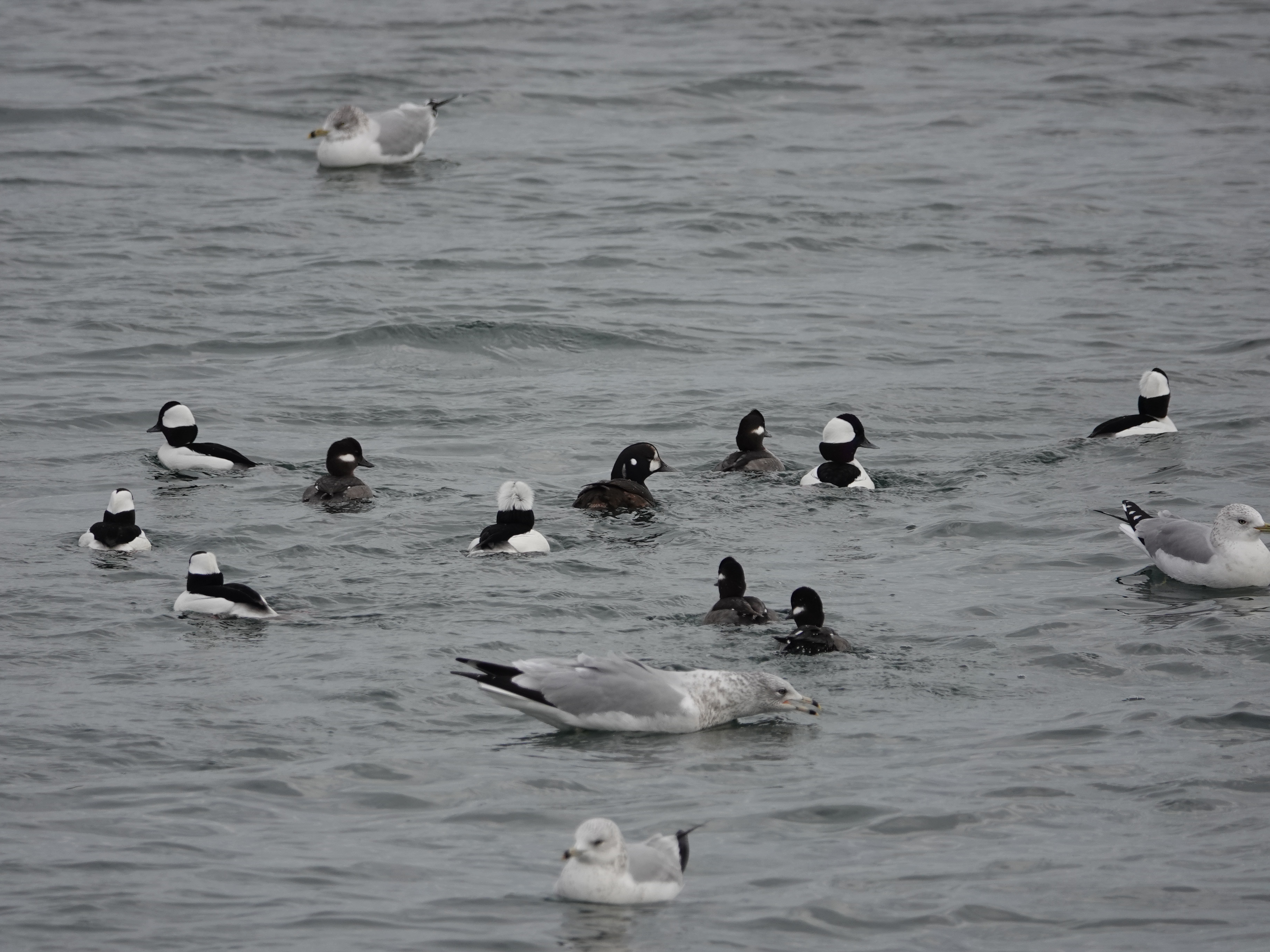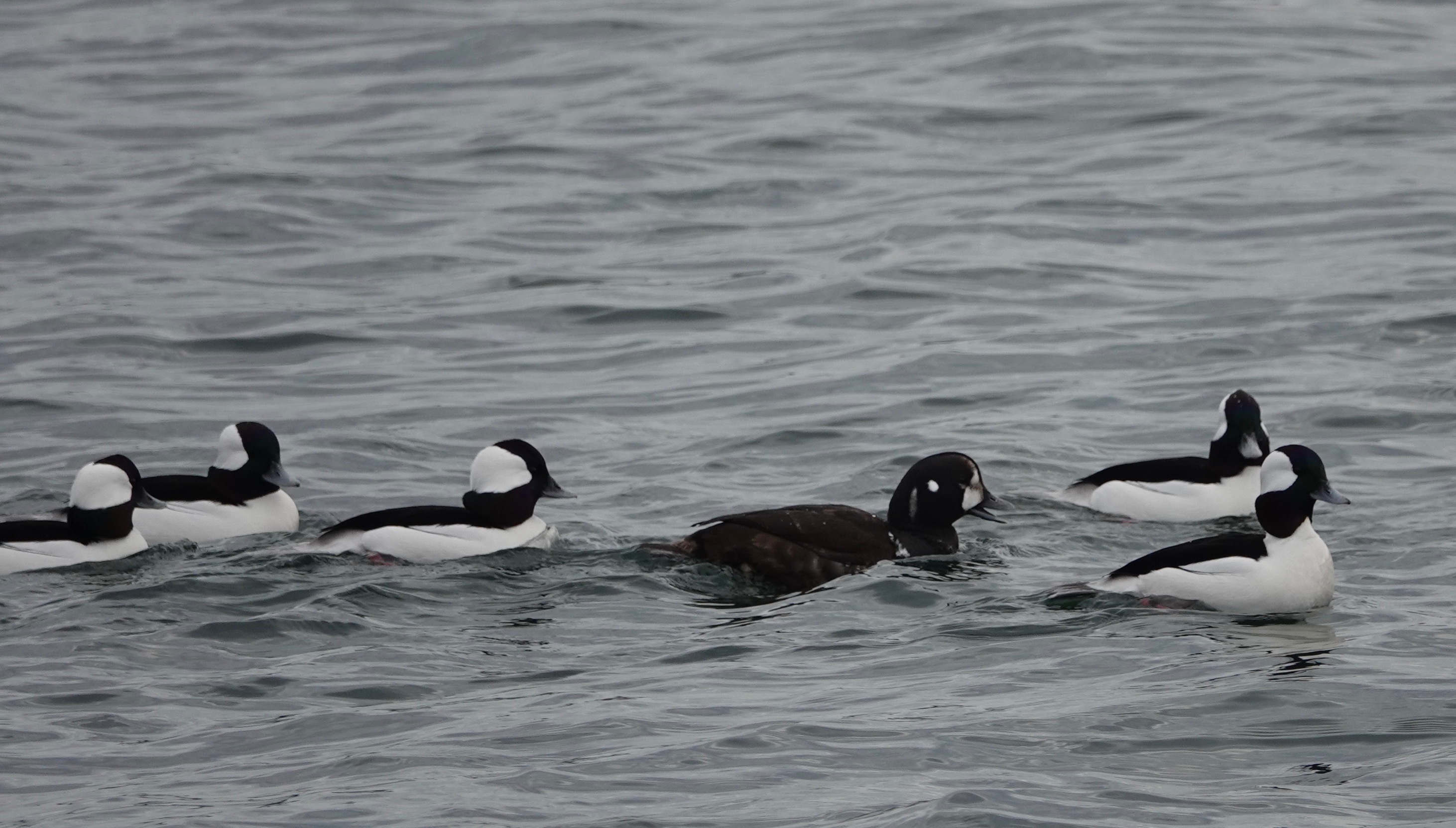 A little bigger than the Buffleheads he’s been hanging out with. Histrionicus histrionicus generally like the rocky coastlines and strong waves found further north. The placid bay here, bulkheaded on three sides, is definitely not typical habitat.