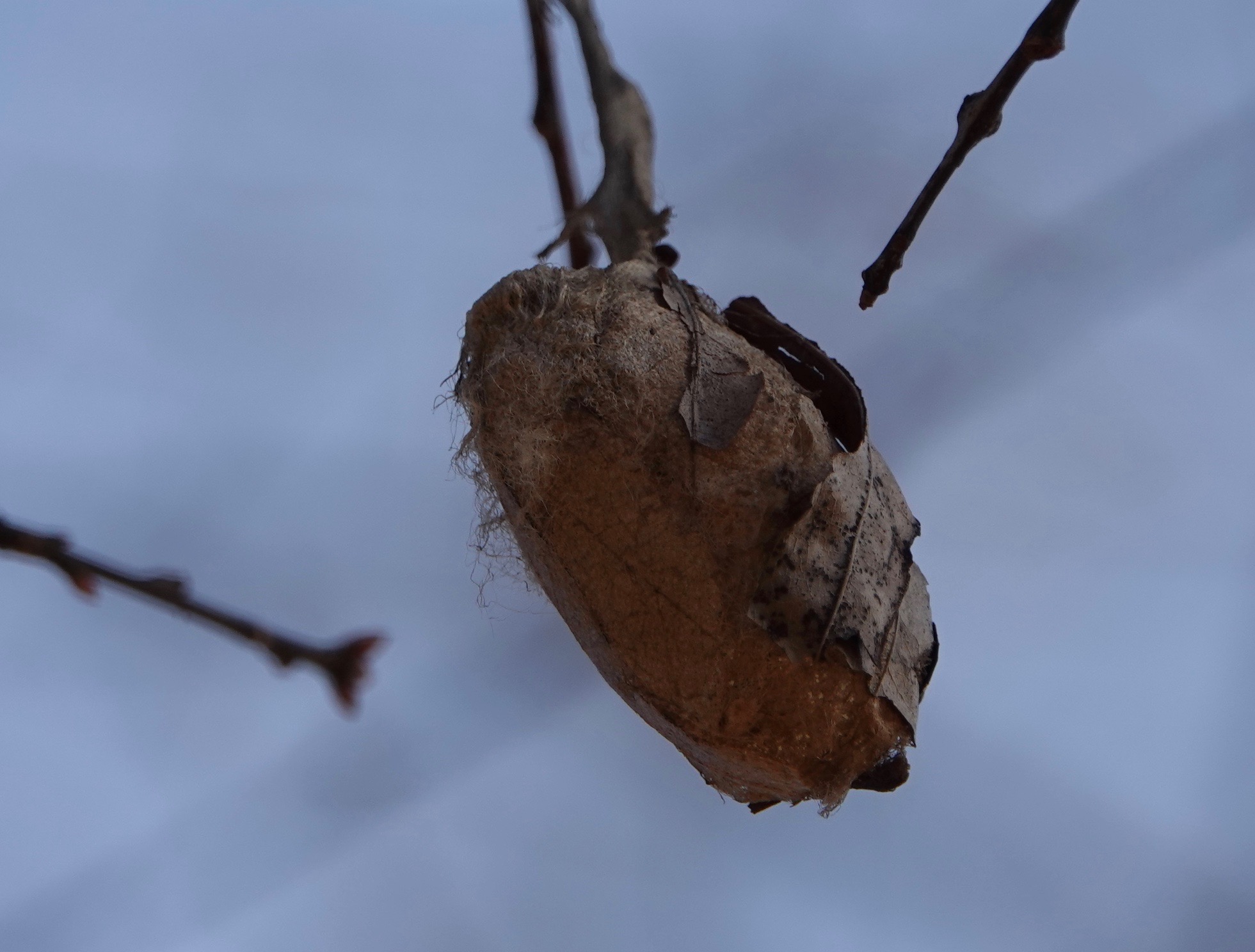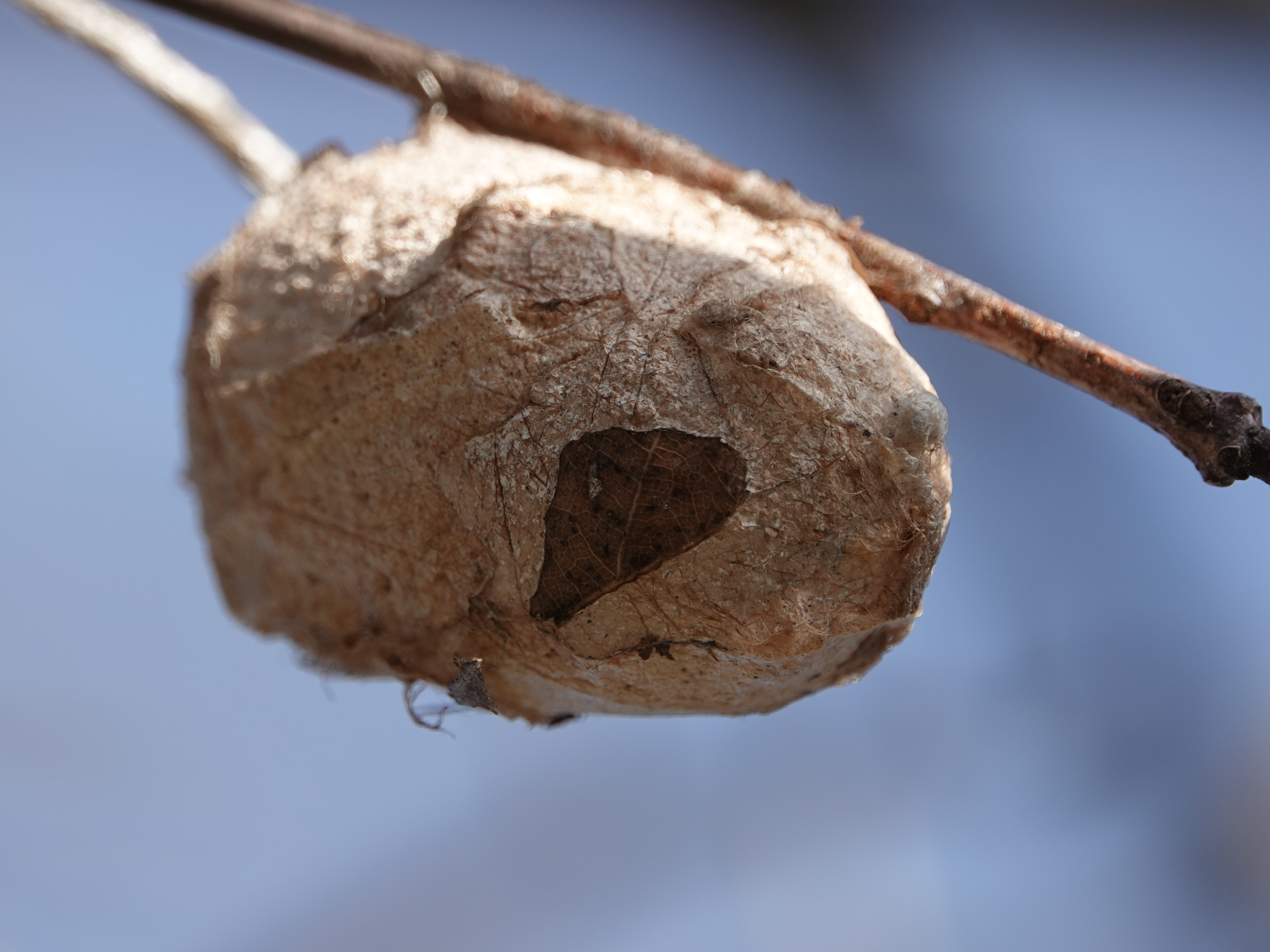 Over the weekend I found four large silkworm cocoons. This one was hanging in an oak.