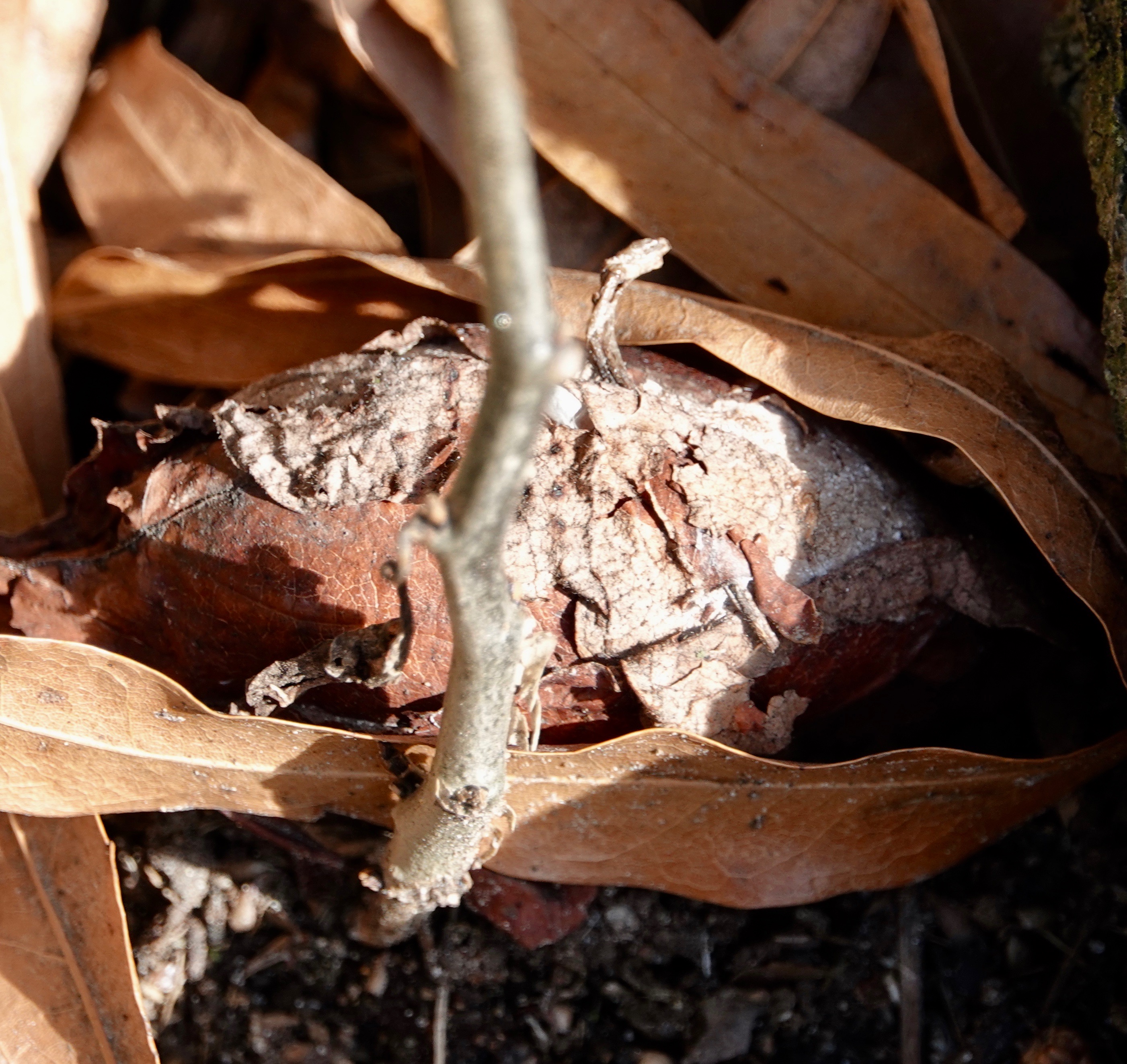It has since fallen to the ground, to blend in with the leaf litter in the bulwark of the tree.