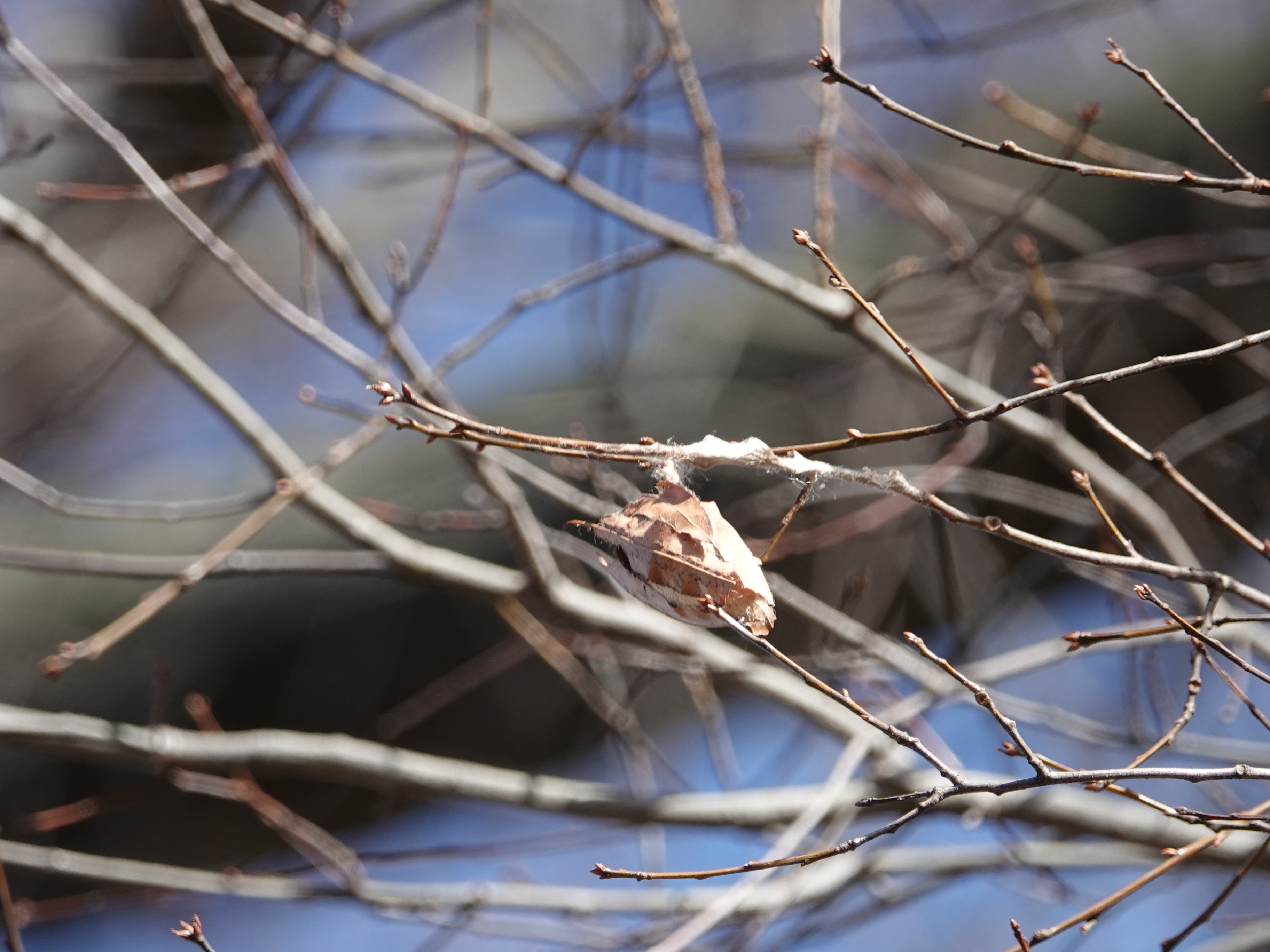 As it happens, this — the tree with the two suspended cocoons — is the same willow oak where I found one of these last year. The tree has at least three cocoons now. I spotted one of them attached to a vine in November.