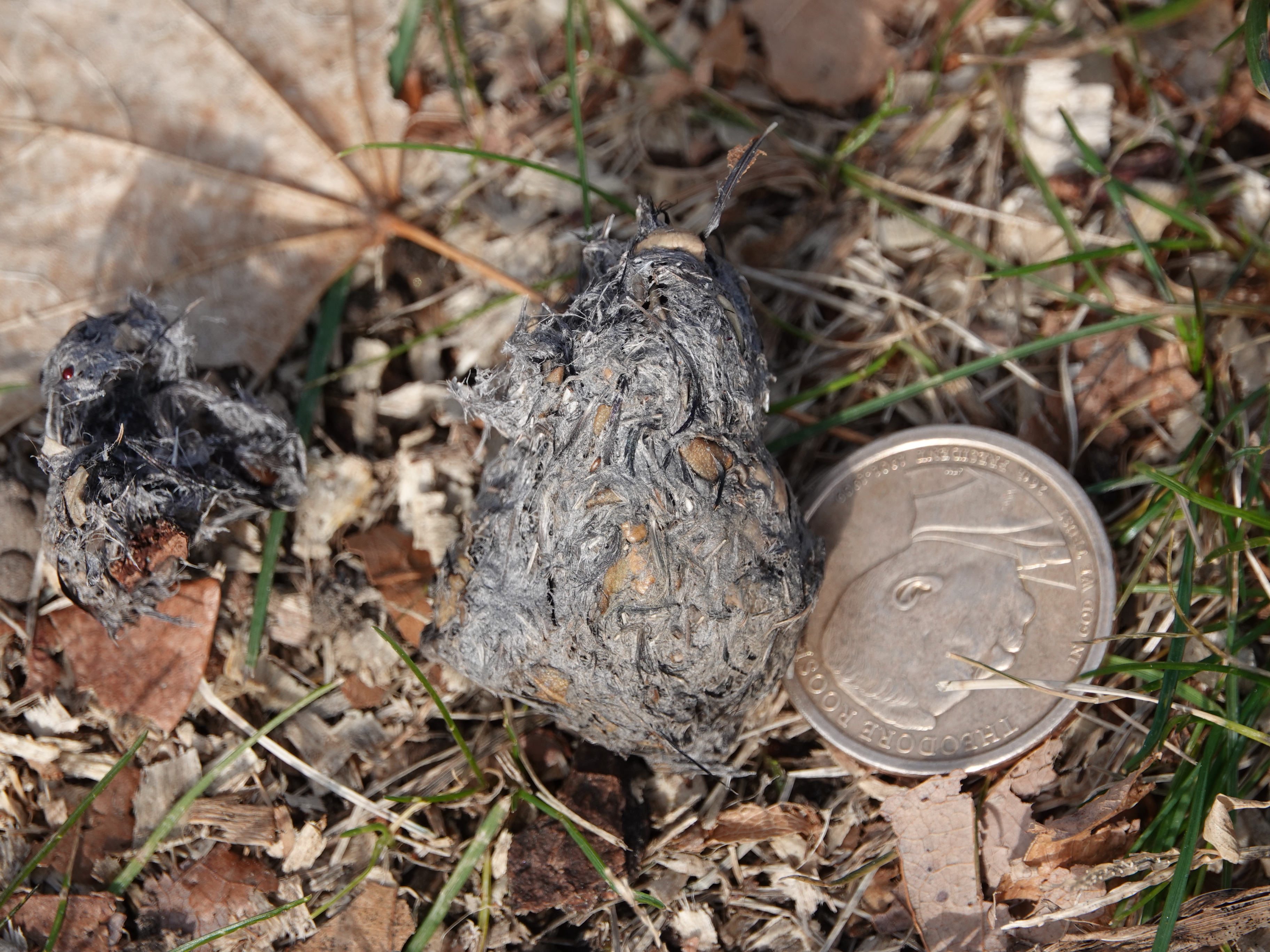 Owl pellets are the most famous, but diurnal raptors and others others spit them up, too. Here are some I suspect are from a Belted Kingfisher.