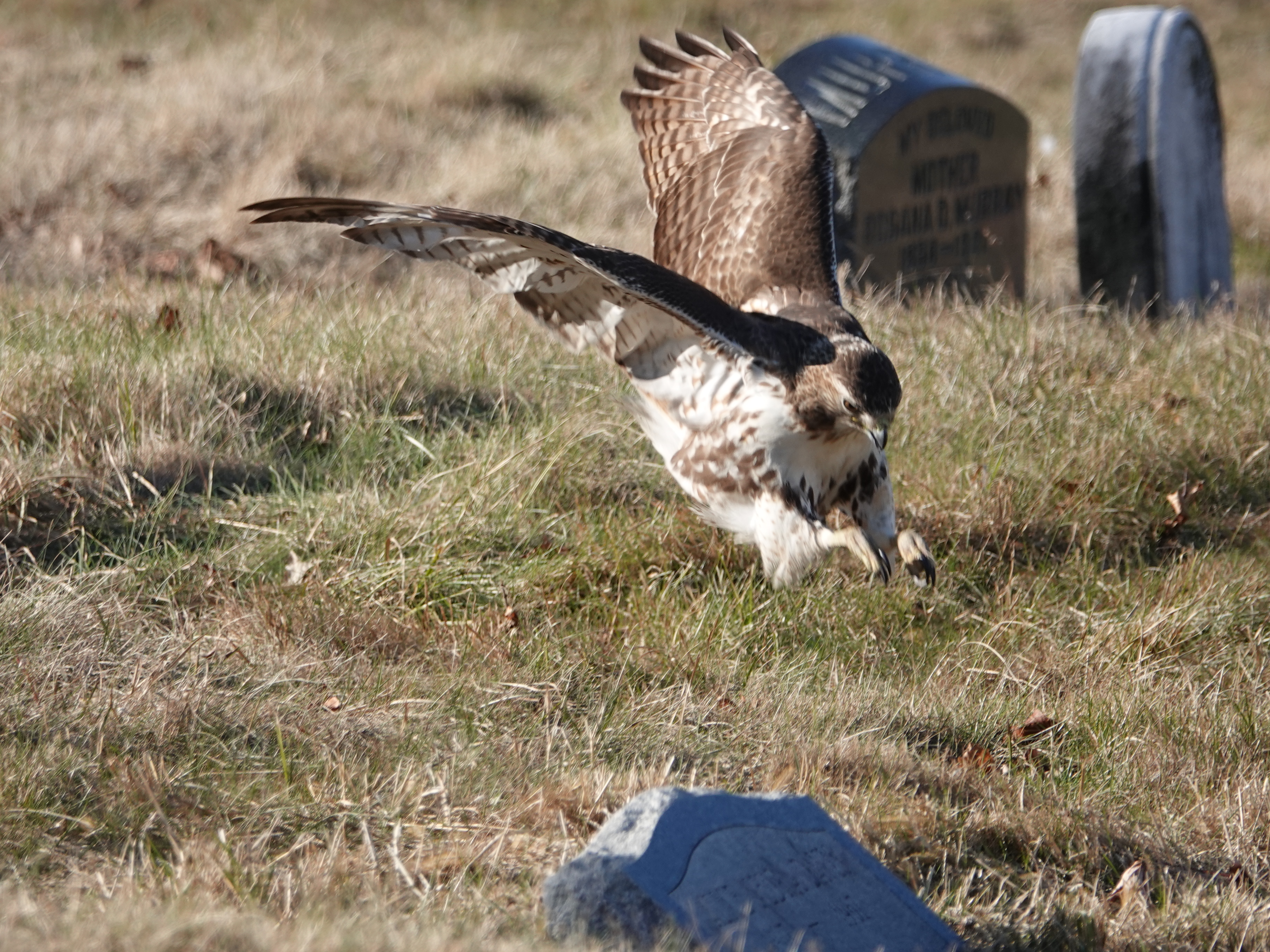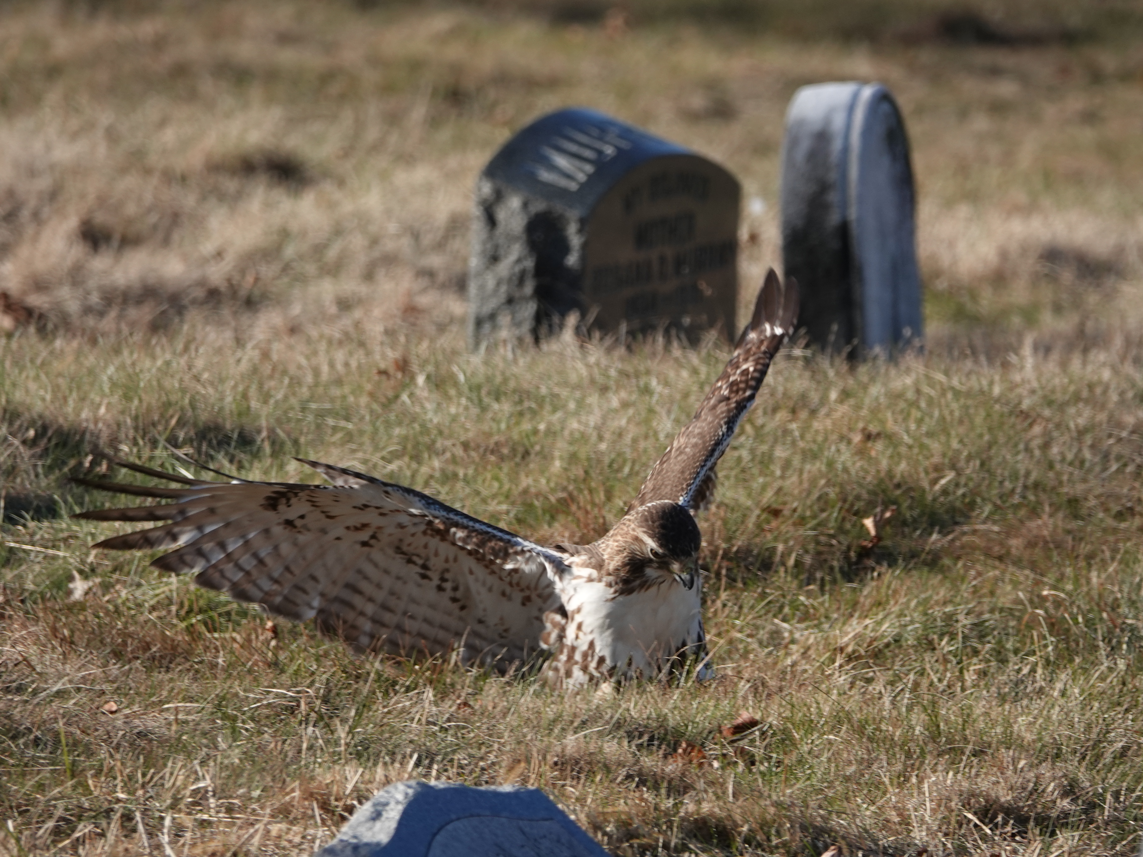 This young Red-tailed hawk, the same bird seen nearly an hour earlier, flew into a corner of Green-Wood that is sometimes patrolled by a male American Kestrel. The falcon was there! He set up a hue and cry, dive-bombing the buteo, but to no avail. The big hawk flew from tree to tree before descending down to the ground. Jump-flying around, trying to capture something. Didn’t seem to catch whatever it was, however.