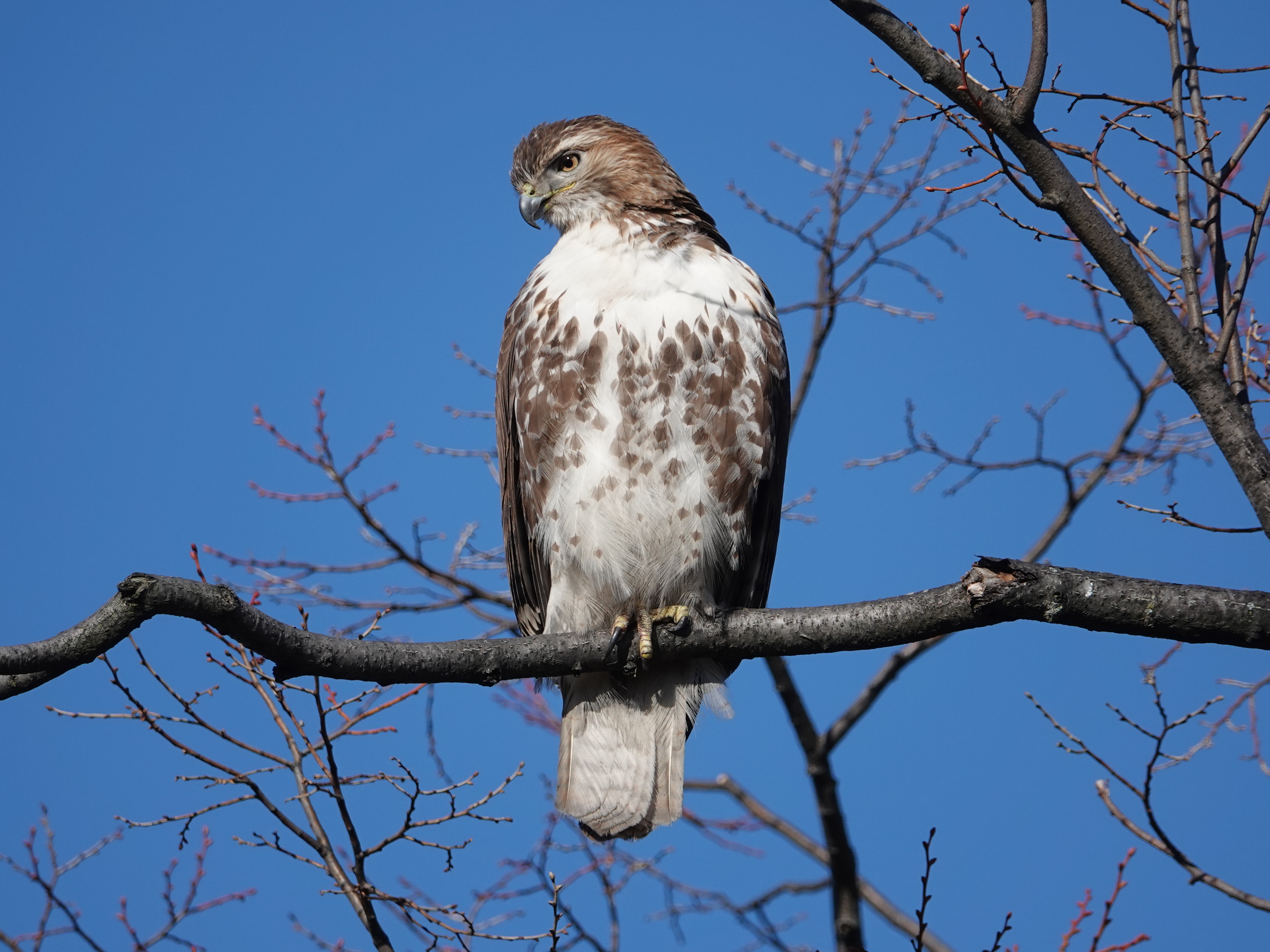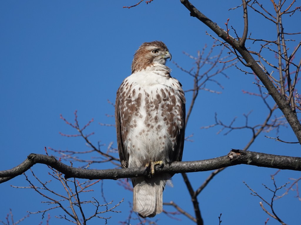 When it took to a tree again, the Blue Jays arrived. The big bird ambled away to a couple of other perches before settling here:
