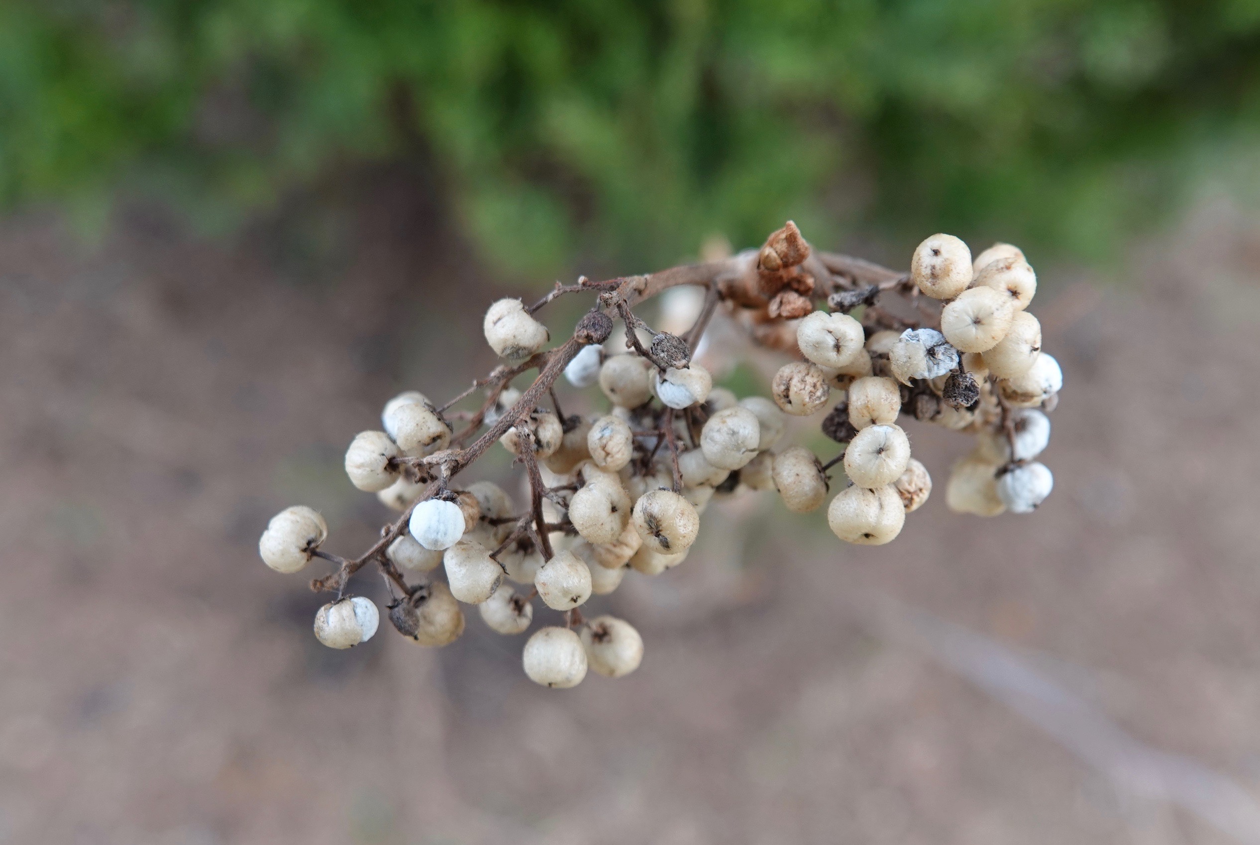 This poison ivy has worked its way through this conifer and sprouted out at the top. Close up of some of the berries: birds love these things in winter.
