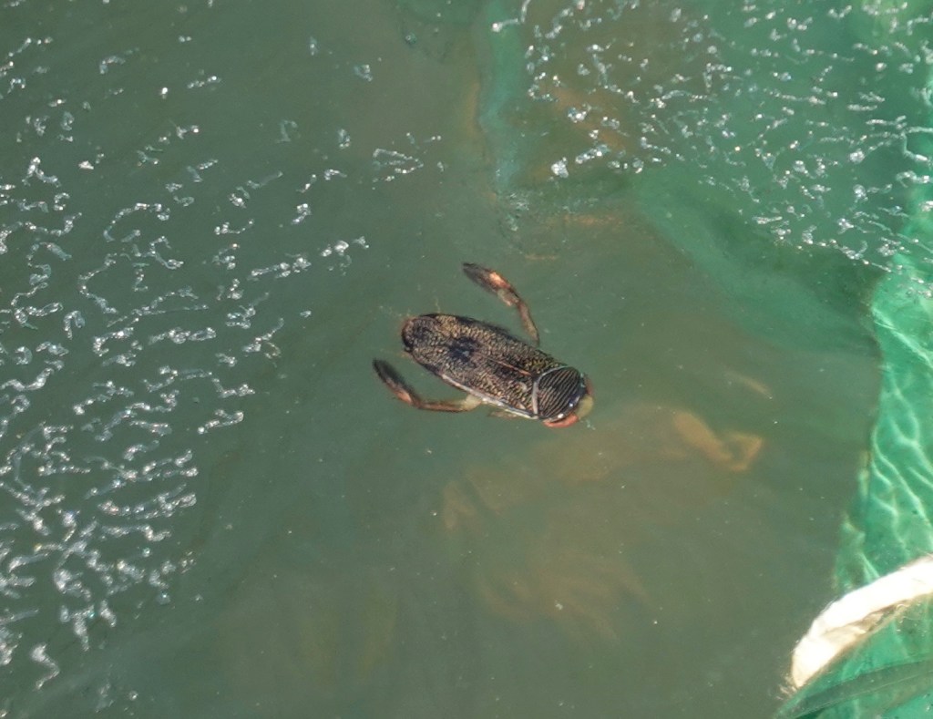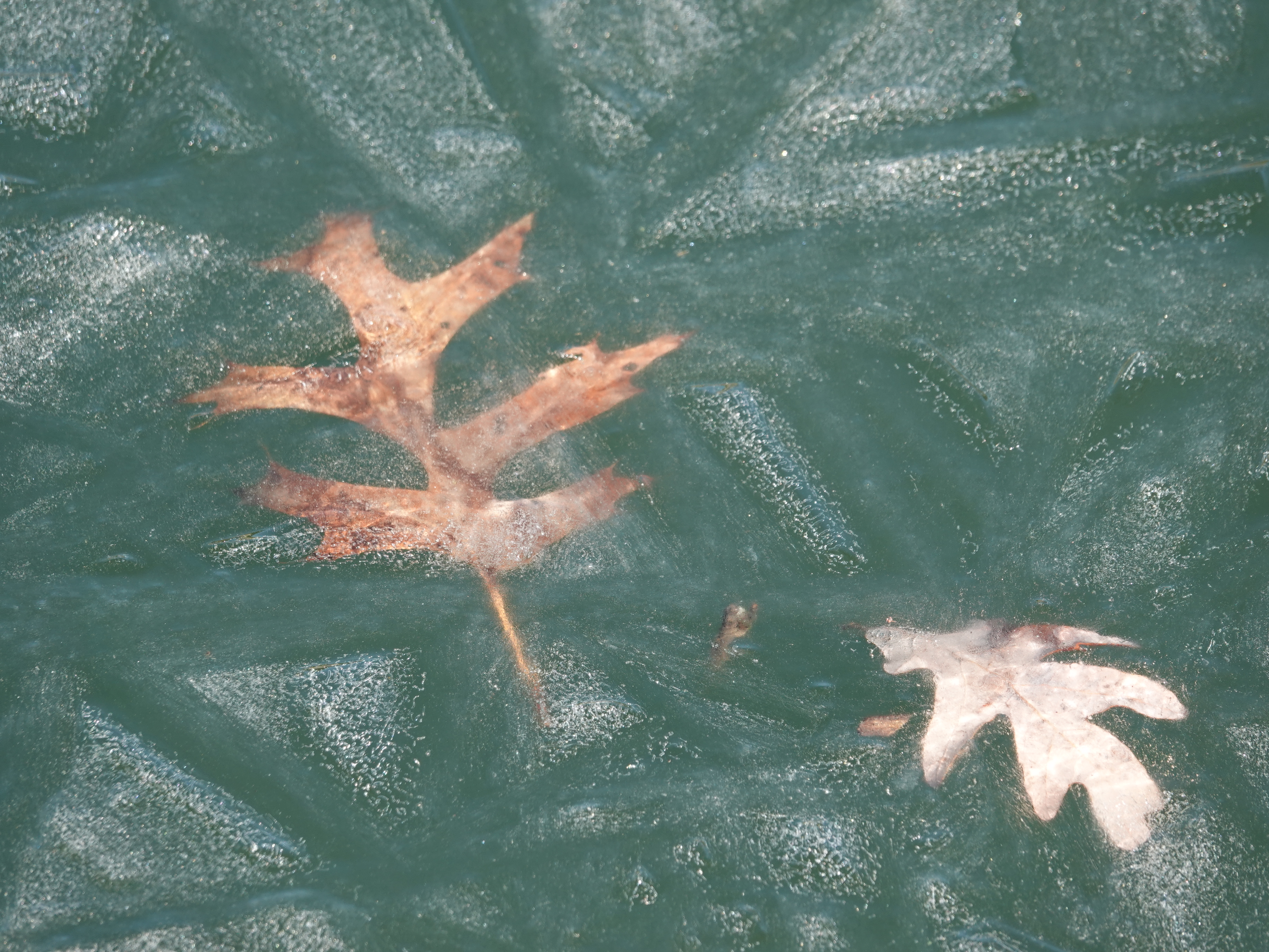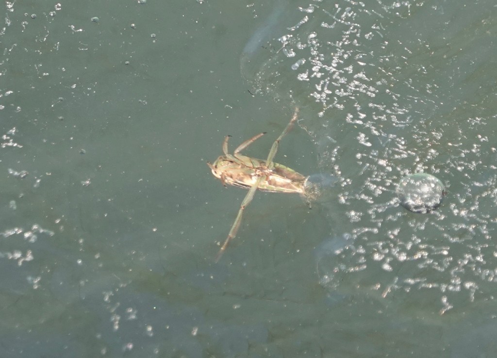 Under a thin layer of ice, two true bugs in the Crescent Water. The first is a water boatman, the second a backswimmer.
