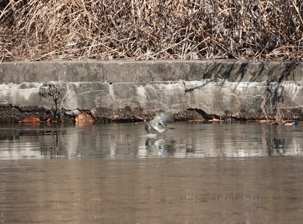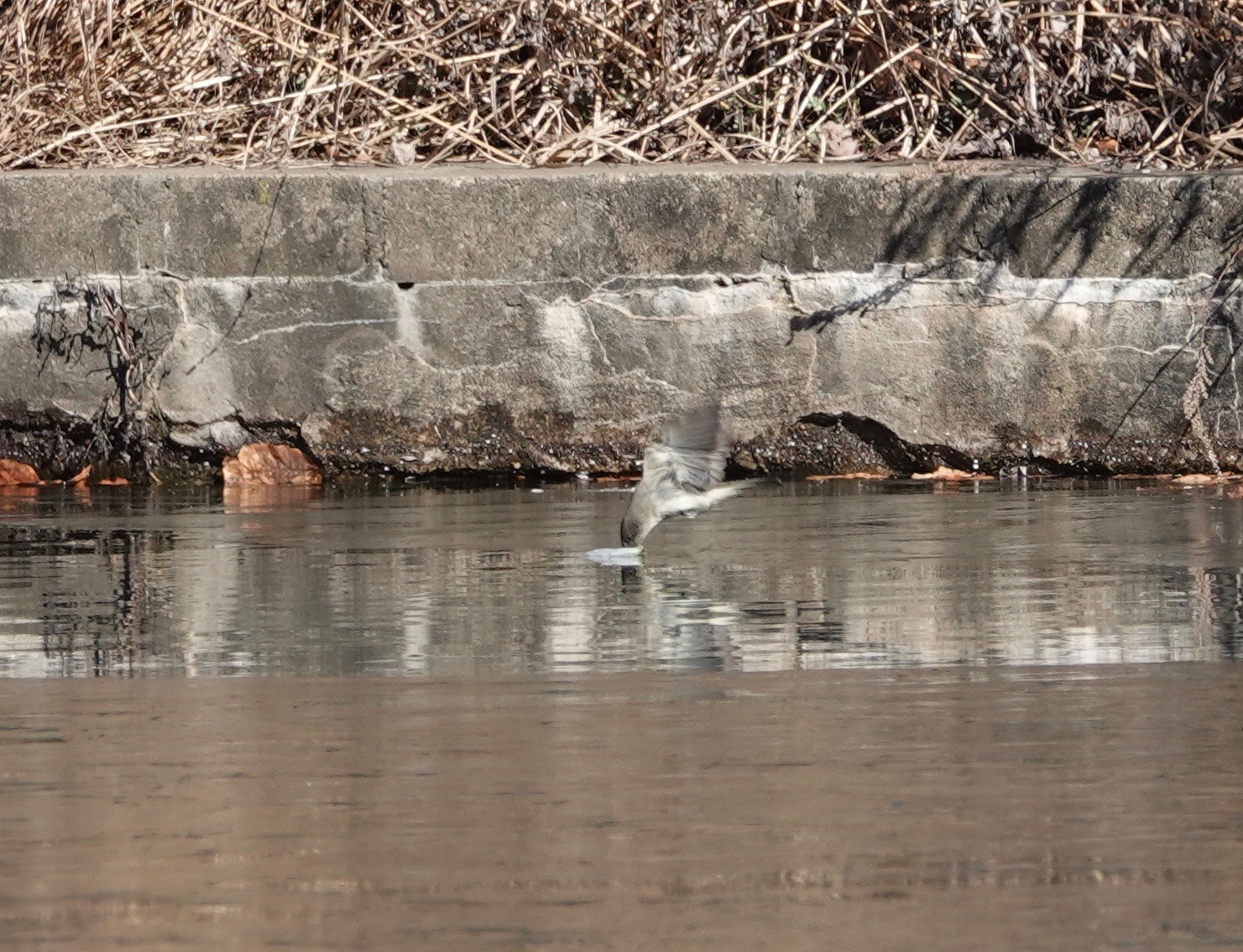 Not all of the pond was iced over. Aerators keep donut holes of water ice-free, and the edge along one side of the pond was also open. This Eastern Phoebe was making short forays over the water and sometimes dipping into it. Not, I think, to drink, but to plunge for prey! Just a guess, considering there are obviously insects to be had in the cold water.