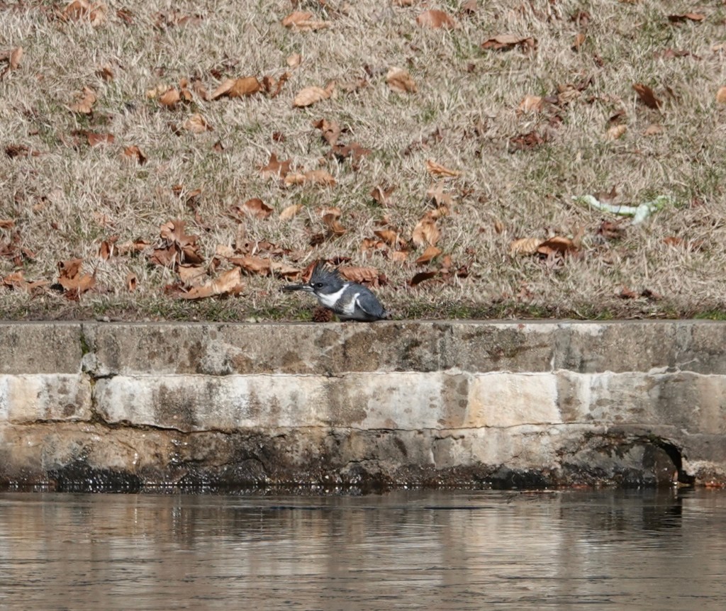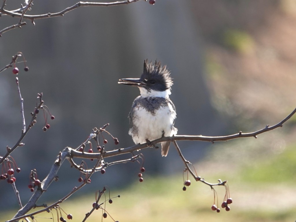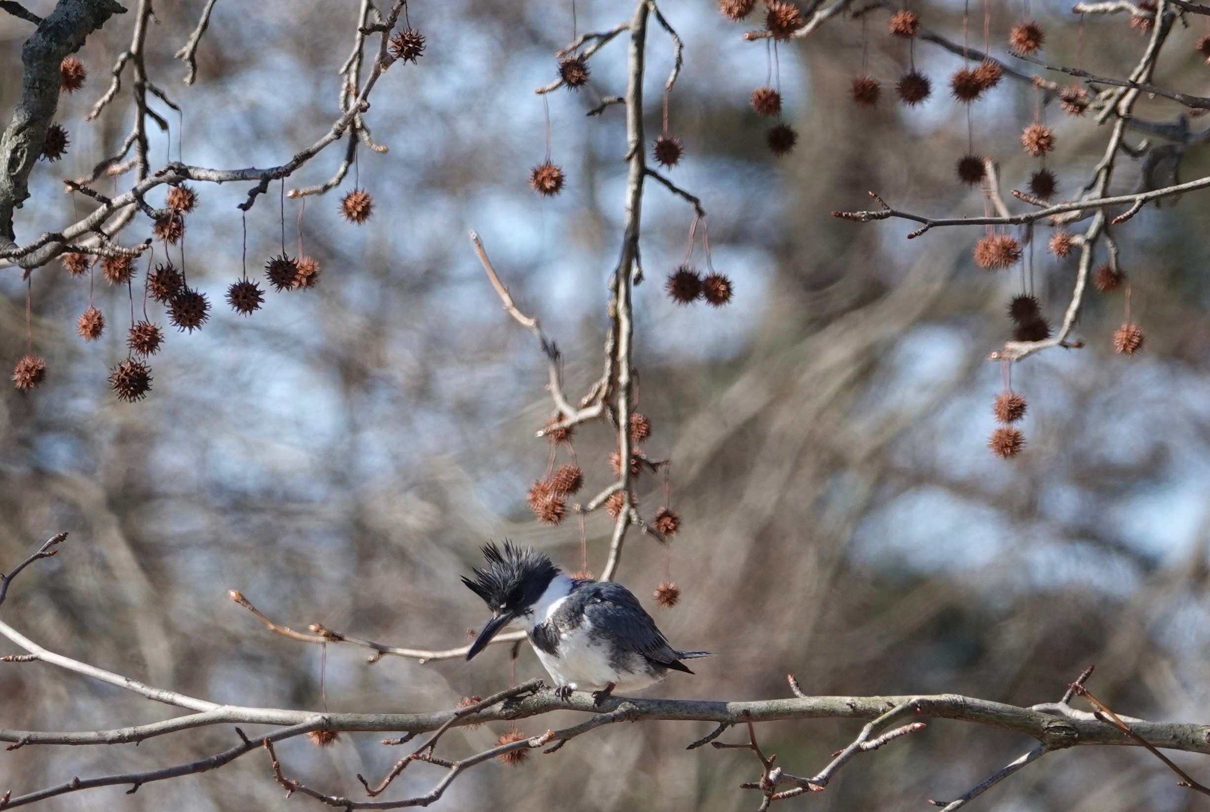 This Phoebe (presumably the same one) seems to have been around all winter. So has this male Belted Kingfisher. He is also leery of people, but a lot noisier about it. Making dive after dive for little fish, usually not hitting, but obviously striking enough to be stick around. (Yesterday I saw him gulp down a goldfish.) The Kingfisher hovers like a Kestrel over the water before plunging, something I’ve never seen before this winter.