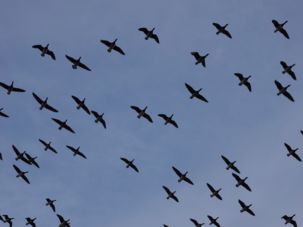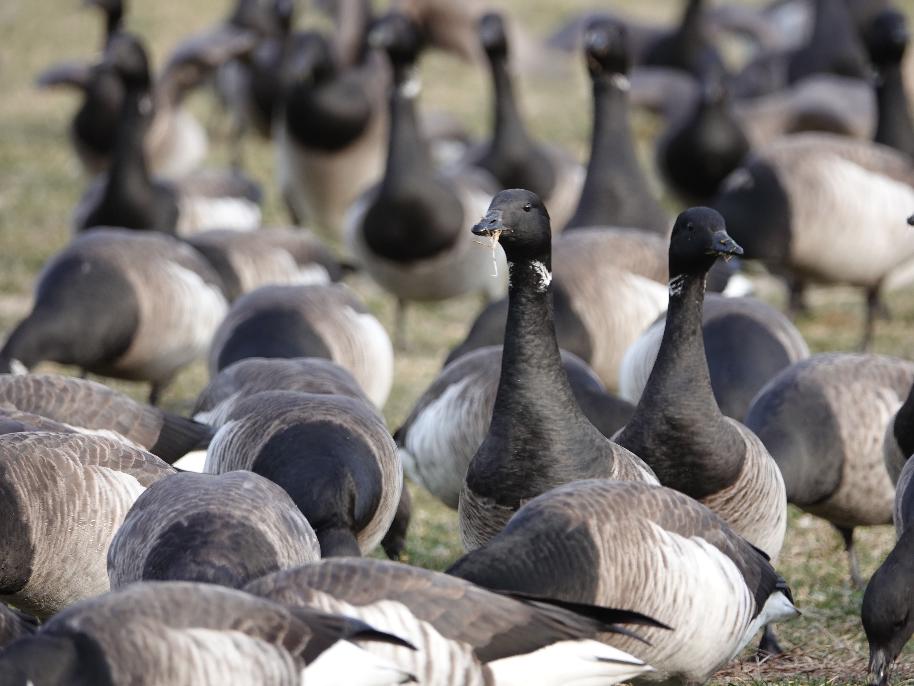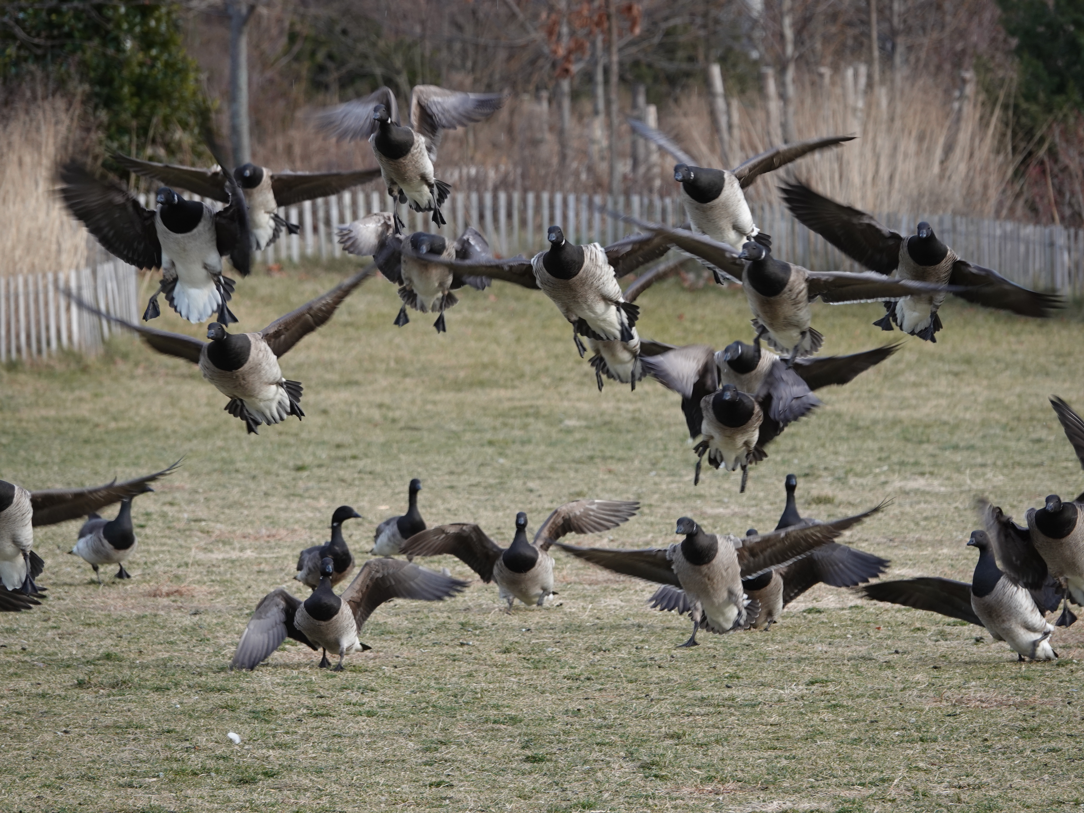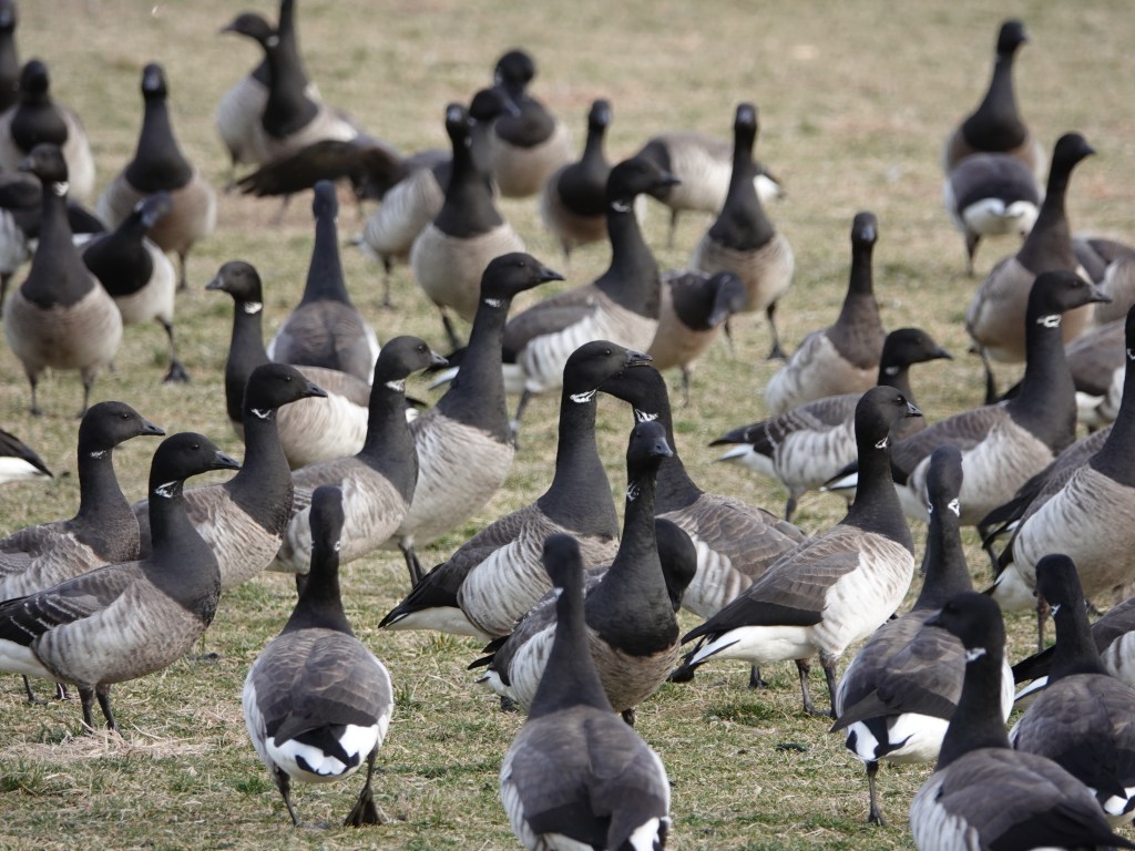 I was crouching down at Brant-height when the whole company of them were spooked by something. Their runway was in my direction. They took off not far above my head. One of the last to pass above dropped a very compact and intensely green turd, which bounced off my hat and landed in the grass. Thank heavens for winter!