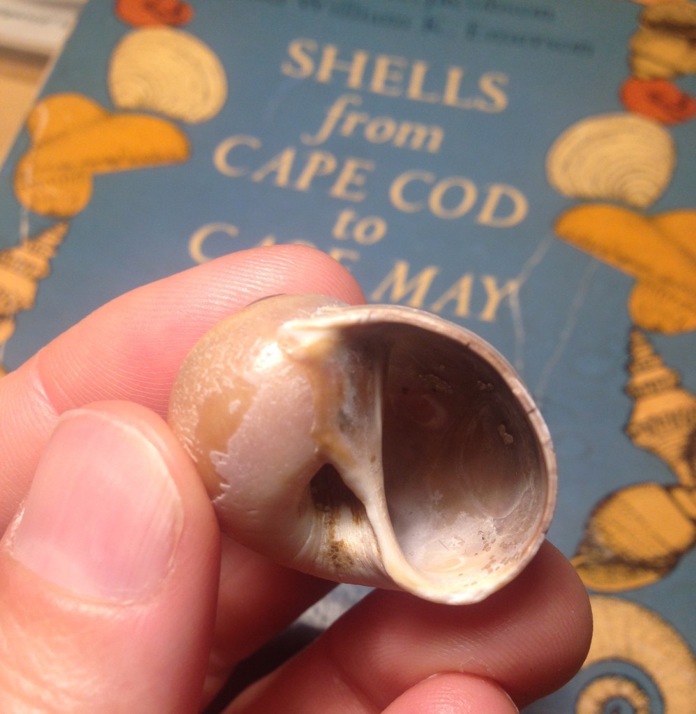 Unfortunately, I don’t have an example of Neverita duplicata, the Shark Eye, since getting any of these intact on the beach is hard. The Shark Eye “can easily be distinguished [from the Northern Moon] by the heavy brown or purple callus” say Jacobson and Emerson in their classic Shells from Cape Cod to Cape May. The callus on this is neither heavy, nor brown, nor purple.