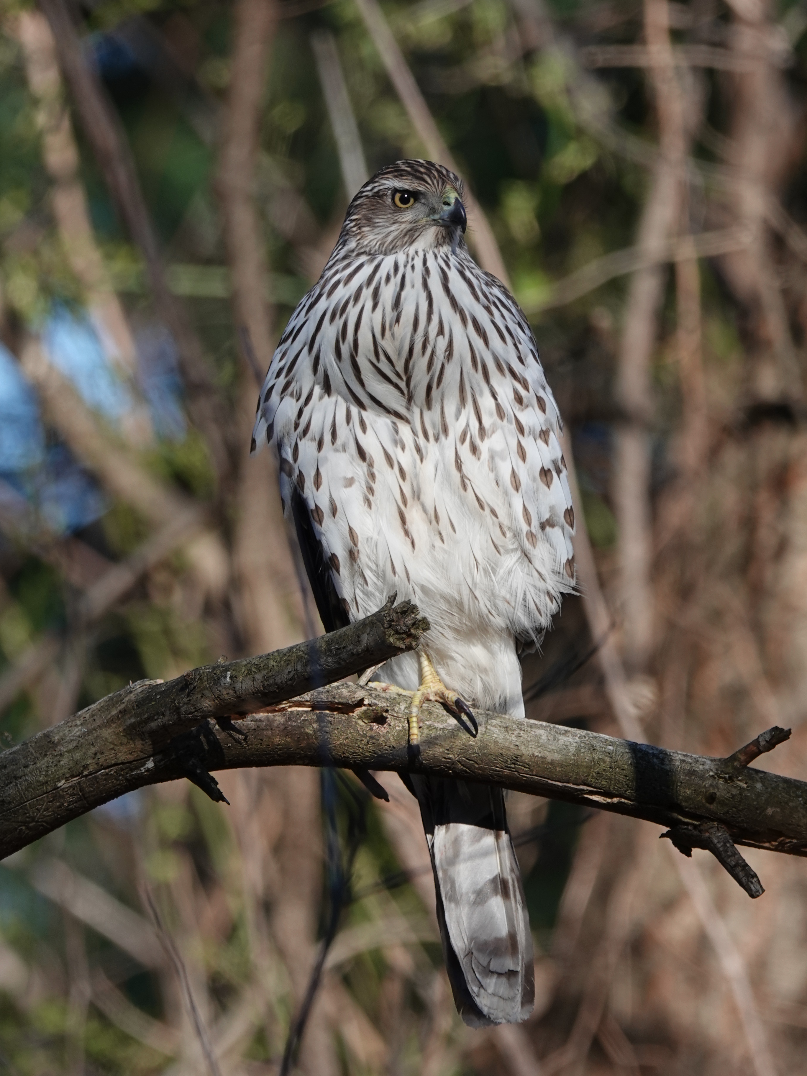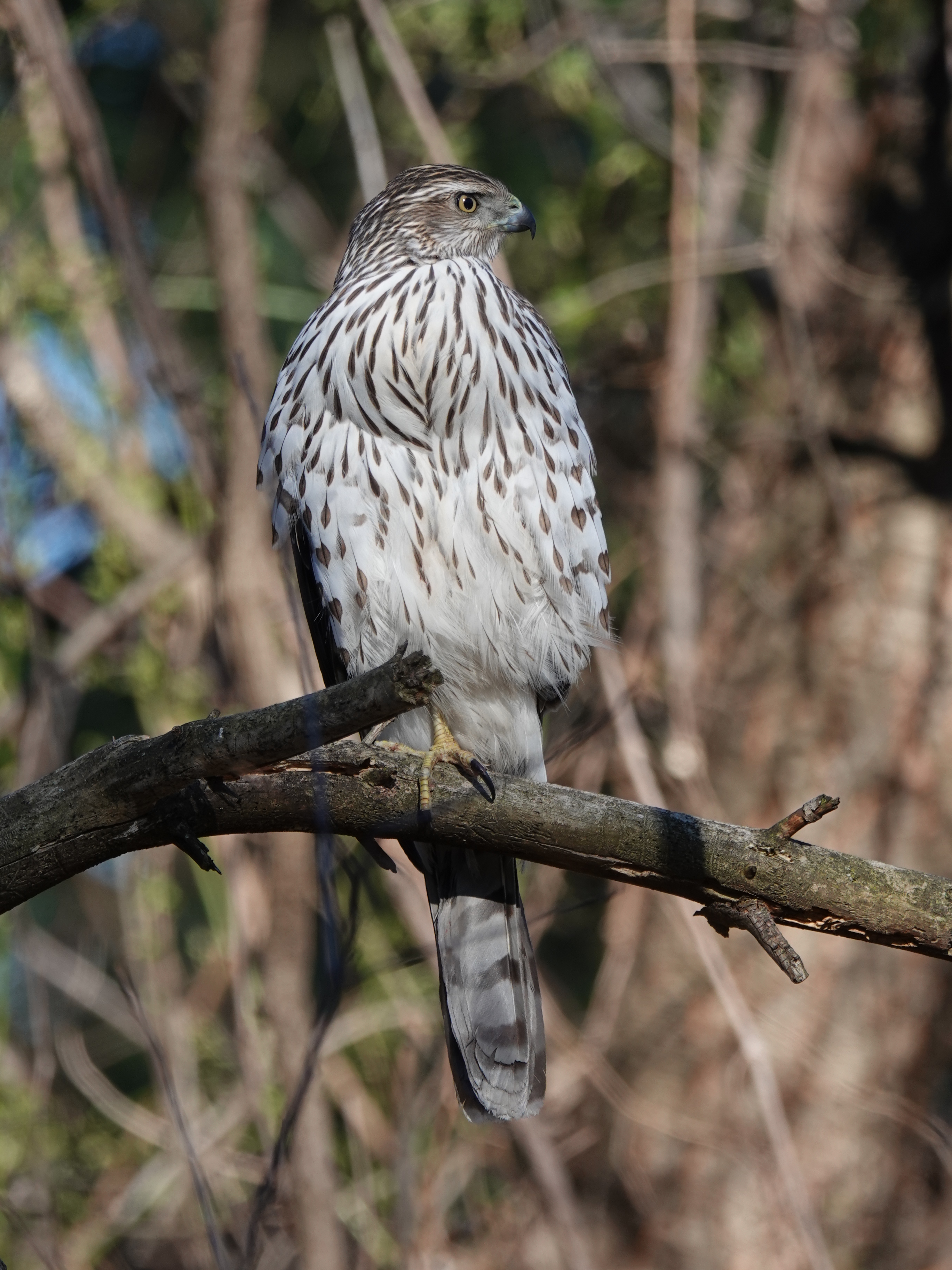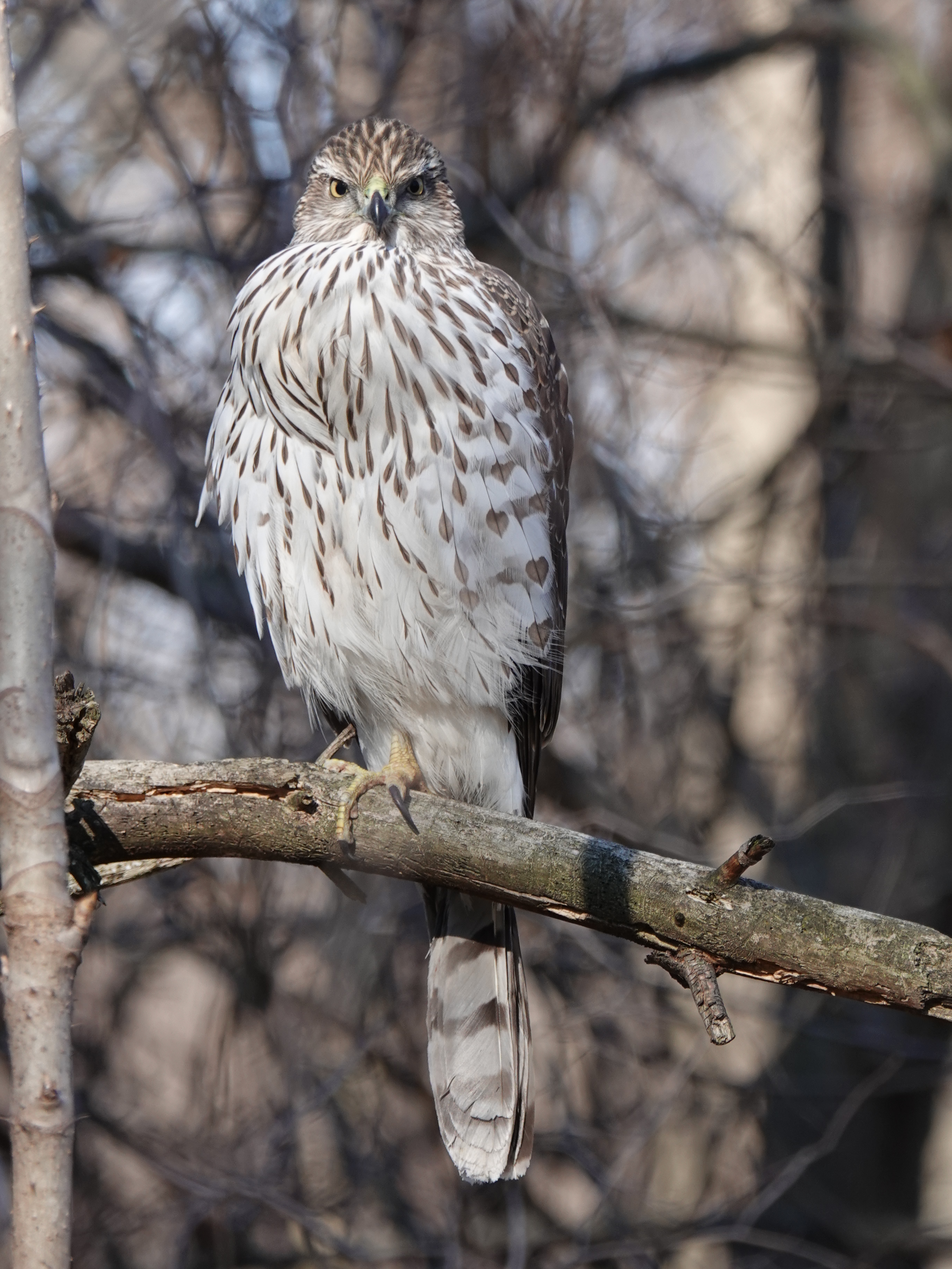 The bird was perched at eye-level about 20 feet off a path. After someone walked by, without spooking the bird, I cautiously walked down the path, too. A few more people passed me as I took photos, including one with a leashed dog. Coop don’t care — which is unusual, since Accipiters are fairly jumpy birds. But you know how digesting a big meal slows you down. And, of course, the park is packed with people, so the bird has probably spent a lot of time around us.