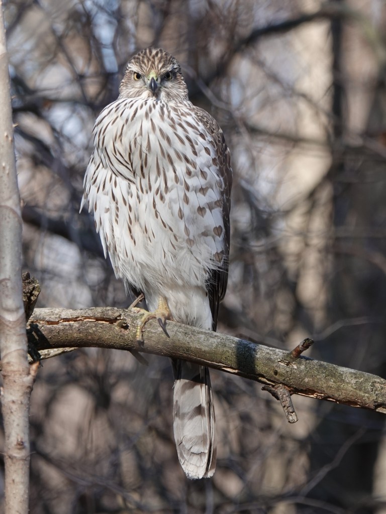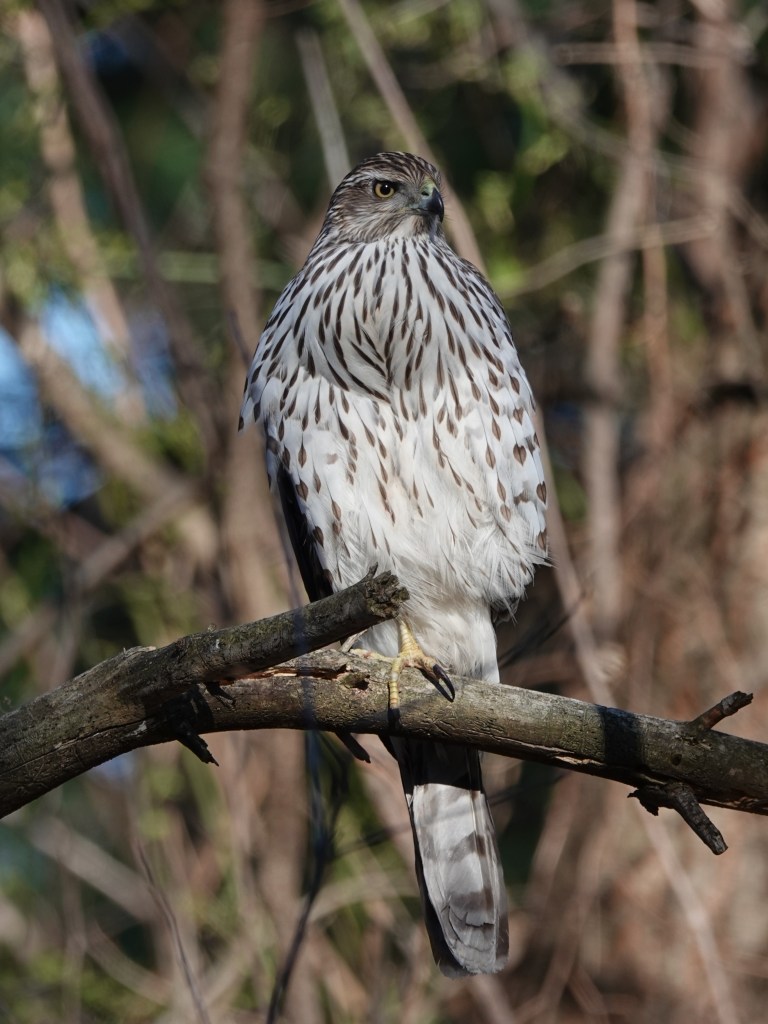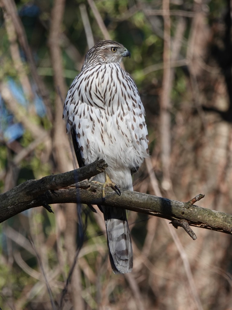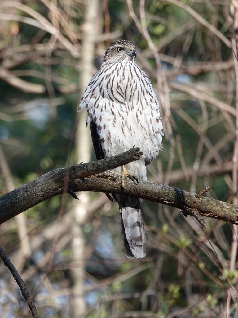 Cooper’s Hawk near the bird feeders. But, as you can see from that bulging crop, already full.