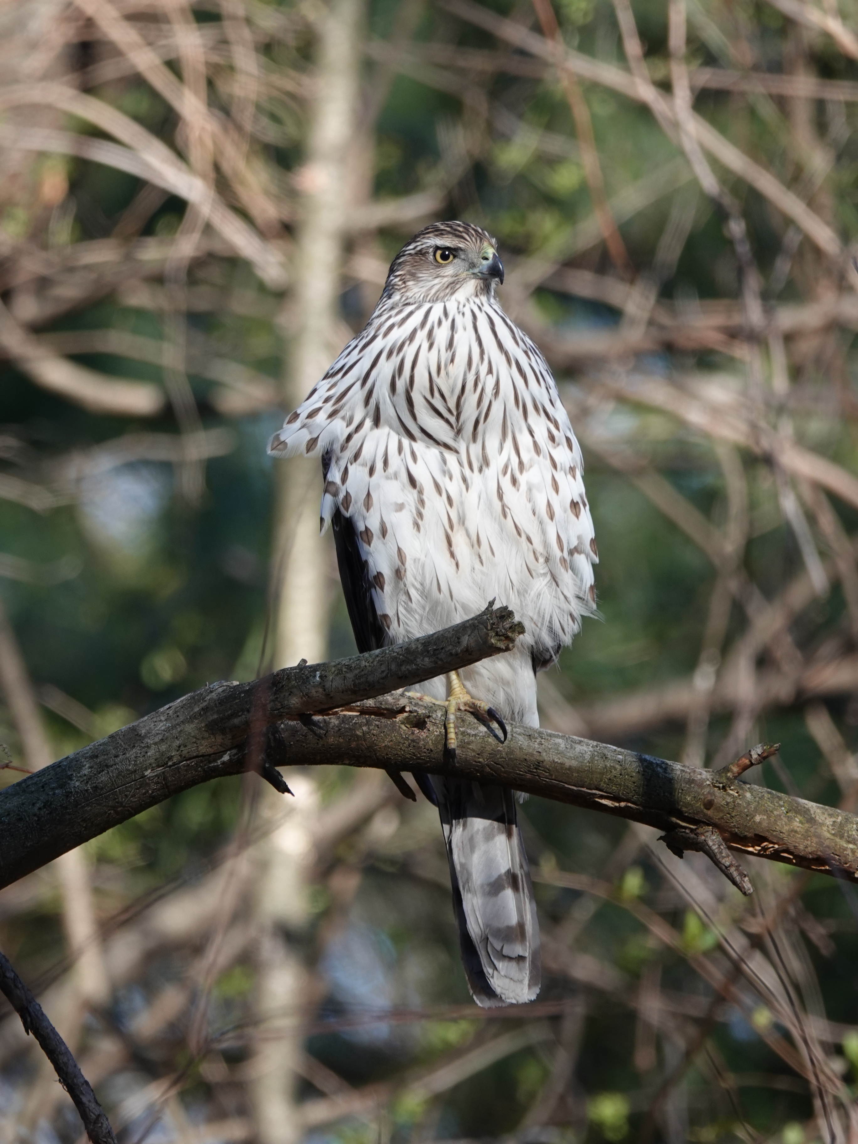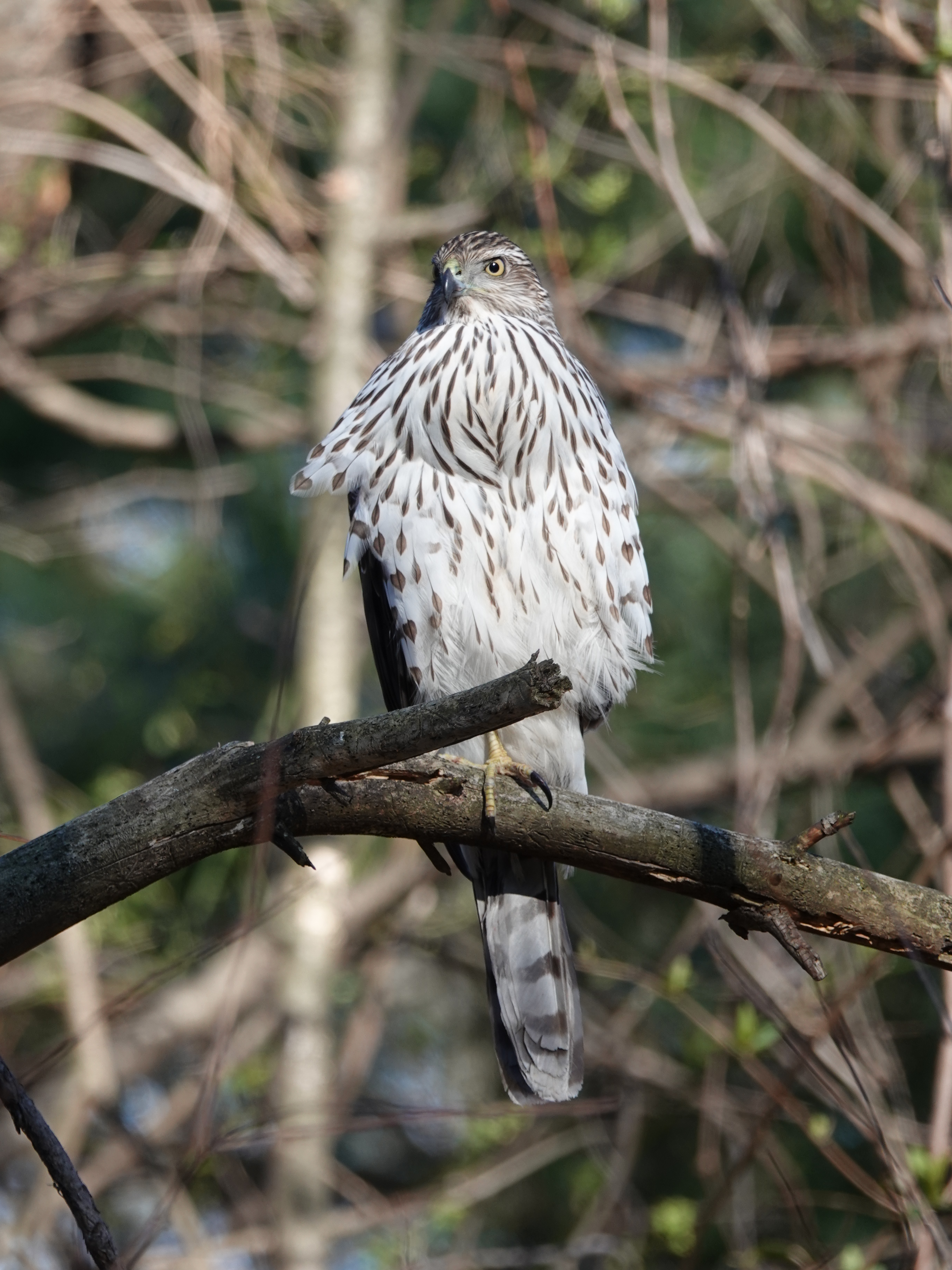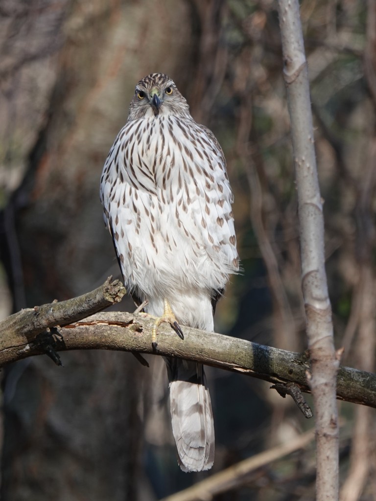 Cooper’s Hawk near the bird feeders. But, as you can see from that bulging crop, already full.