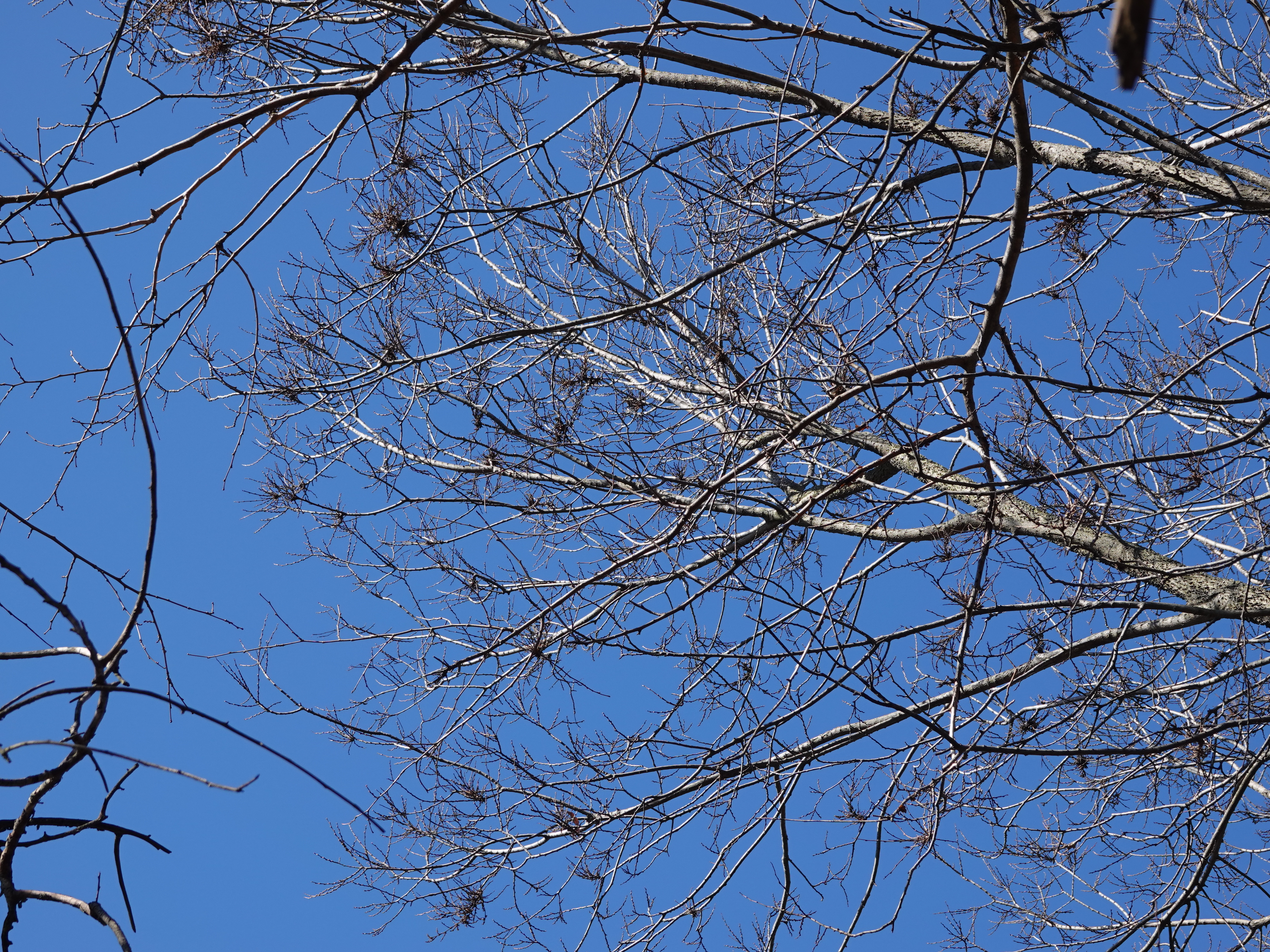 A slightly closer view of one fo the clumps. (They were all out of hand’s reach.) This is witches’ broom, a gall-like growth of branches sprouting in multiples. Hackberry is particularly susceptible. In this case, it seems to be caused by a combination of a fungus and a mite. I gather the mite carries the fungus…