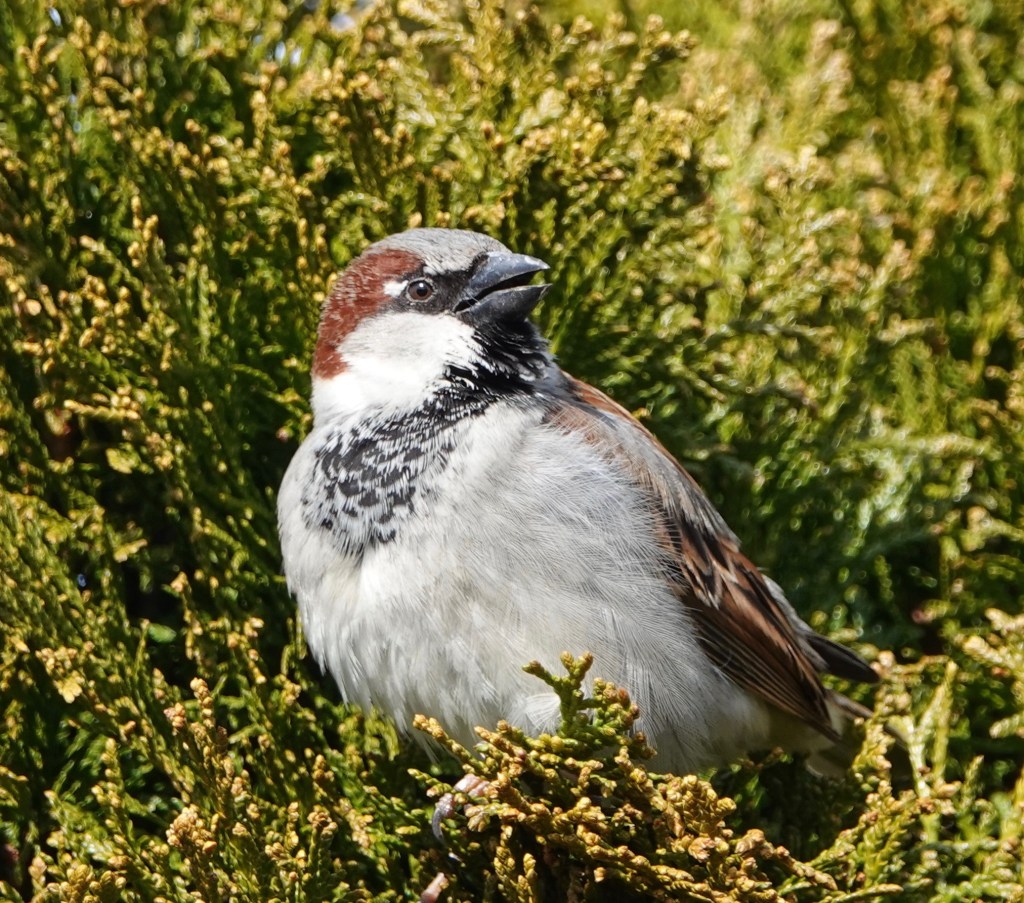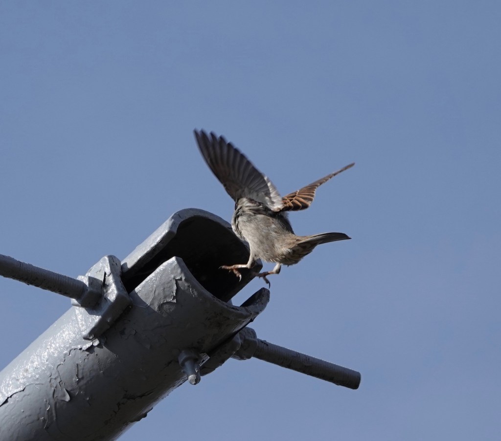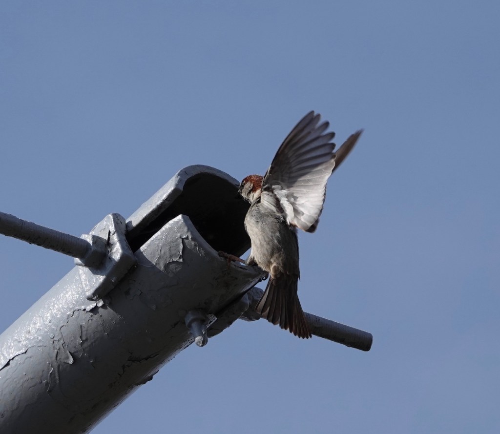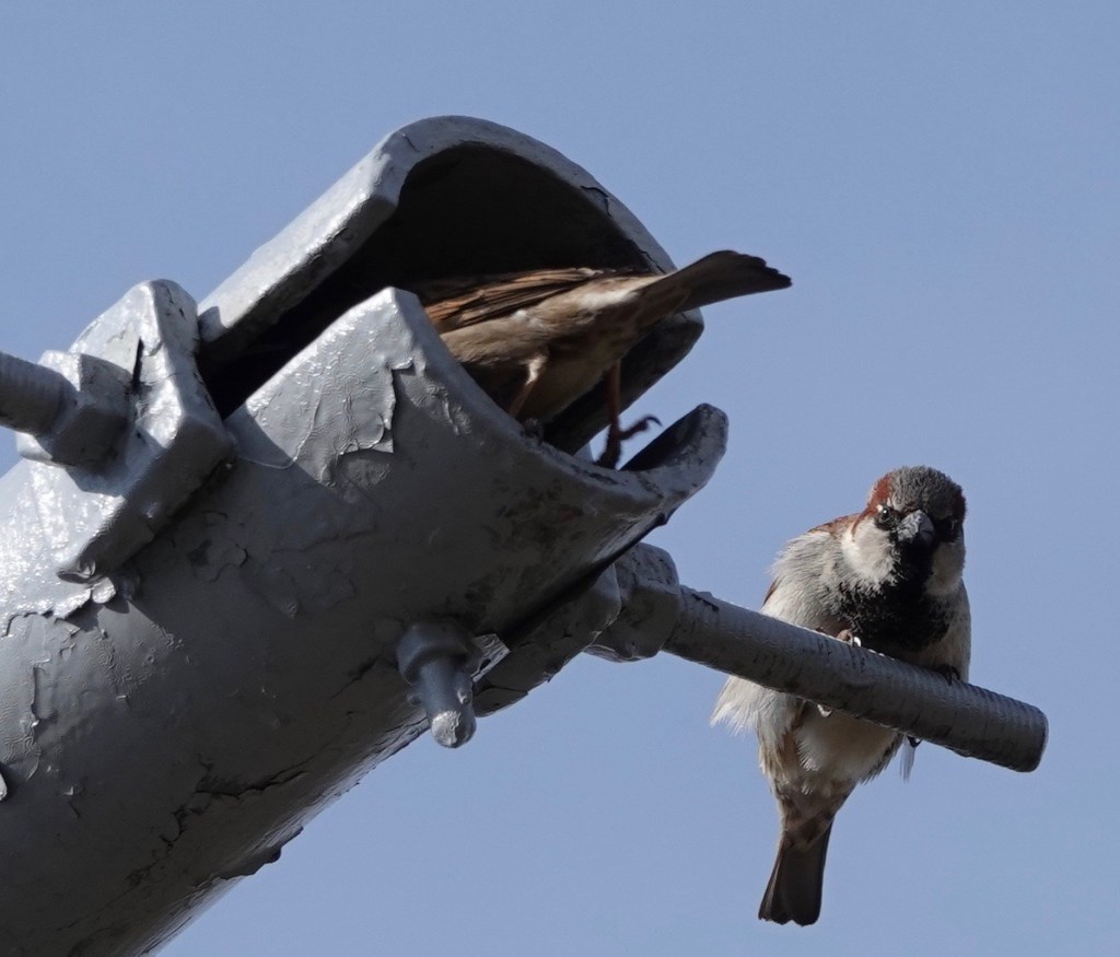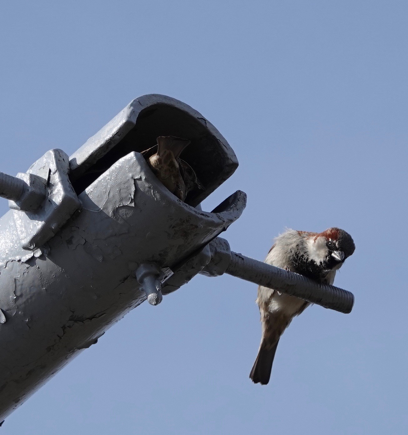 House Sparrows love these stop light support structures. Love them! There’s often a pair nesting in each end.