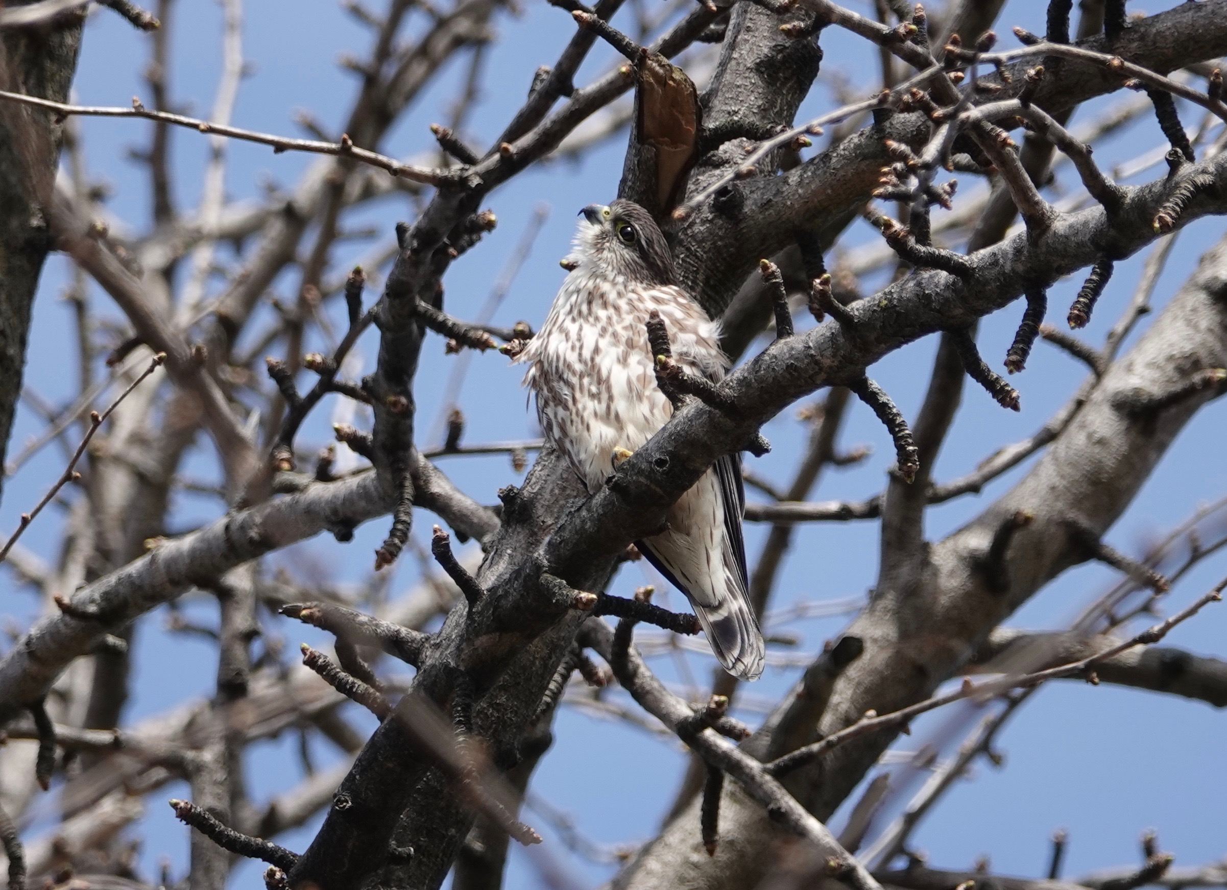 Merlins are known for perching a long time in the same place. (Born to physical-distance in a pandemic?) While I was there, an Eastern Phoebe landed at the top of this ginkgo tree. The Merlin eyed it. The Phoebe then moved on it, and so did I, but the falcon was still there when I left.