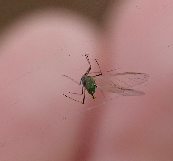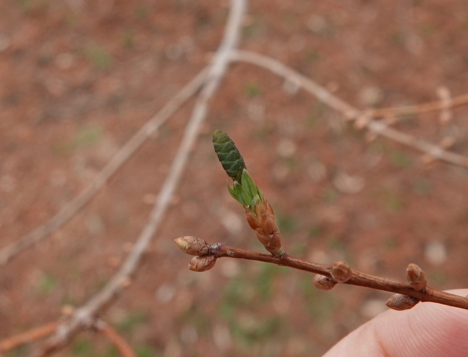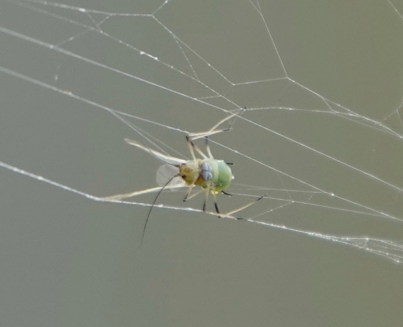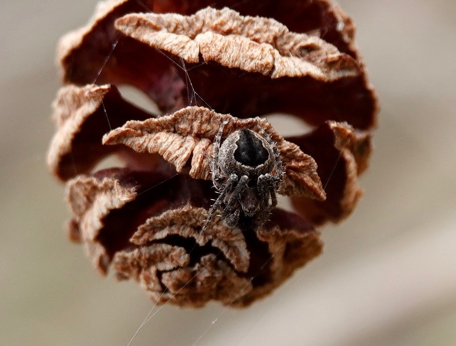 A small spider on a dawn redwood cone. The animal’s web was stretched across to another branch.