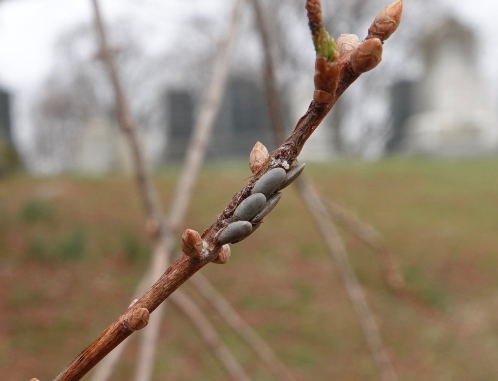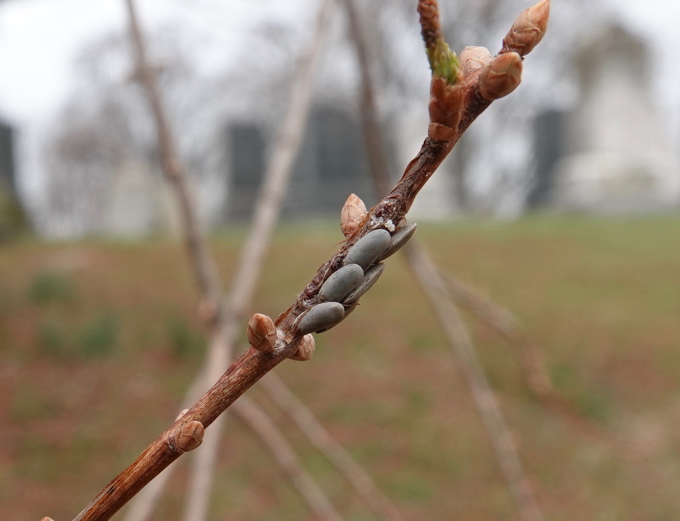 Here, for instance, on the same tree, are the eggs of a Microcentrum genus angle-winged katydid.