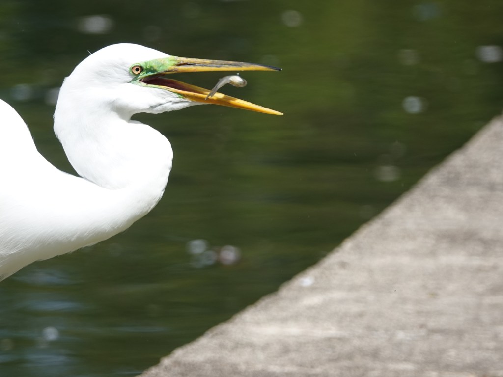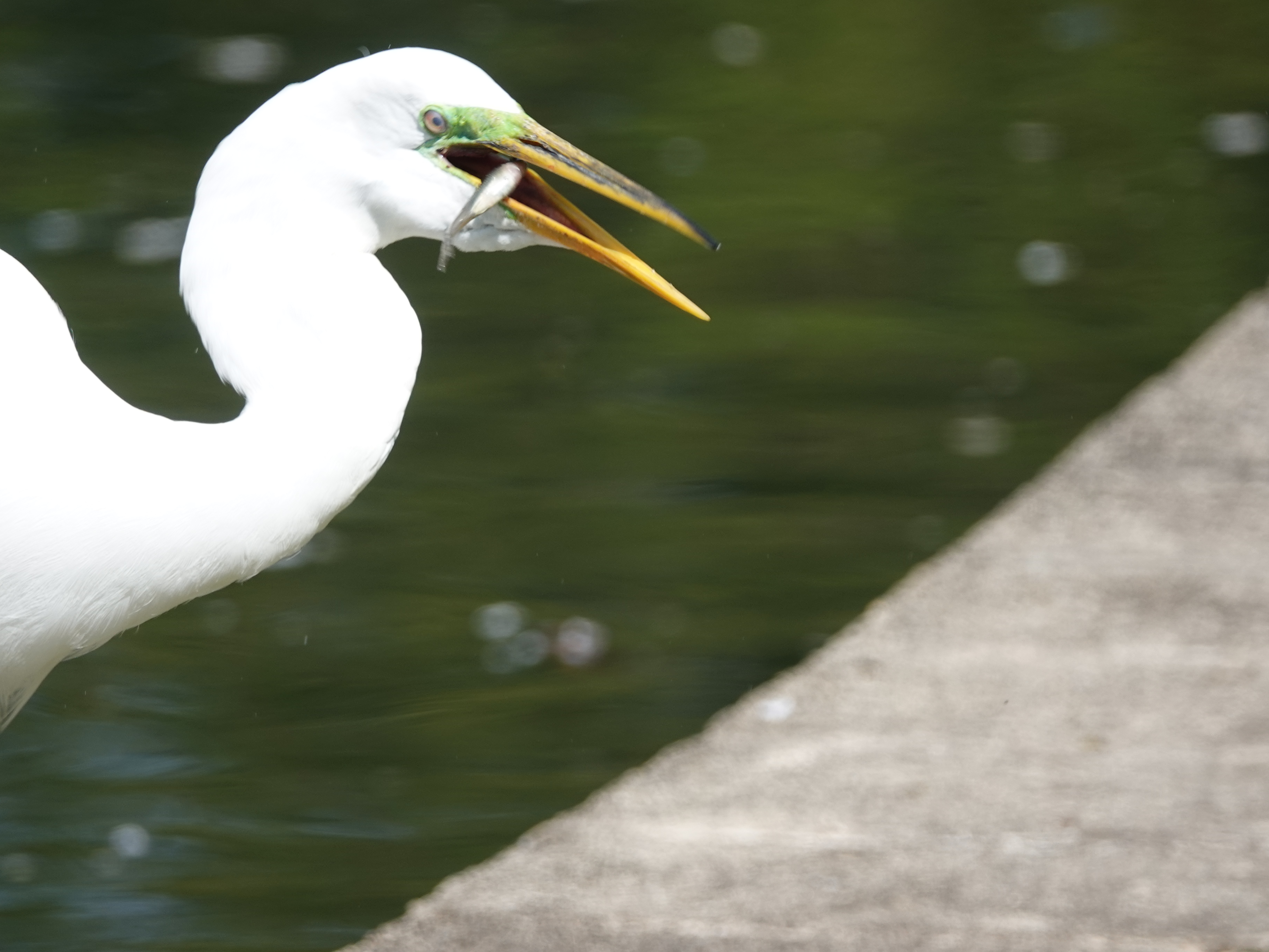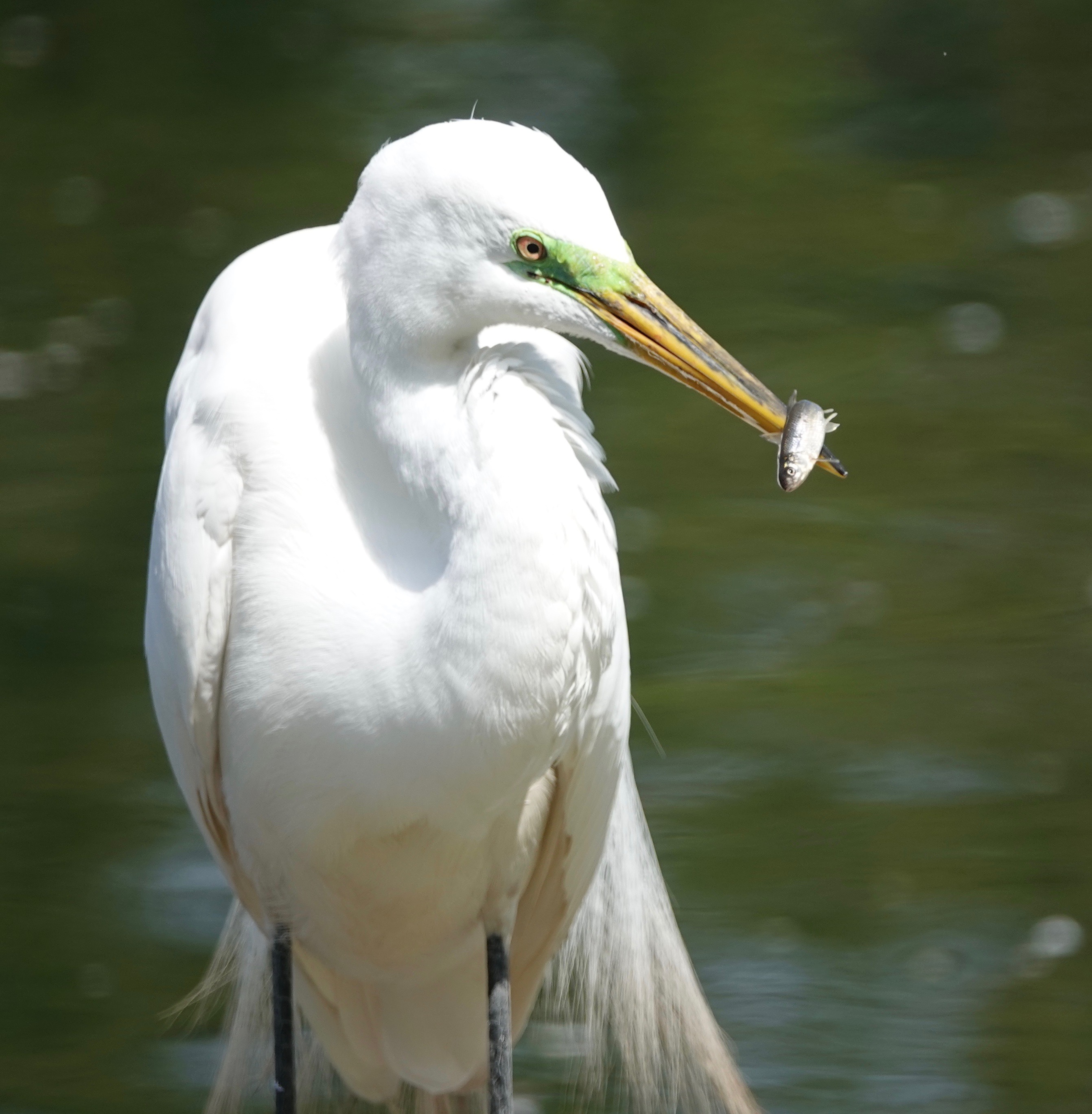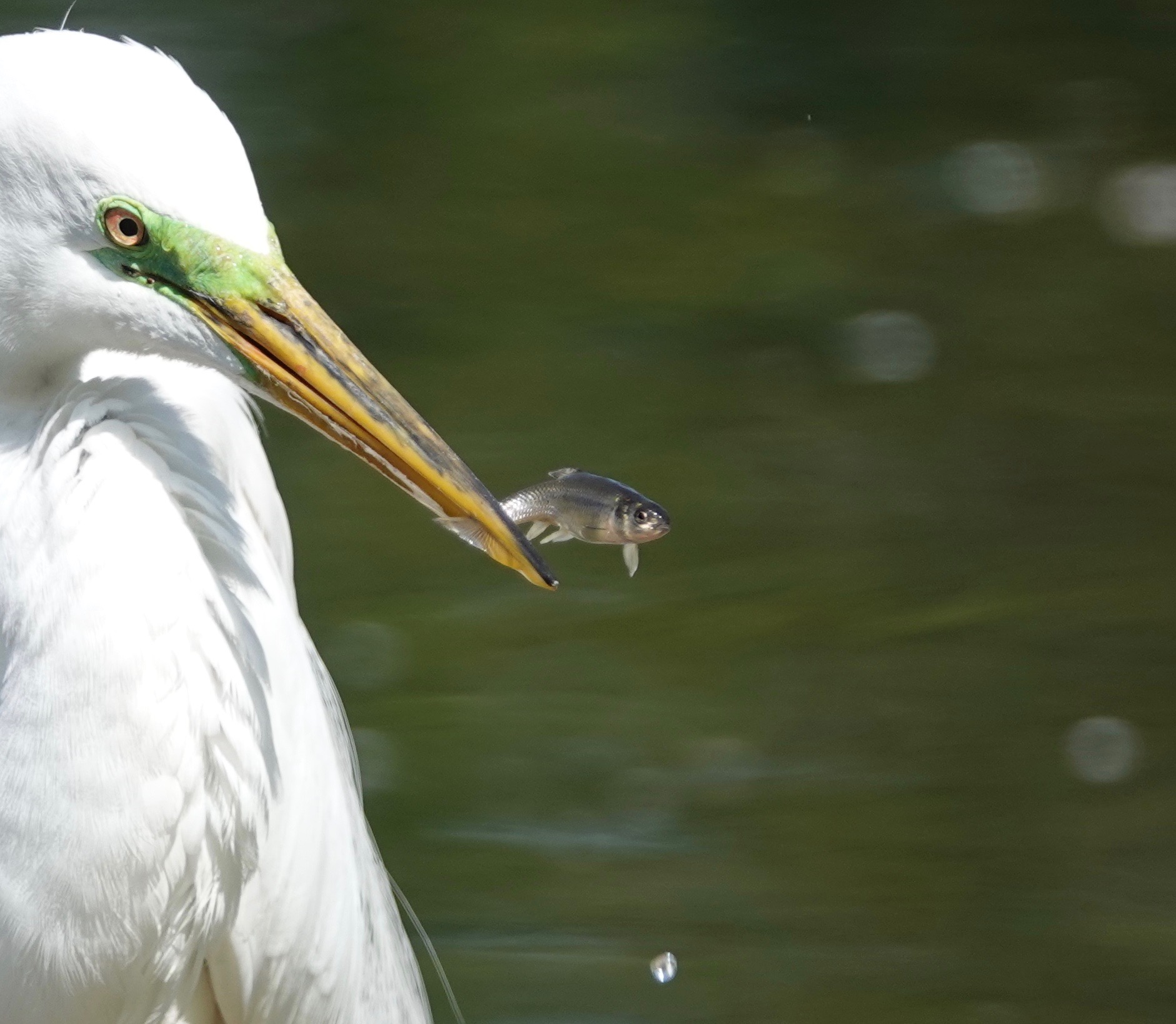 Fishes, actually, because this Great Egret was a remarkably effective hunter. Plucking them out of the water. This pond, by the way, has also been feeding the Belted Kingfisher who has been around since the fall.