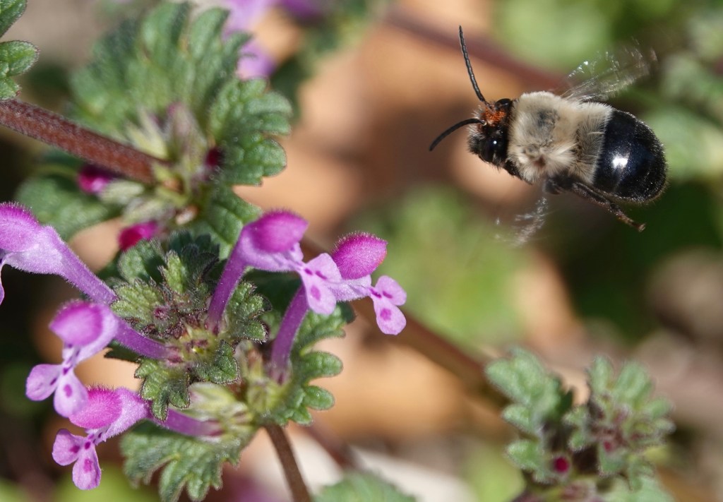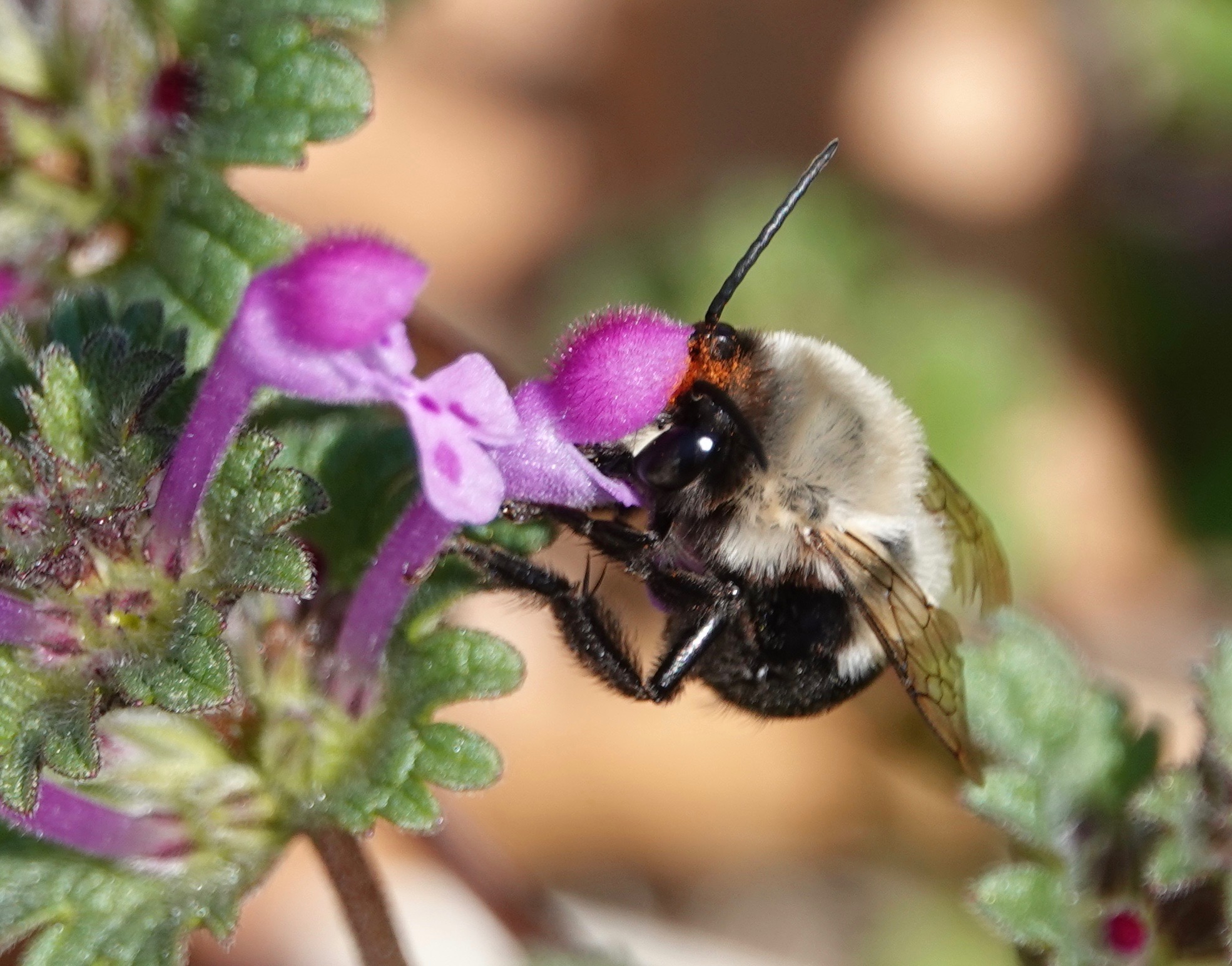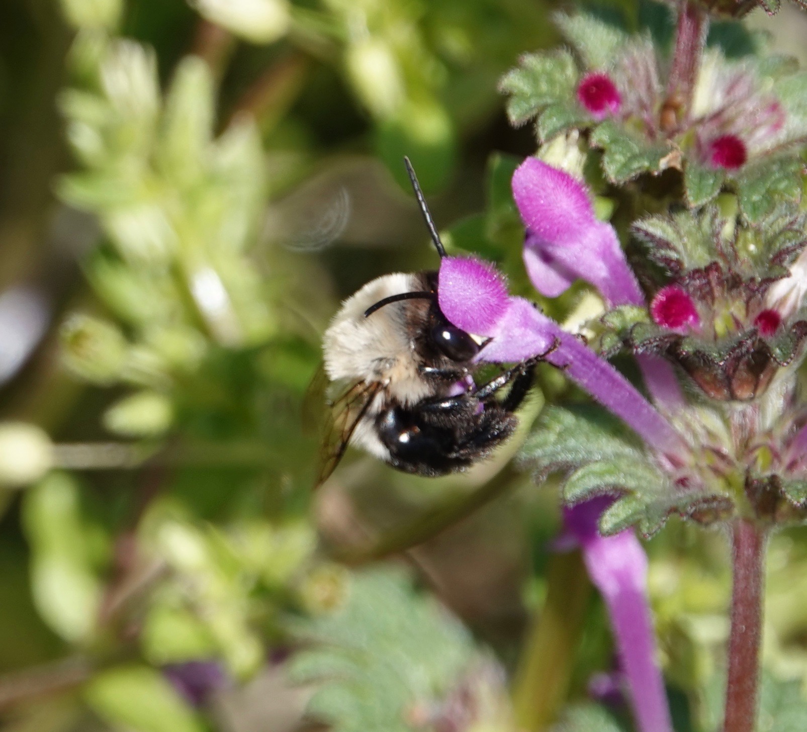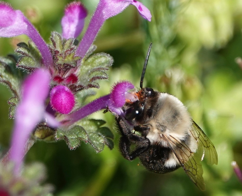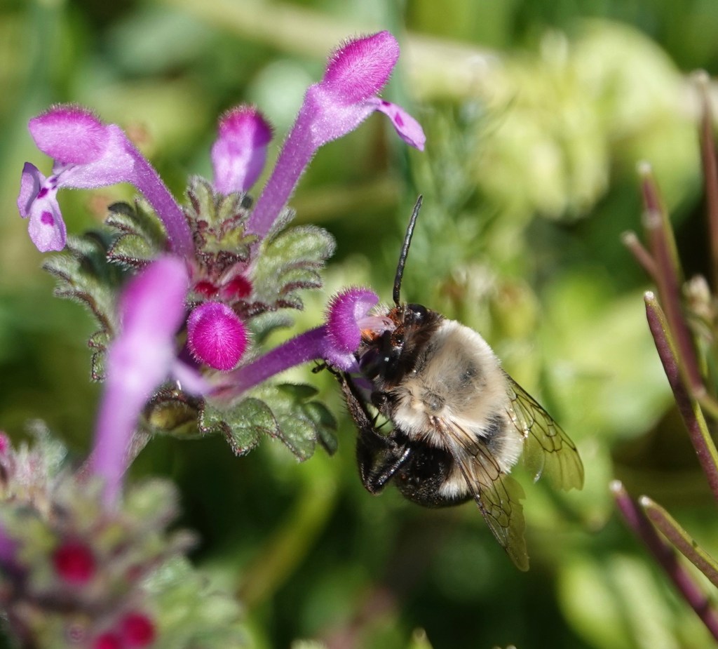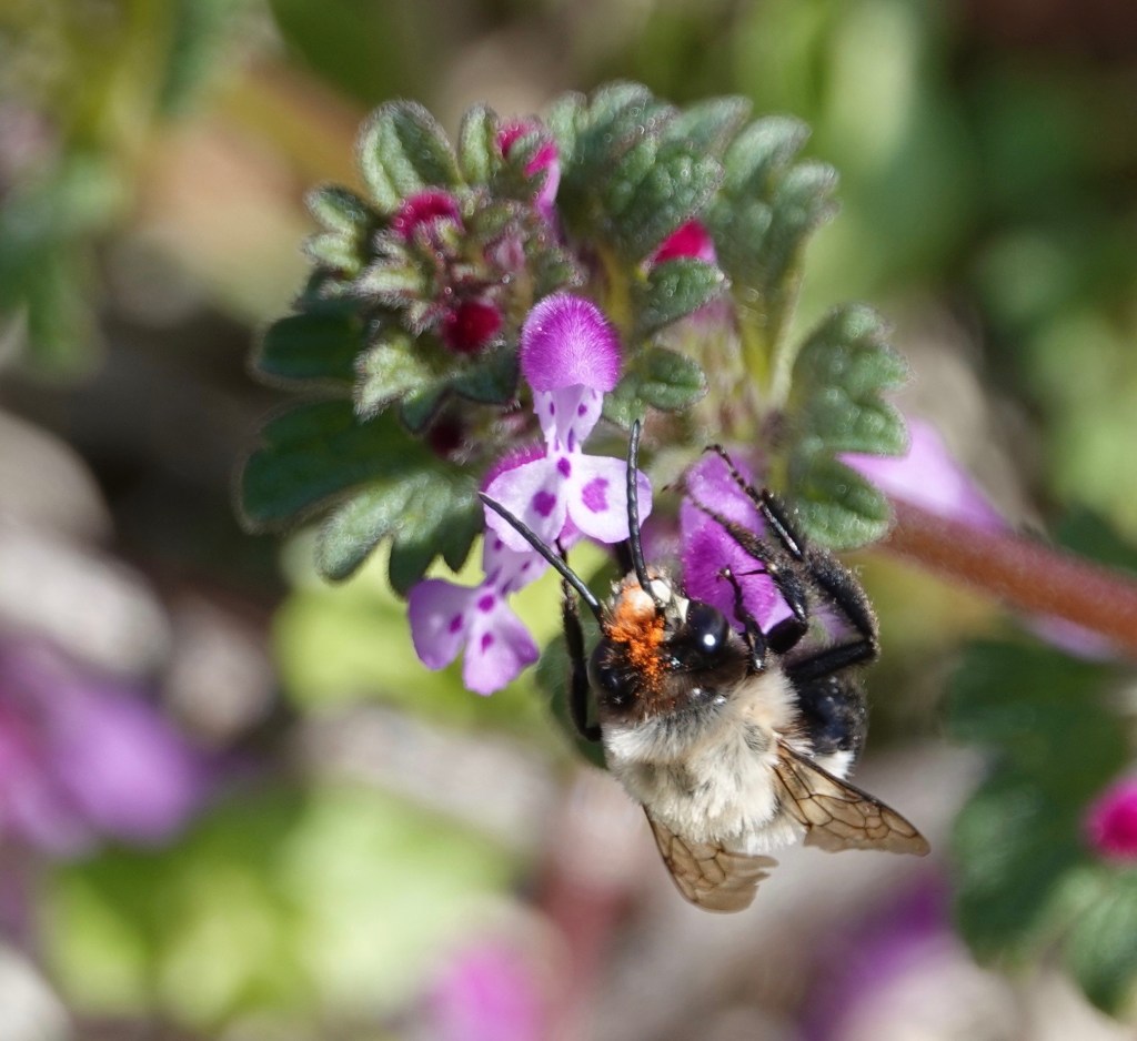Long tongue into the nectar, anther against the forehead. This Lamium isn’t letting the bee leave town without some pollen.