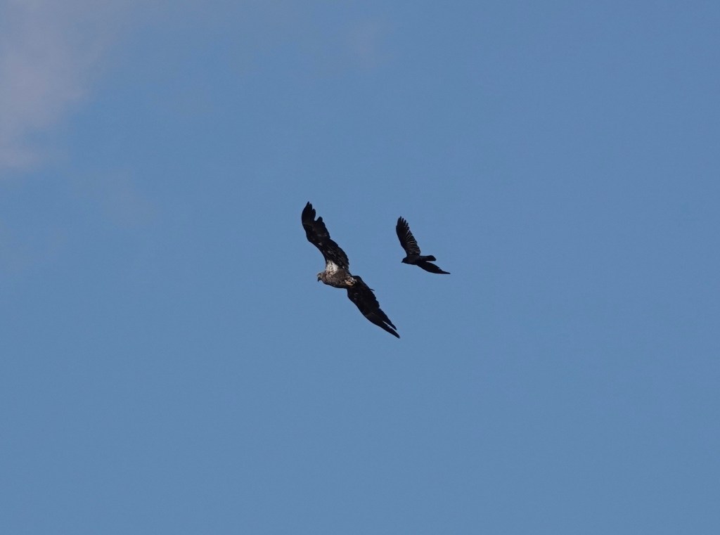 Last week, I saw a young (still without the white head and tail) eagle over the Sylvan Water, looking like it was coming in to go fishing in the pond. An American Crow set off the alarm and went after the much bigger bird. The two birds swirled a bit before disappearing from my sight. But then, at least one more crow starting yelling. The sound didn’t diminish, as you would expect if they were all flying further away.