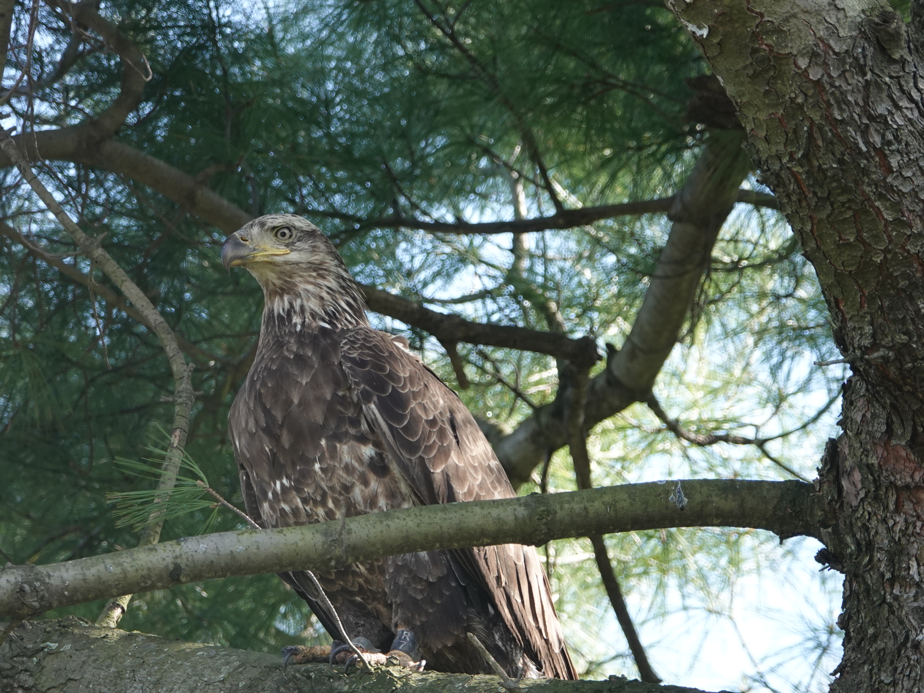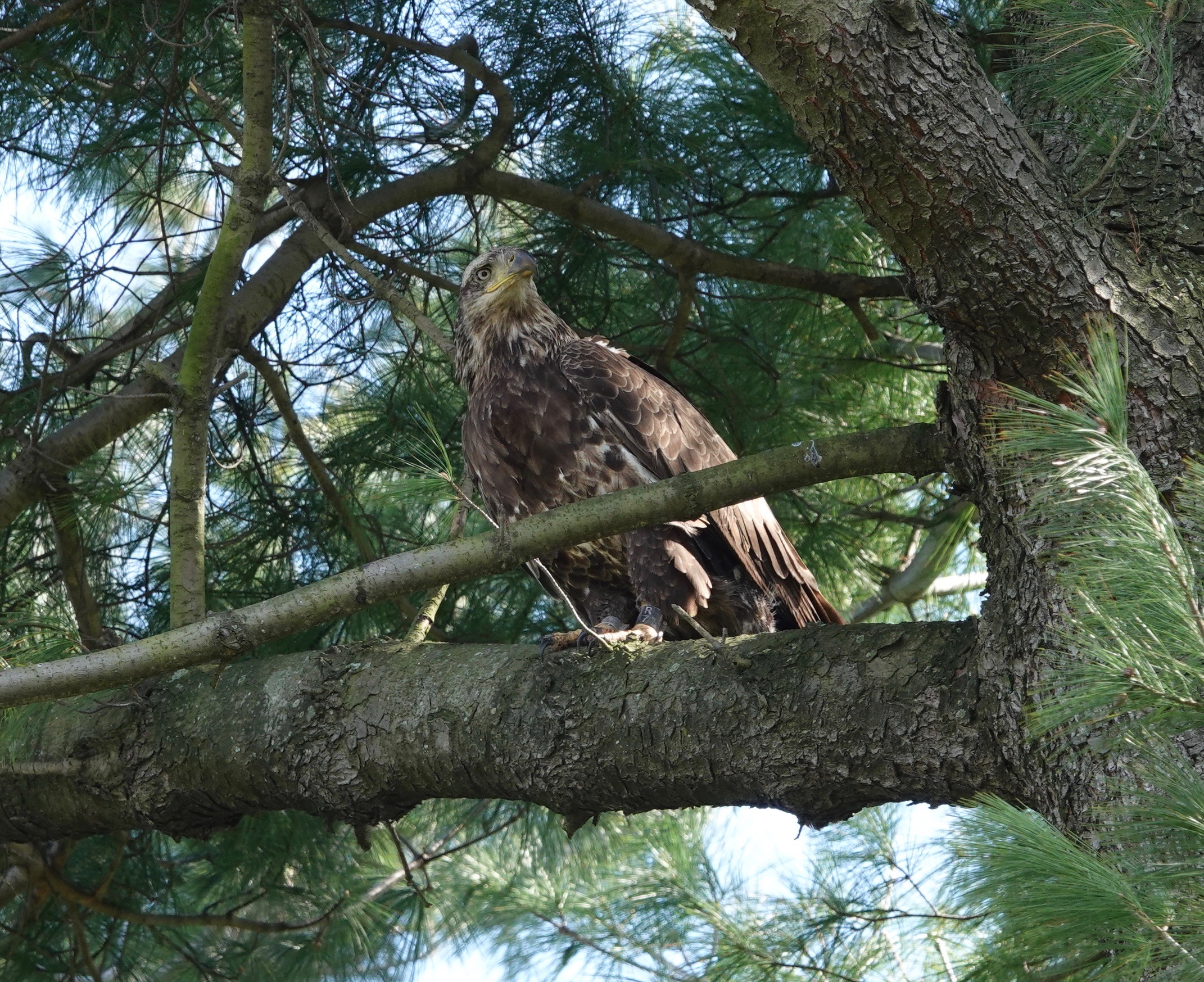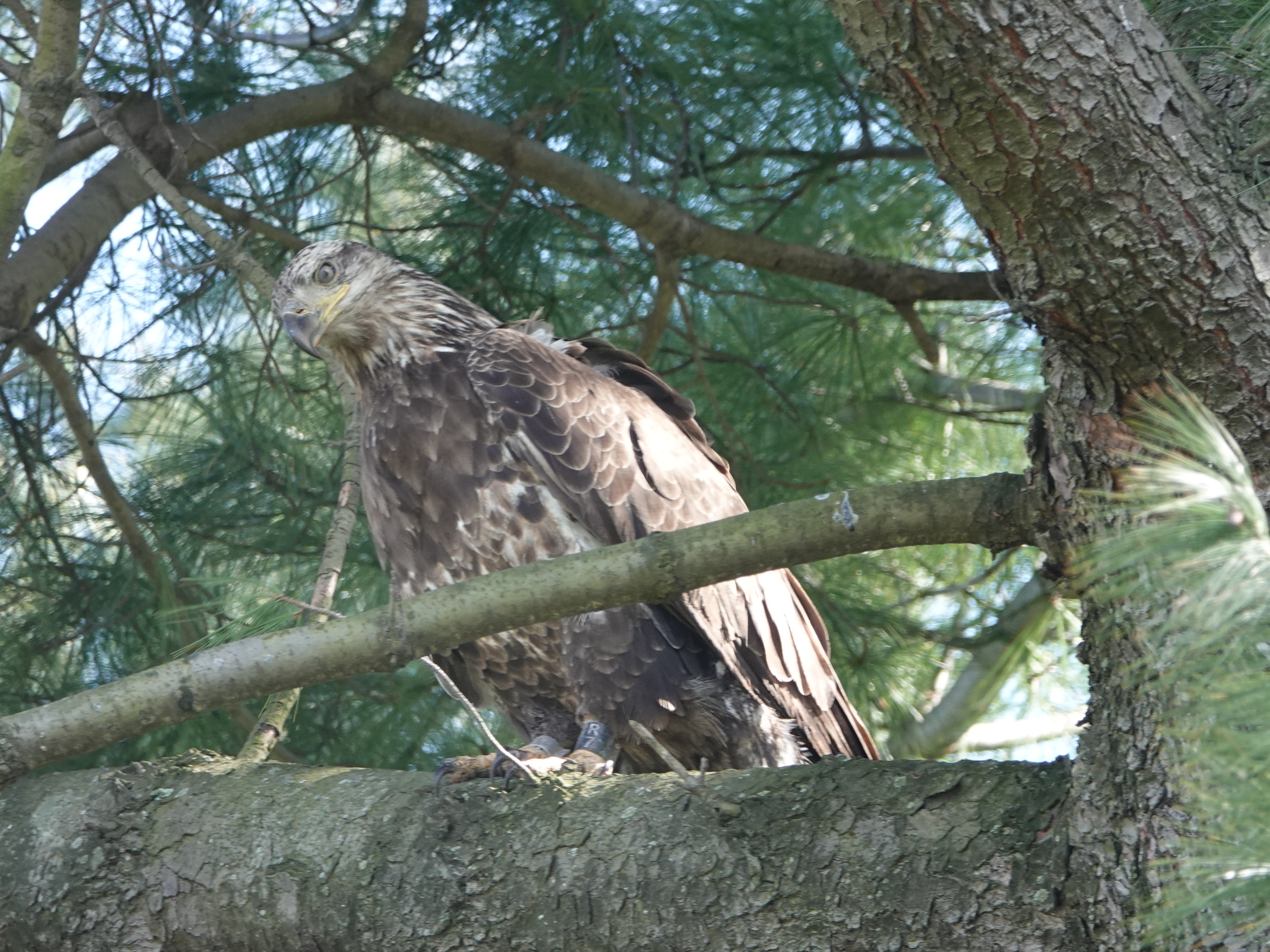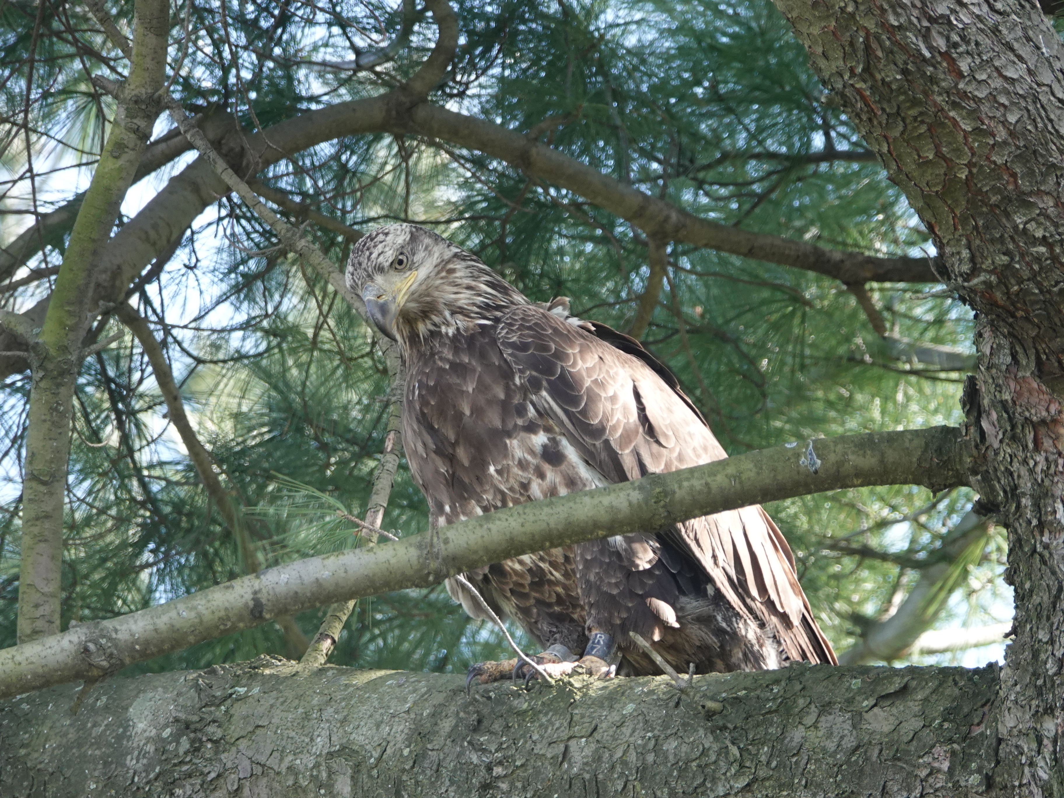 A young eagle had been spotted few times by other Green-Wood observers from the beginning of the month. One person got a photograph of the bird in a tree with a fish. The bird was banded, with a silver federal band on the bird’s right leg and one that looked blue on the left. Individual states band on the left leg; these are color-coded and easier to read from a distance. But I couldn’t see the characters on those pictures, put up on iNaturalist.