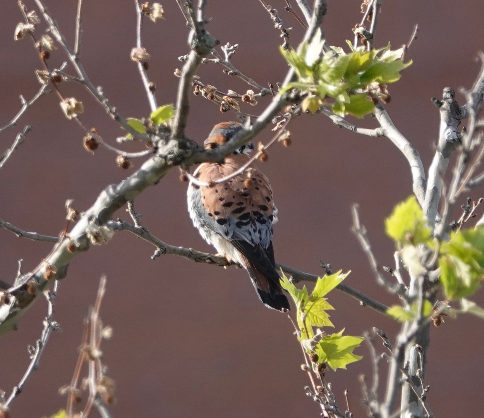 Two years ago, this London plane tree had a dead, vertical branch on it that was a regular American Kestrel perch. It broke off in a storm in November, 2018, and, ever since, this tree has not been as blessed as a place to see the locals. But yesterday evening, the male was preening here.