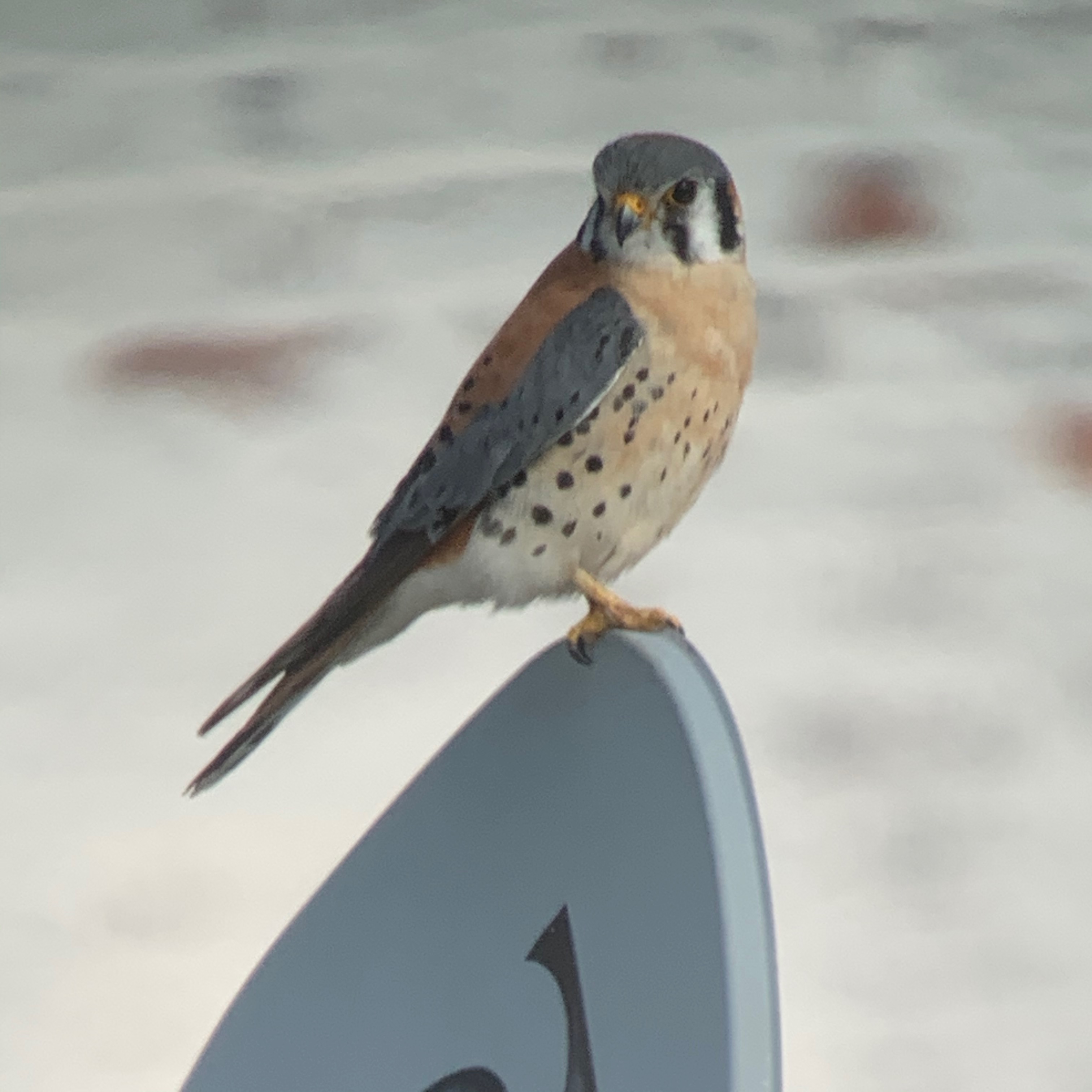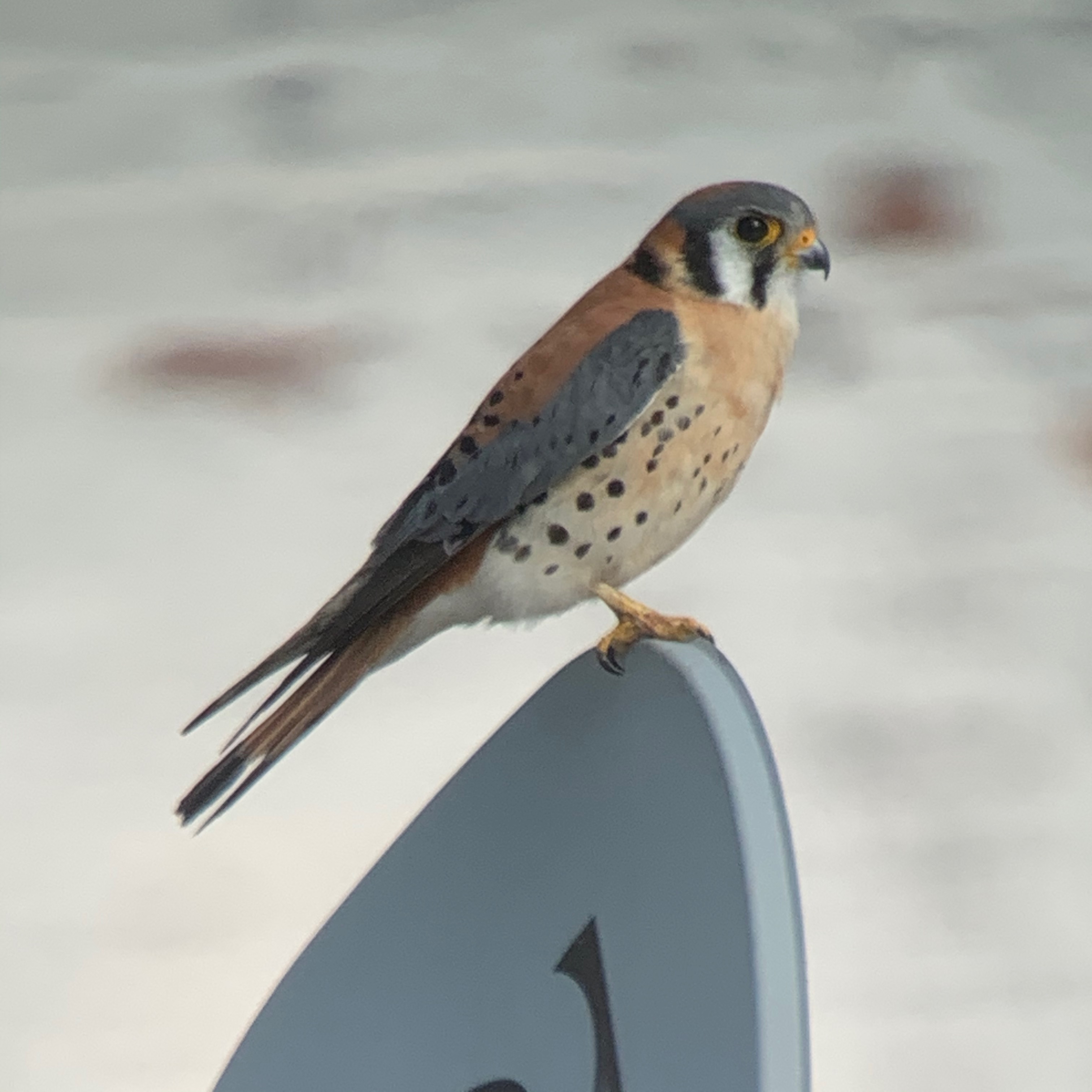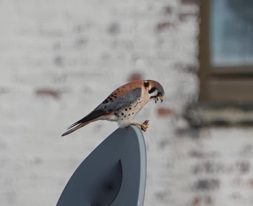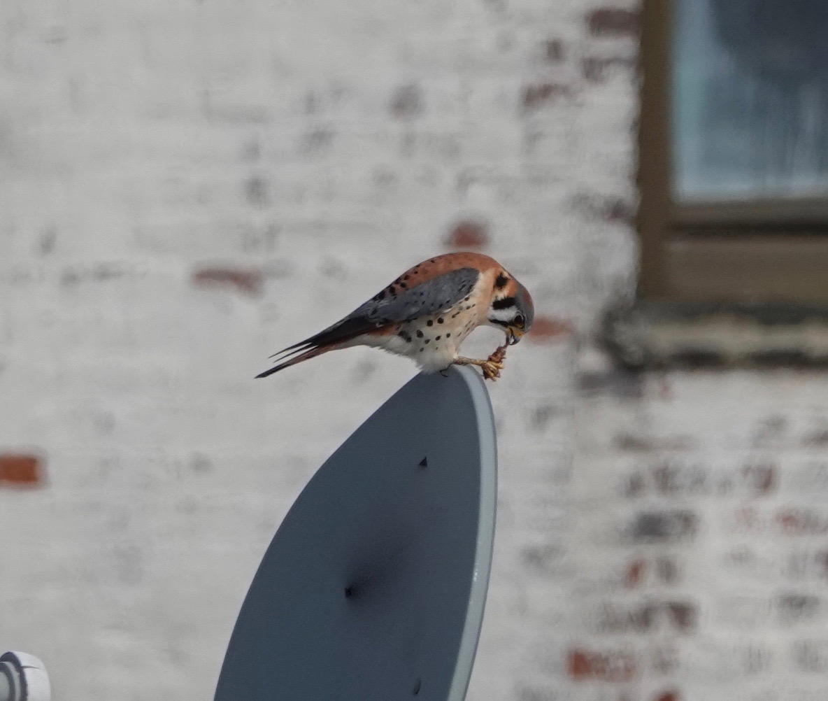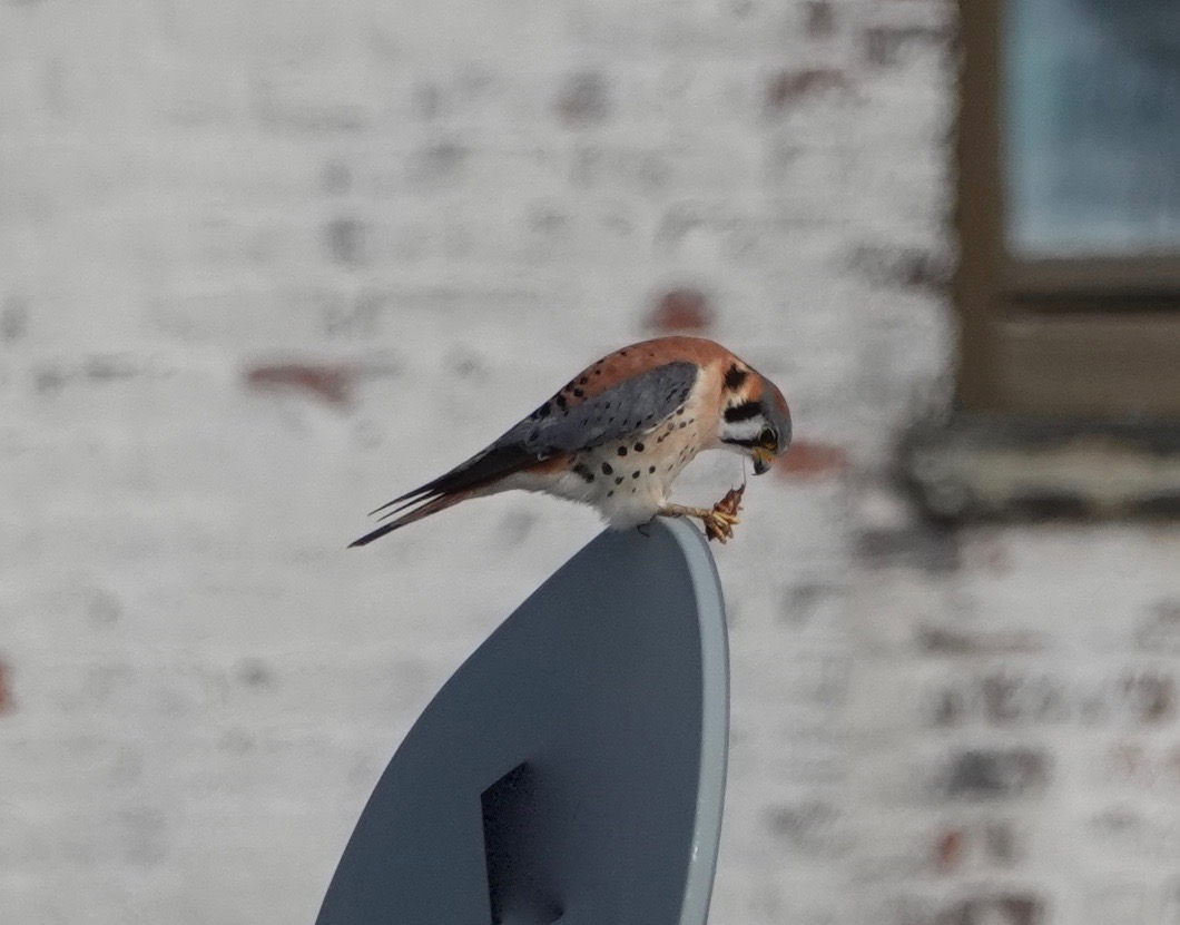 The local male American Kestrel. He’s working like a dog now that there must be nestlings in the hole in the cornice where the nest is.