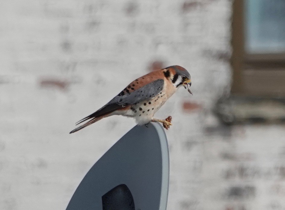 From the size and color, I’d say roaches or waterbugs that he was grabbing off a couple of rooftops across the street. He used a pair of dish antennae as perches to eat.