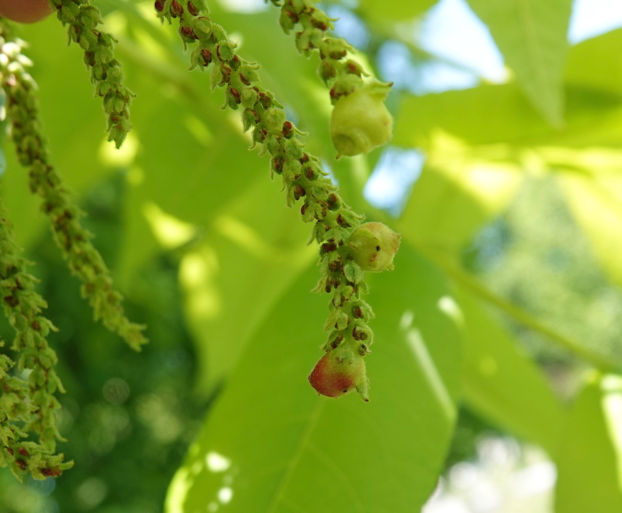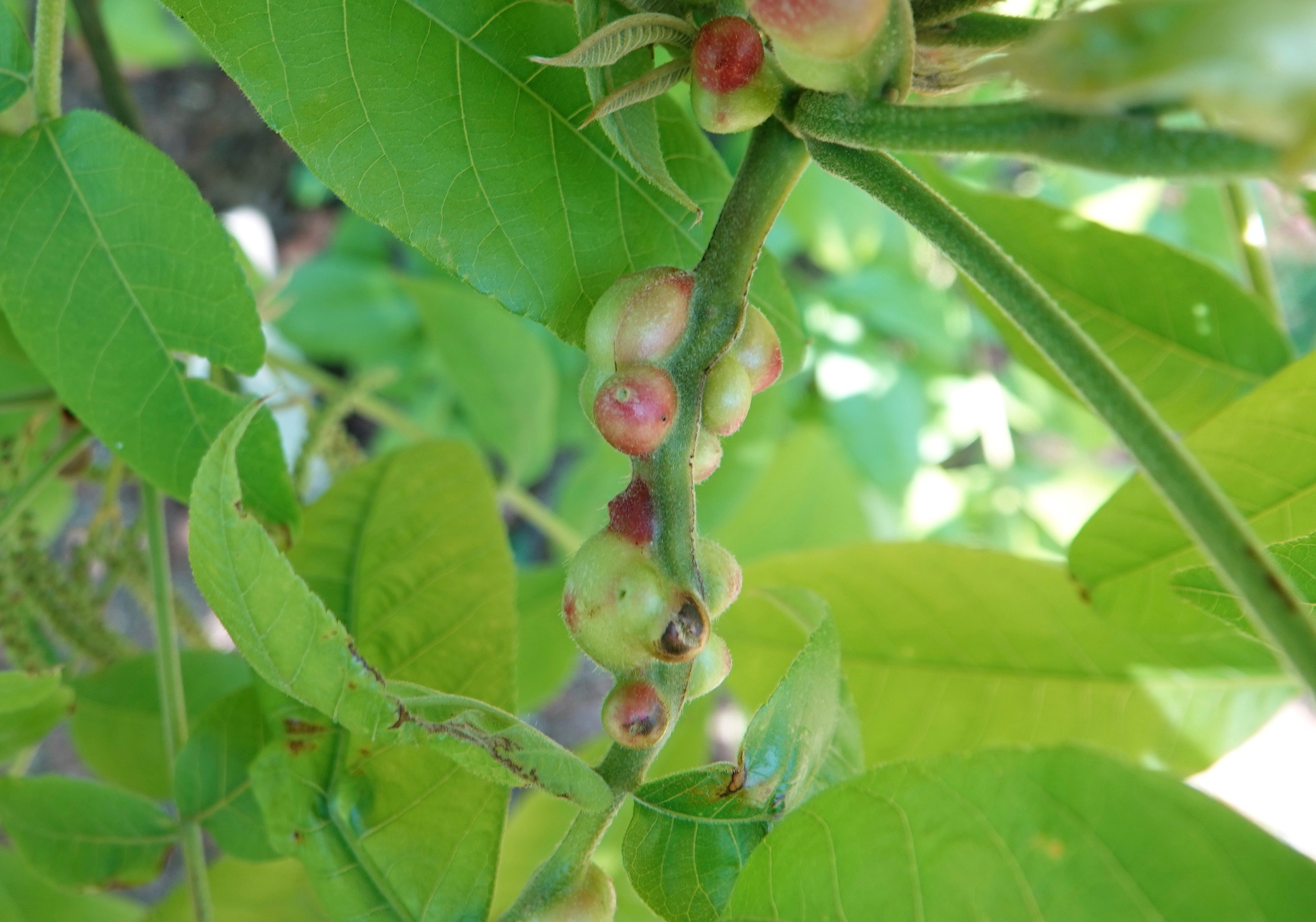 Wasps are the best known gall-agitators, but mites and aphids do it as well. “It” being hijacking a plant to grow around them, feeding and protecting them (somewhat: there are parasites of gall-makers and parasites of the parasites of gall-makers). These are the galls of Phylloxera genus aphids on mockernut hickory petioles and flowers. There are several species of these. Is this the same one? Like oaks, hickories are host to a… well, host of gall-forcing species.