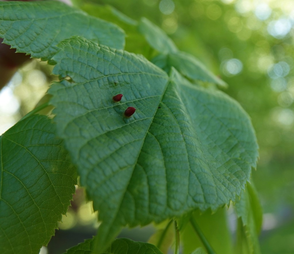 Red Nail Gall Mite (Eriophyes tiliae) on on linden leaf (Tilia x europaea).