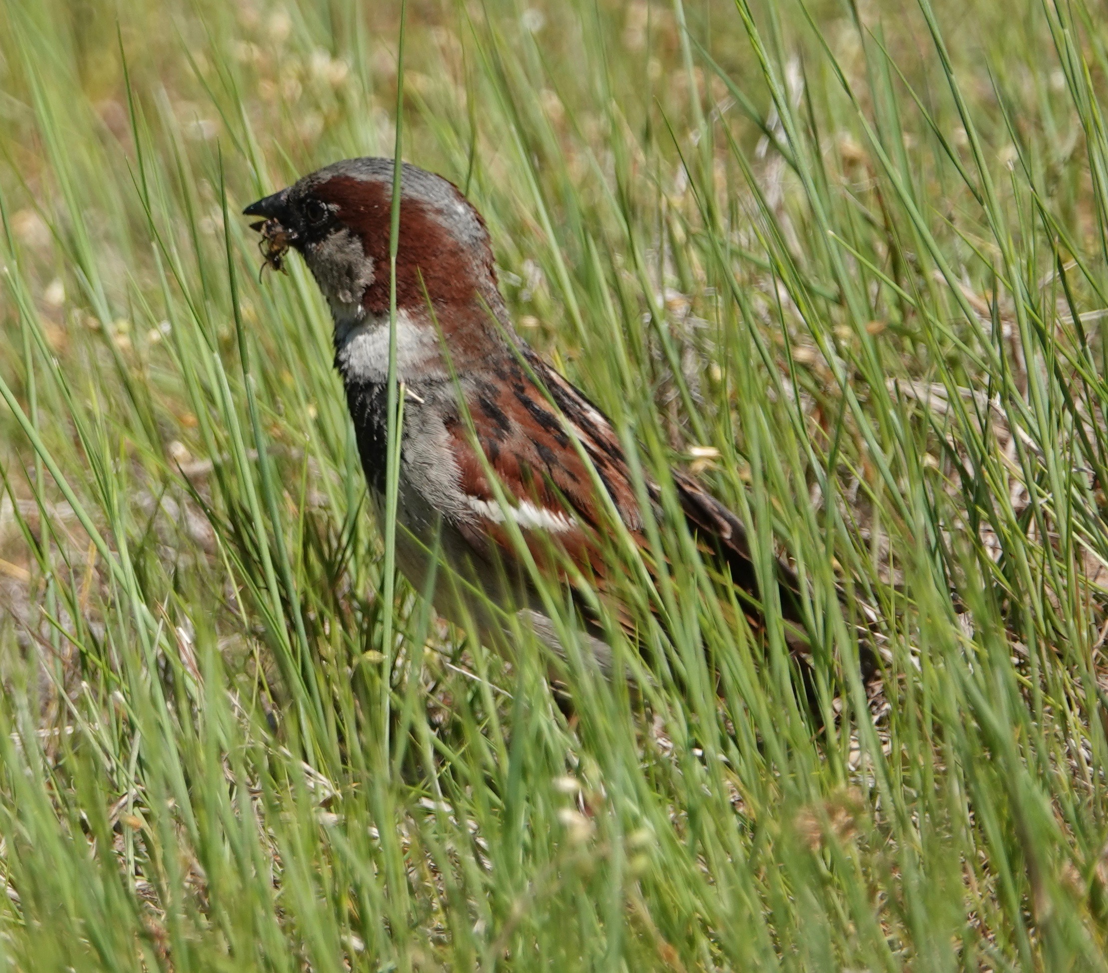 This male House Sparrow kept swooping in to grab bees. Possible feeding these Rufus-backed Cellophane bees to his young?