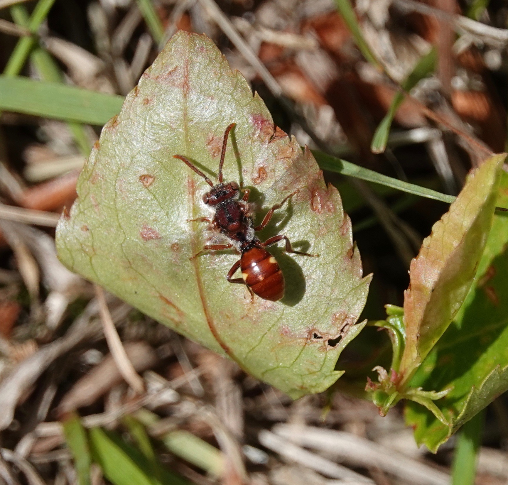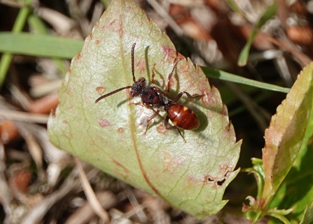 In the same patch, I found these Nomada genus cuckoo bees. Suspect they were looking to lay their eggs inside their cellophane bee host’s nests. First time I’ve ever seen these. Turns out the taxonomy of this genus is confusing. Genus level is the best even the bee mavens of iNaturalist can get to with a picture. They’re smaller than their honeybee-sized hosts.